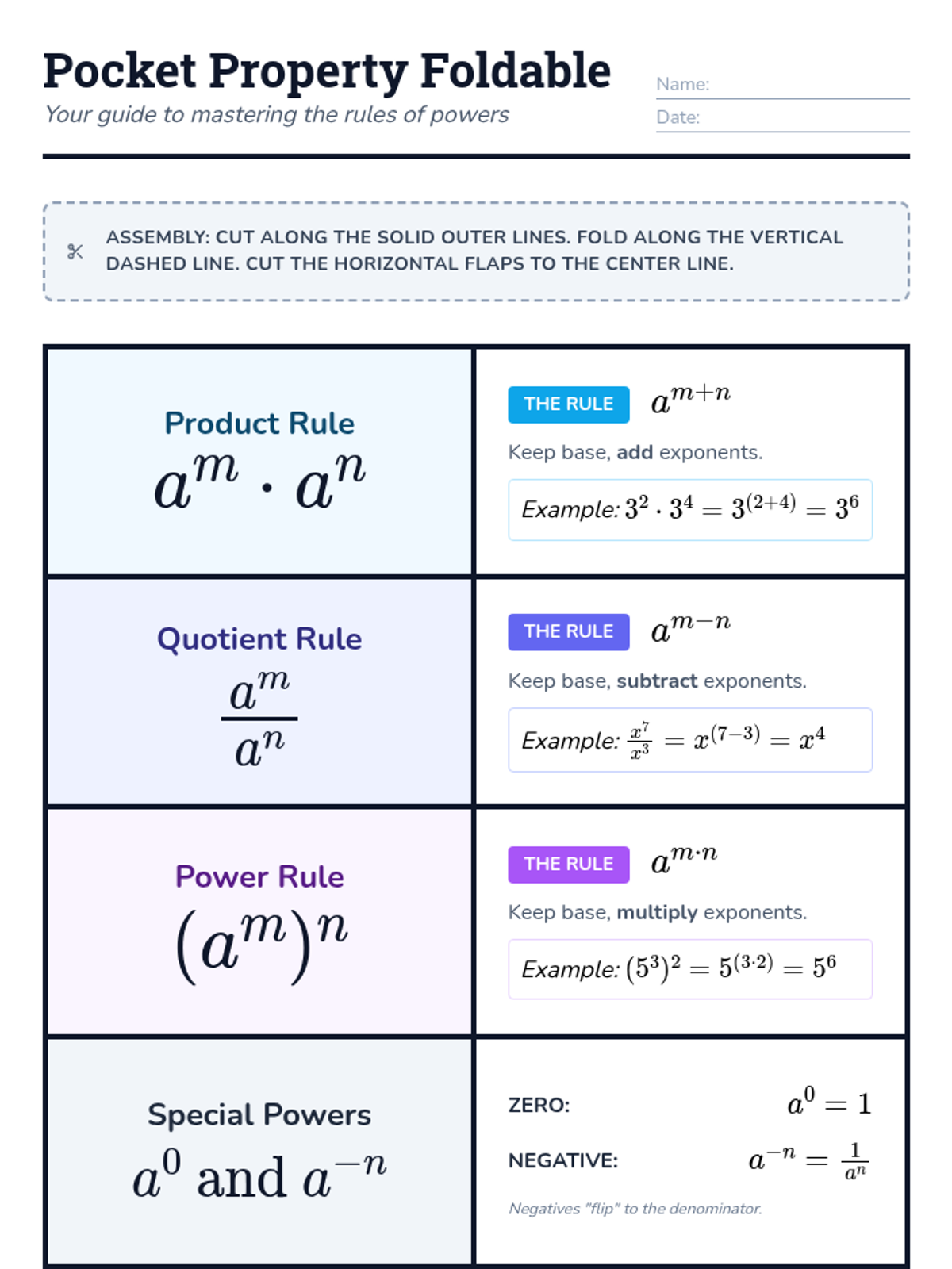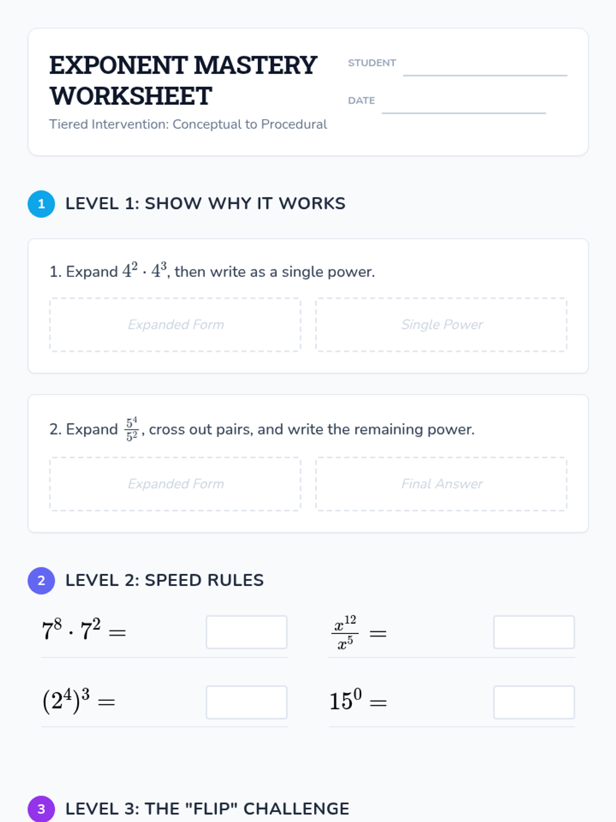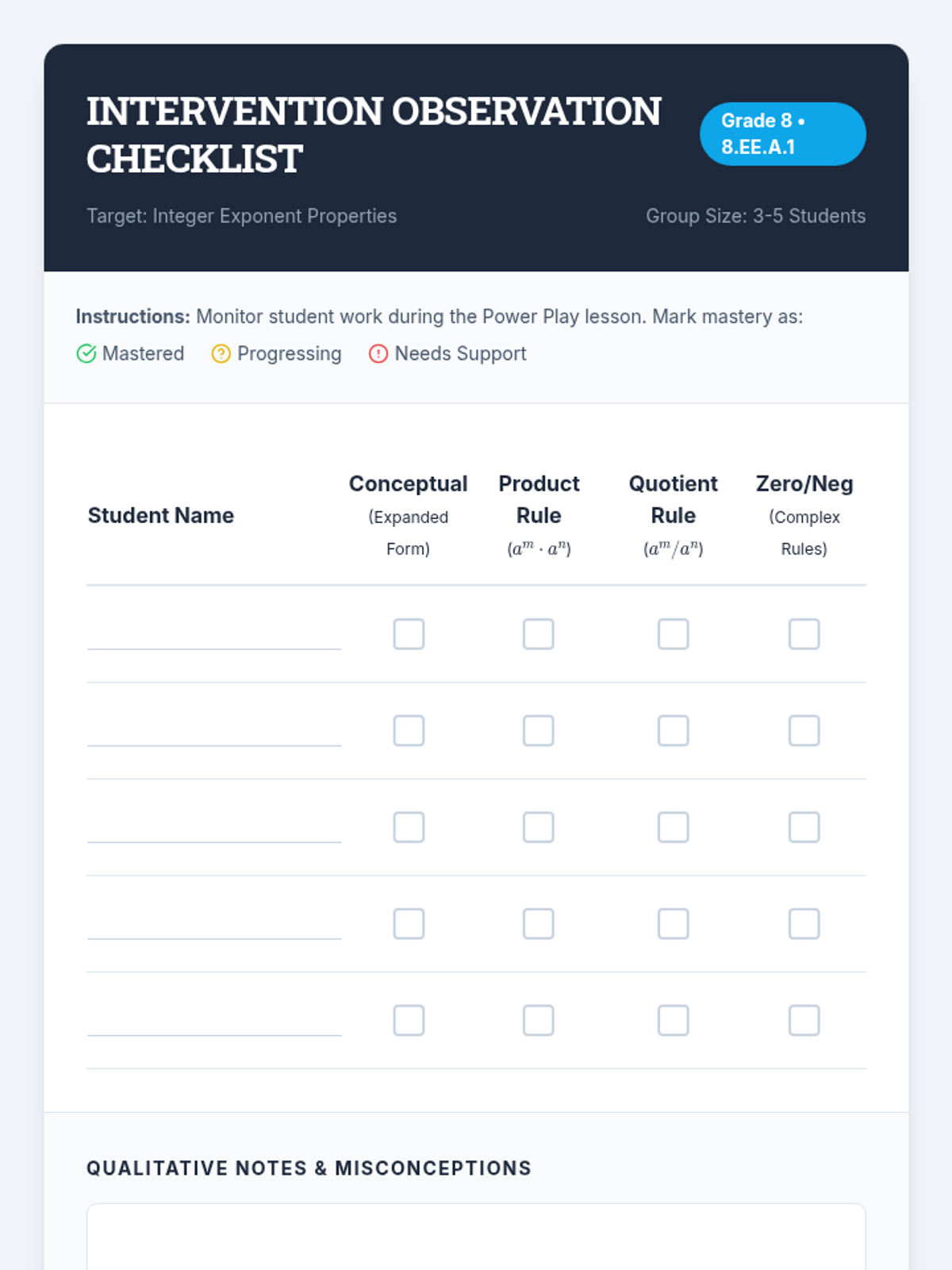 A Tier 2 intervention sequence focused on mastering integer exponent rules through pattern discovery, expanded form visualization, and scaffolded practice for Grade 8 students.
