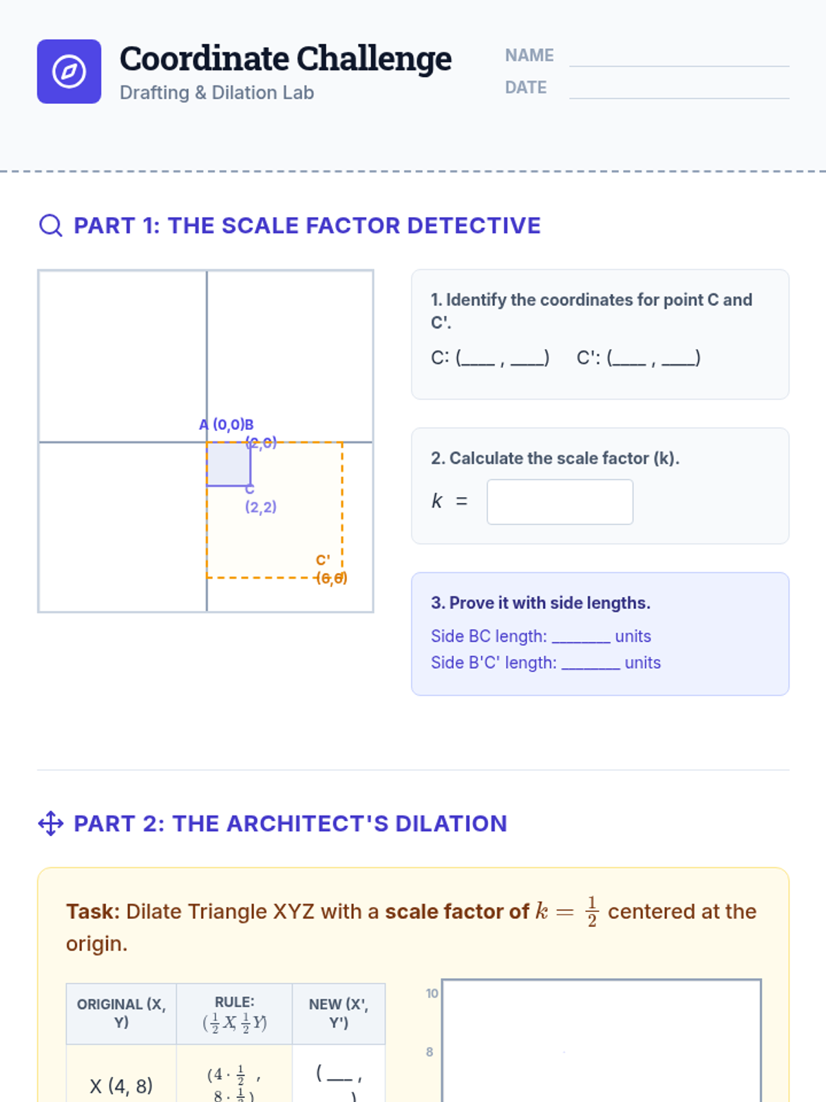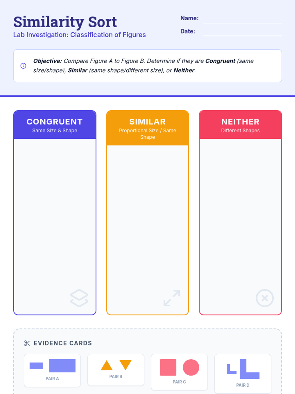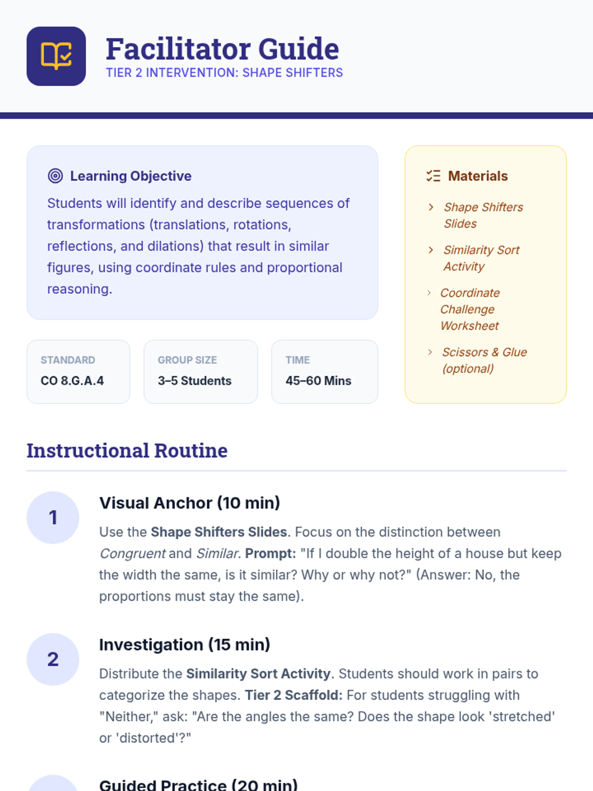 A Tier 2 small group intervention focused on similarity and transformation sequences. Students explore dilation, proportional reasoning, and coordinate-based transformations to understand how shapes relate across the plane.