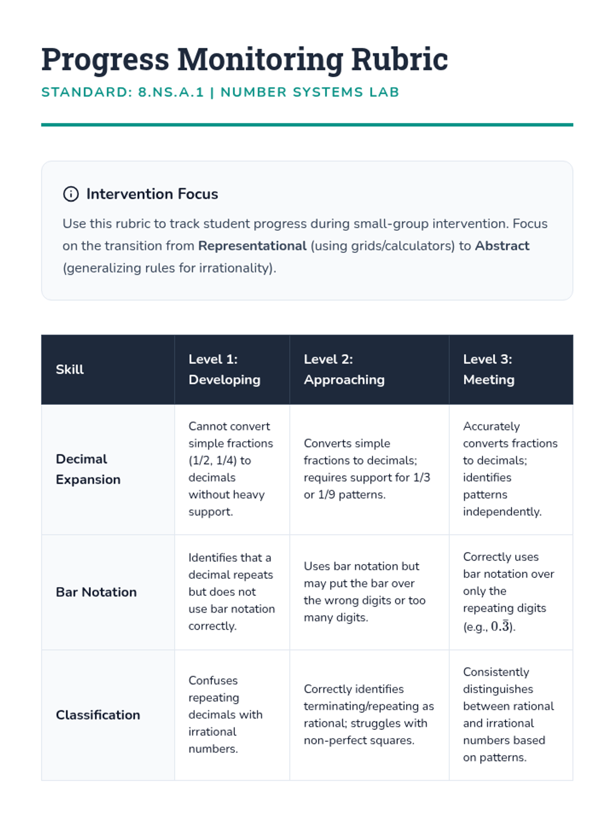 A specialized intervention sequence focused on the Number System for Grade 8, specifically identifying rational and irrational numbers through their decimal expansions and converting between forms.