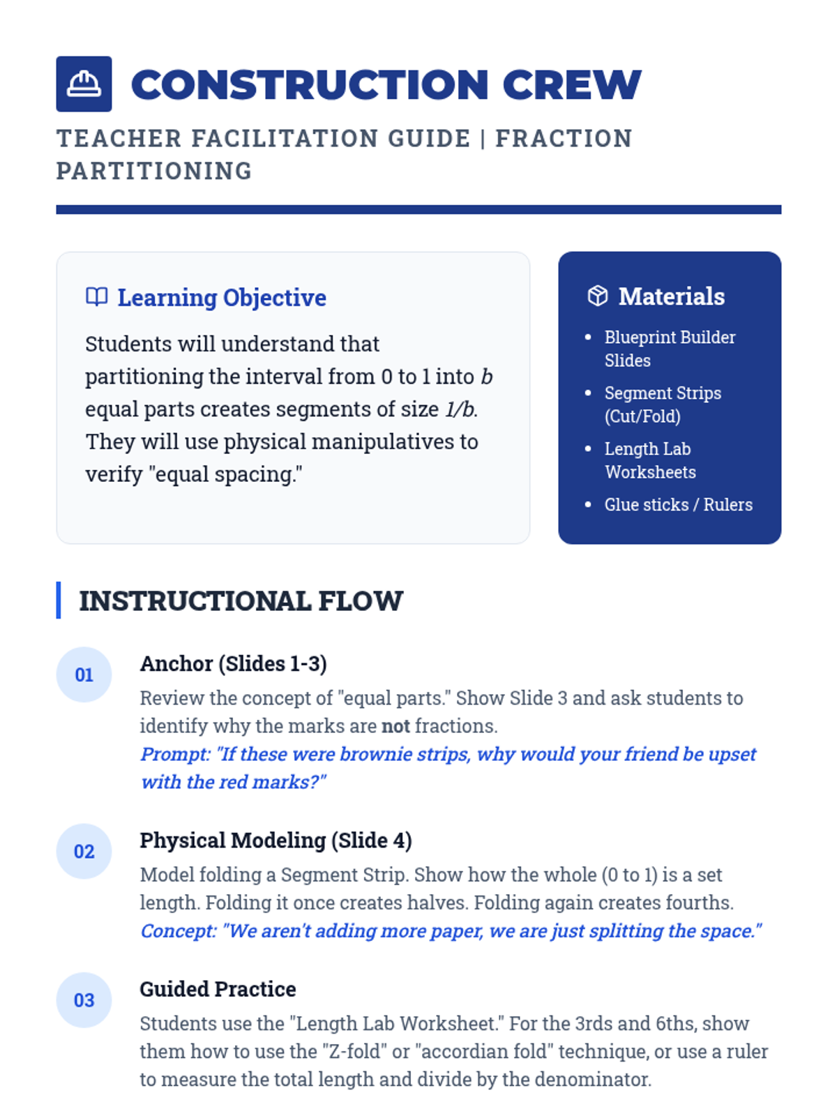 A comprehensive 7-lesson intervention sequence designed to build conceptual fraction understanding through visual models, number lines, and scaffolded practice. The sequence moves from basic area models to adding and subtracting with unlike denominators, prioritizing 'why' over 'how'.