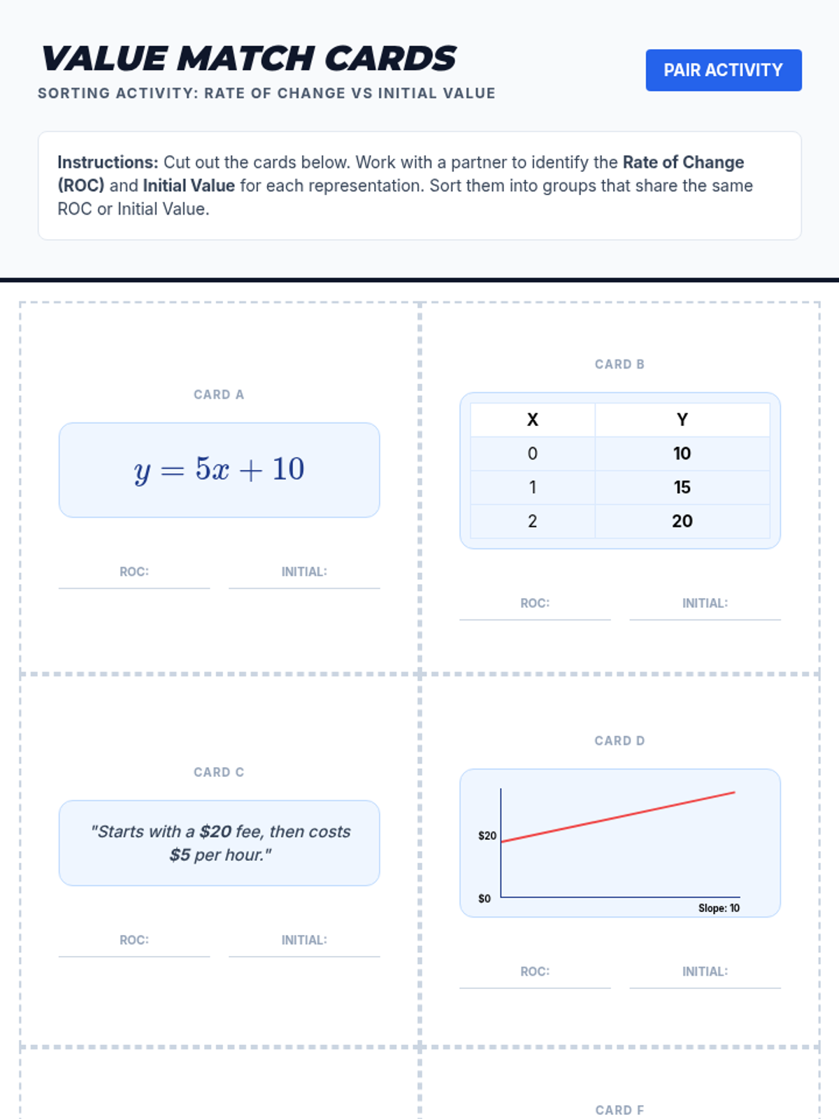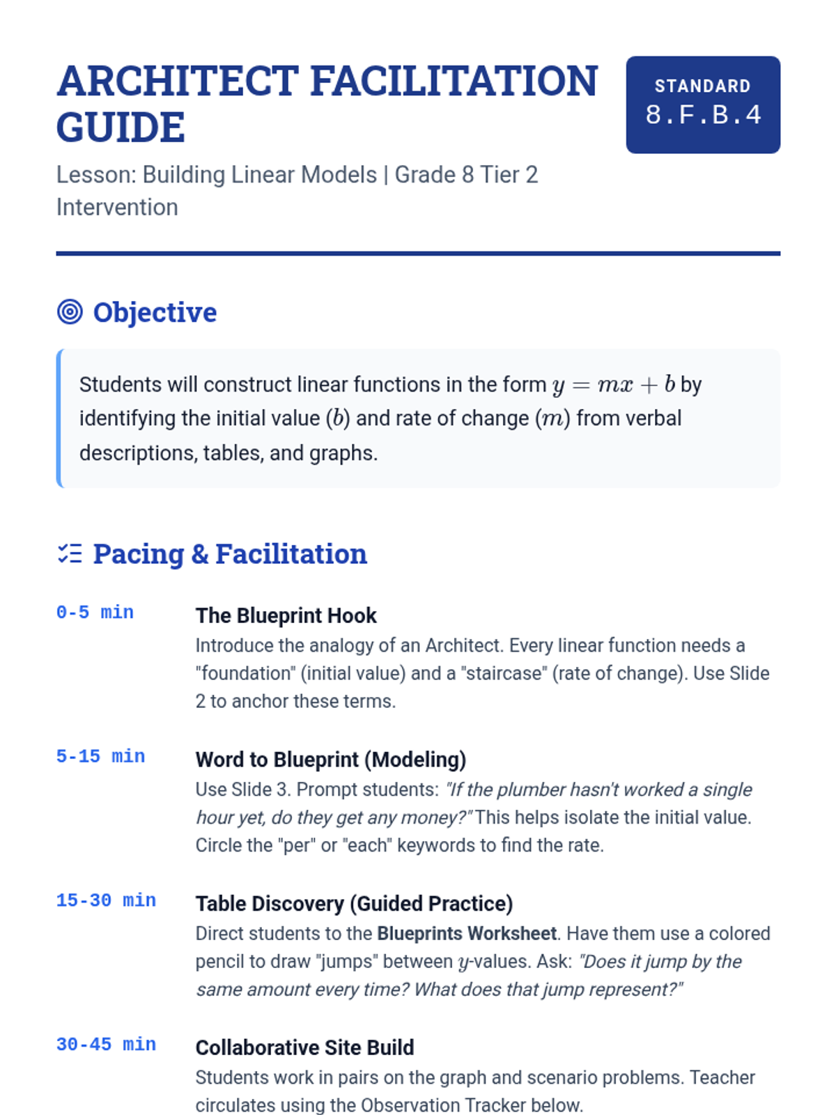 A Tier 2 intervention sequence focused on helping 8th-grade students master the construction and interpretation of linear functions ($y = mx + b$) from various representations. The sequence emphasizes scaffolding, contextual meaning, and procedural fluency with rate of change and initial values.