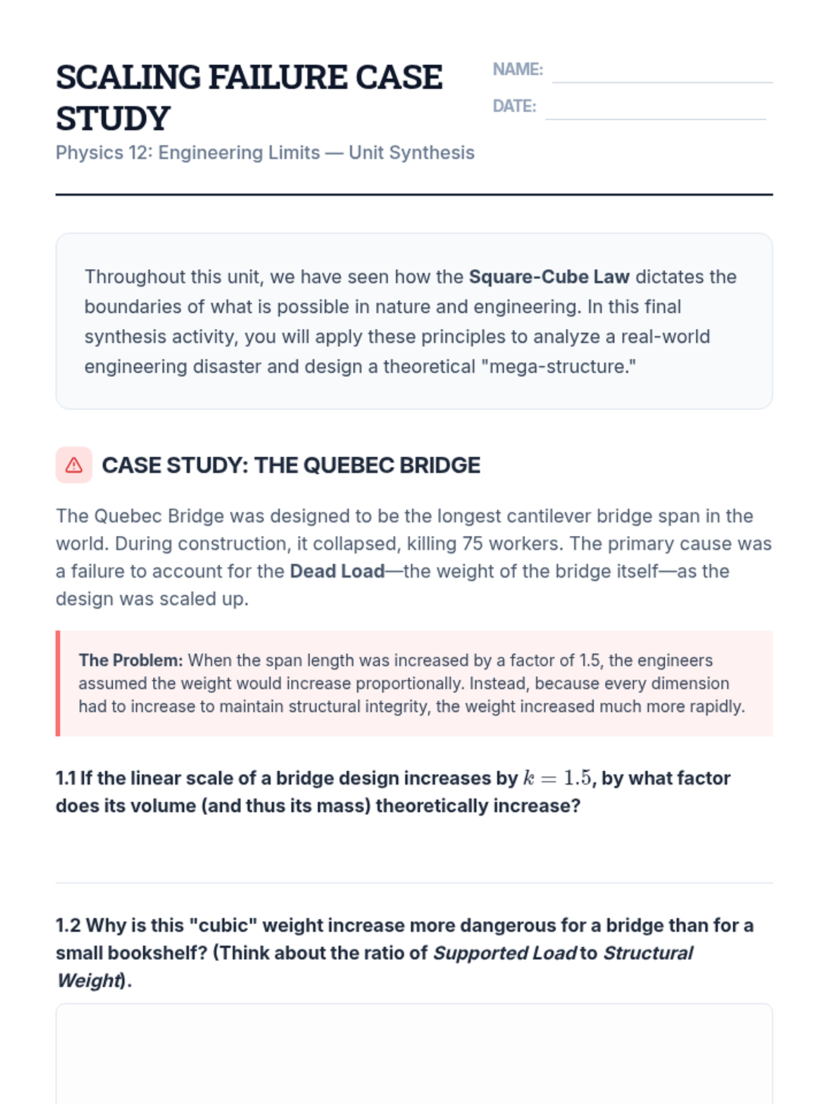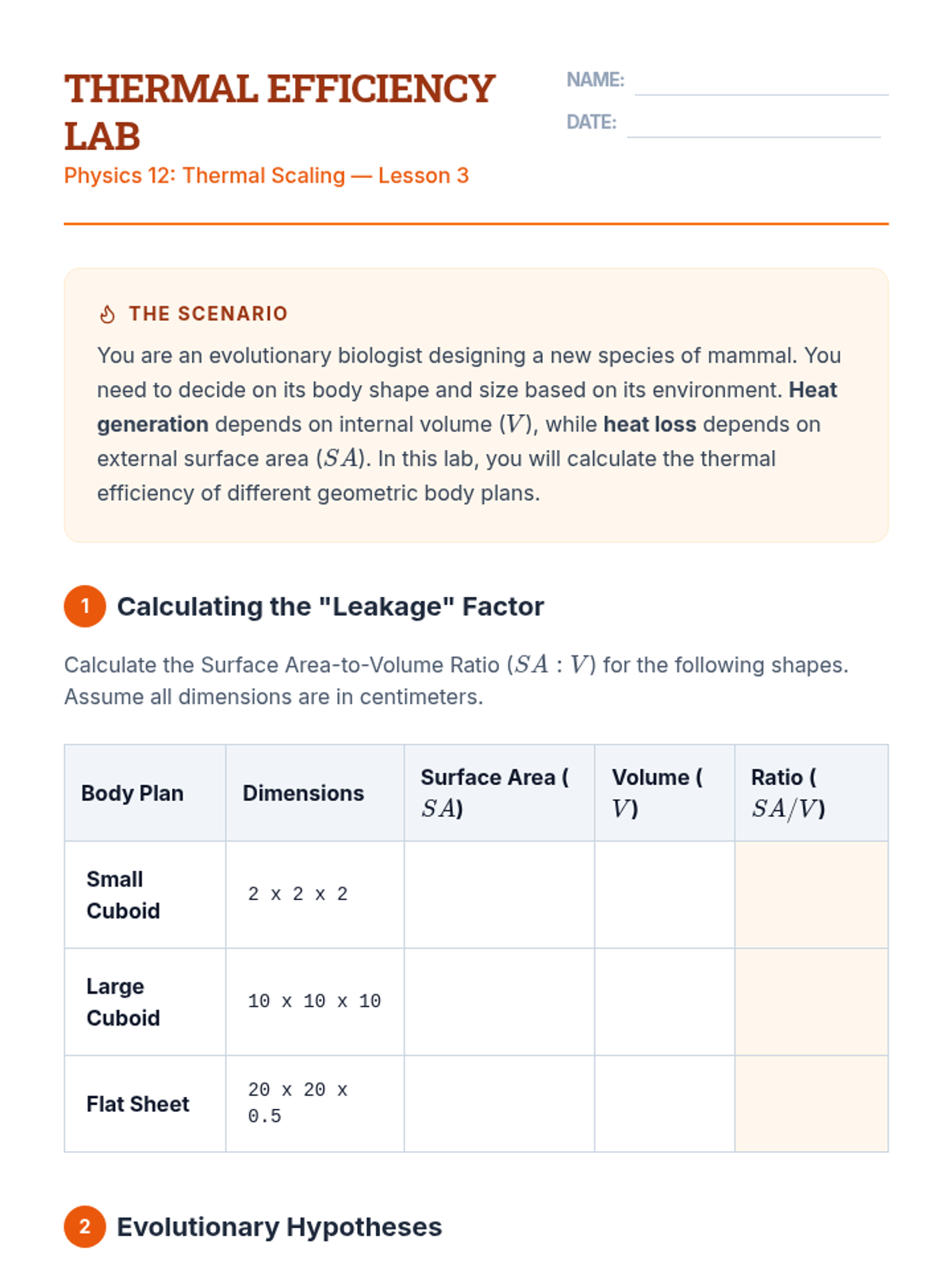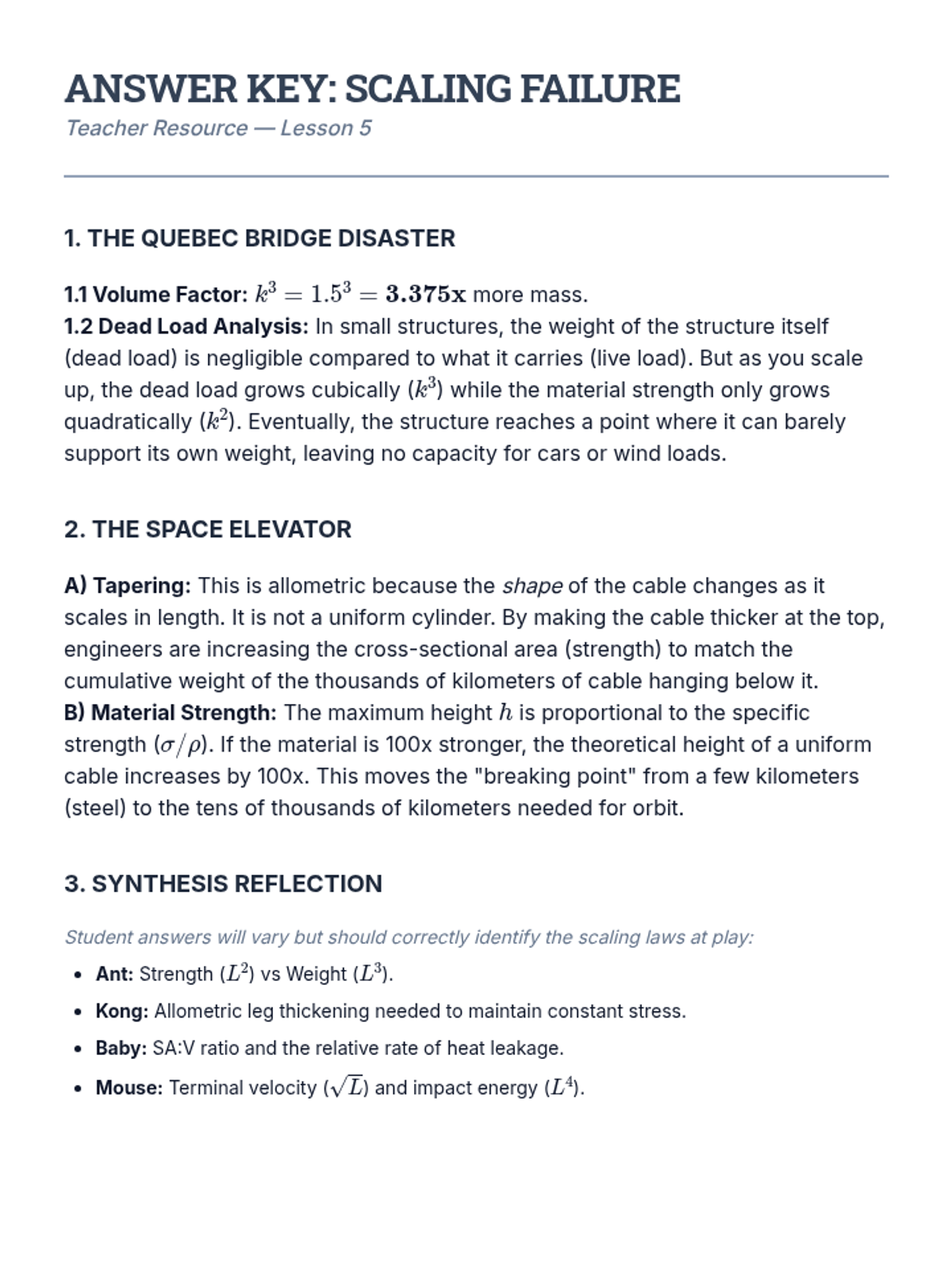 This sequence investigates the Square-Cube Law and scaling relationships, examining how changes in an object's dimension affect its surface area, volume, and physical behavior. Students analyze biological constraints, structural engineering limits, and thermal properties through the lens of geometric proportions.