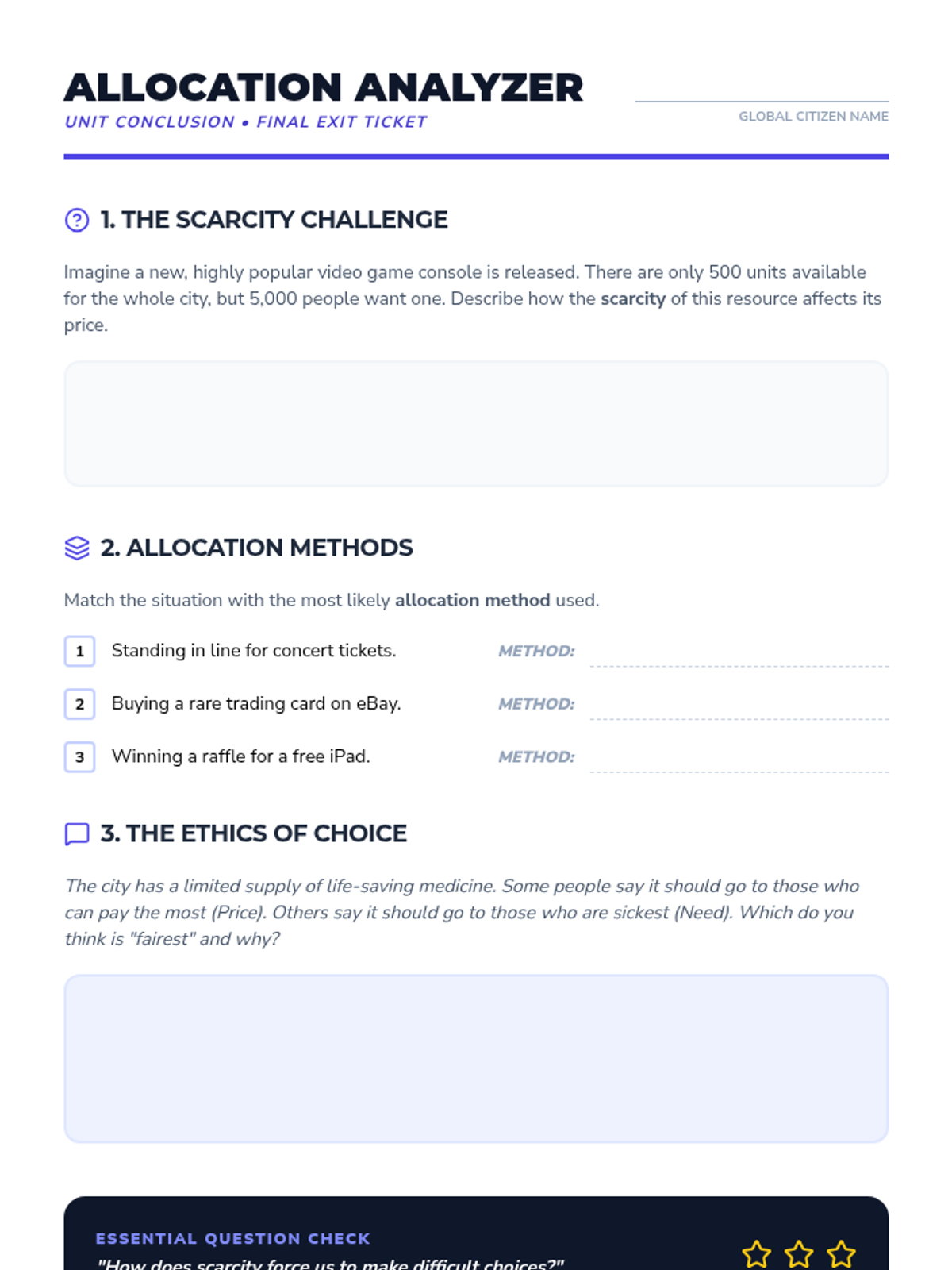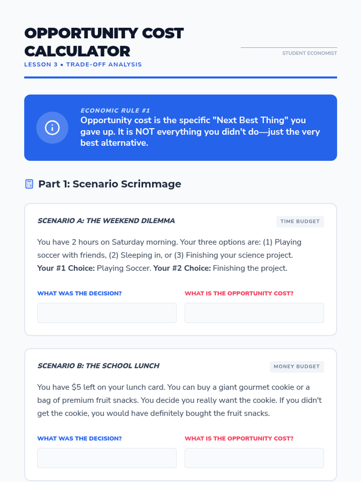 A 5-lesson unit for 6th Grade Social Studies that explores the fundamental economic problem of scarcity. Students will investigate the difference between needs and wants, experience scarcity through simulations, calculate opportunity cost, and analyze how societies allocate limited resources fairly and efficiently.