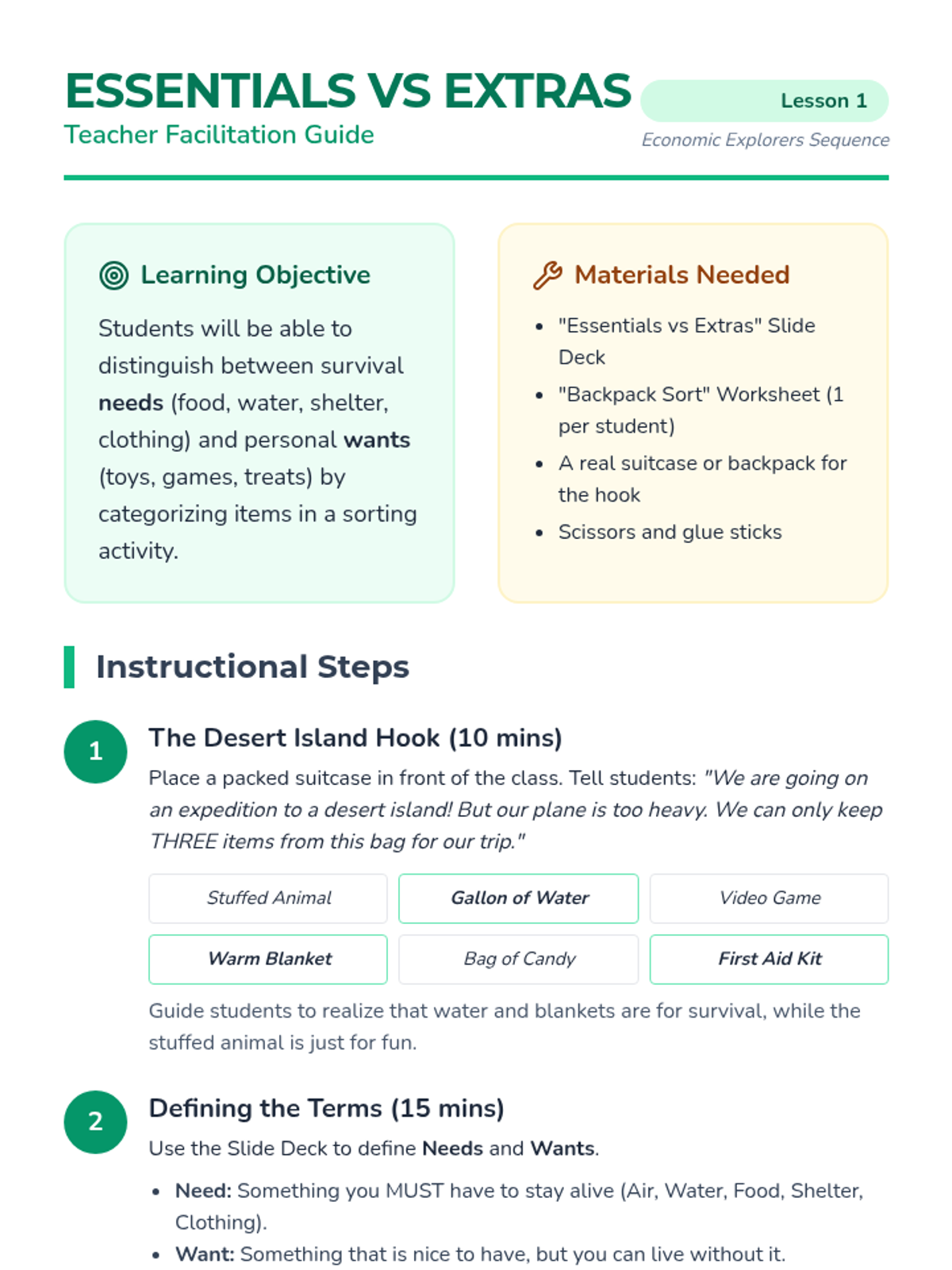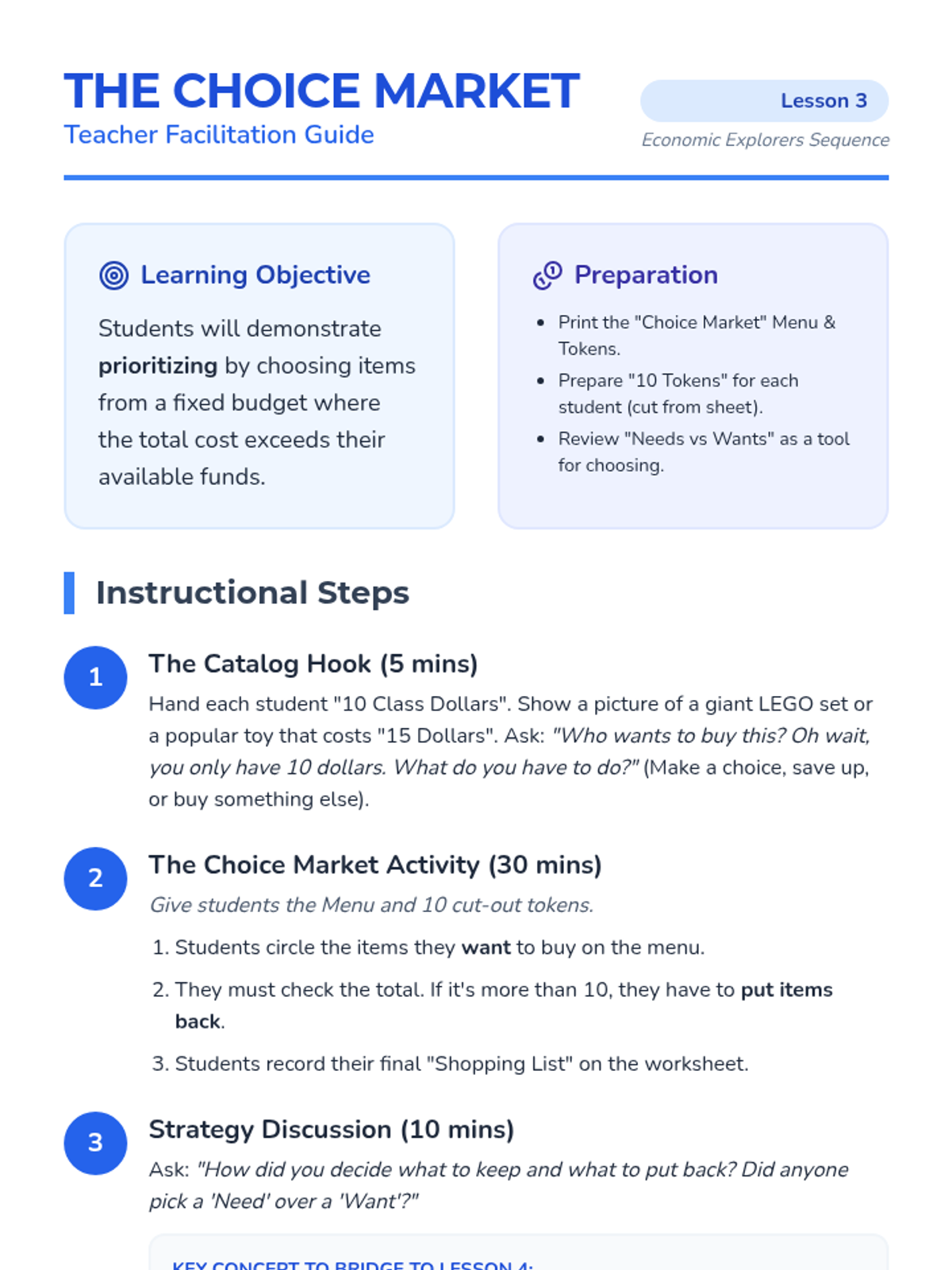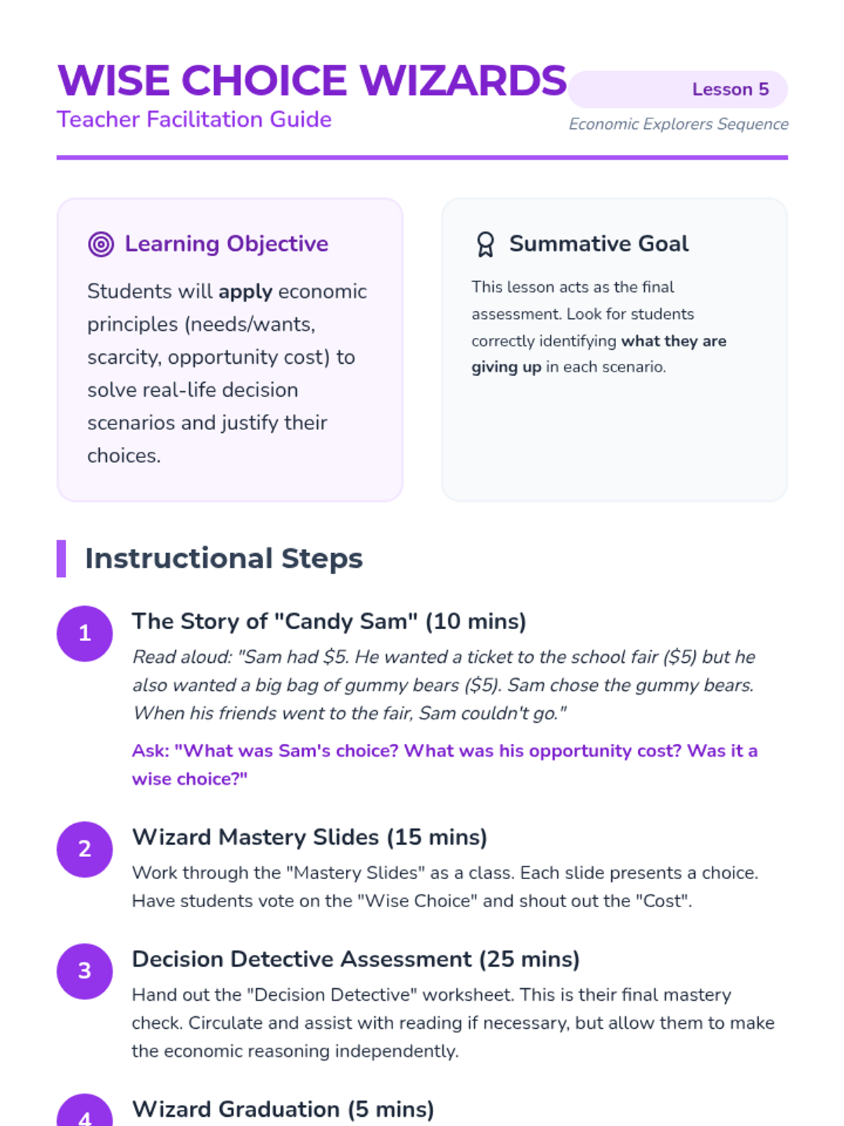 A comprehensive 2nd-grade economics sequence that guides students from distinguishing between needs and wants to understanding the complex concept of opportunity cost through simulations and hands-on activities.