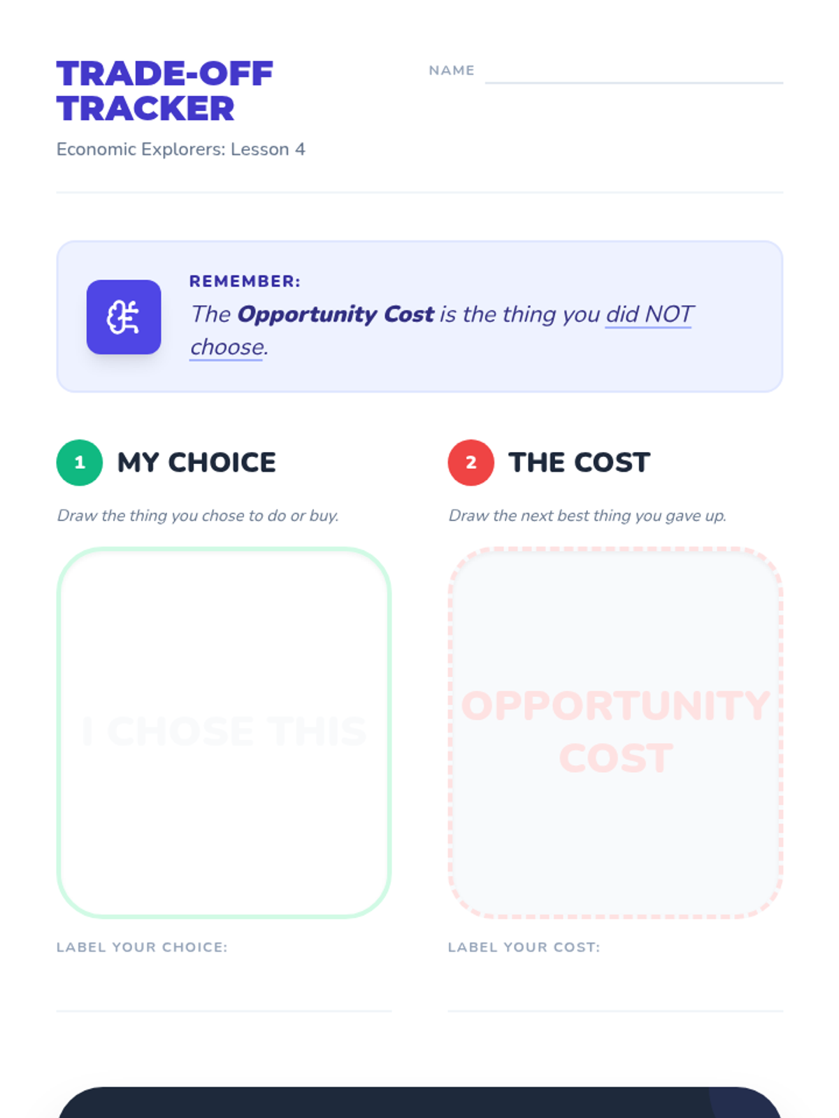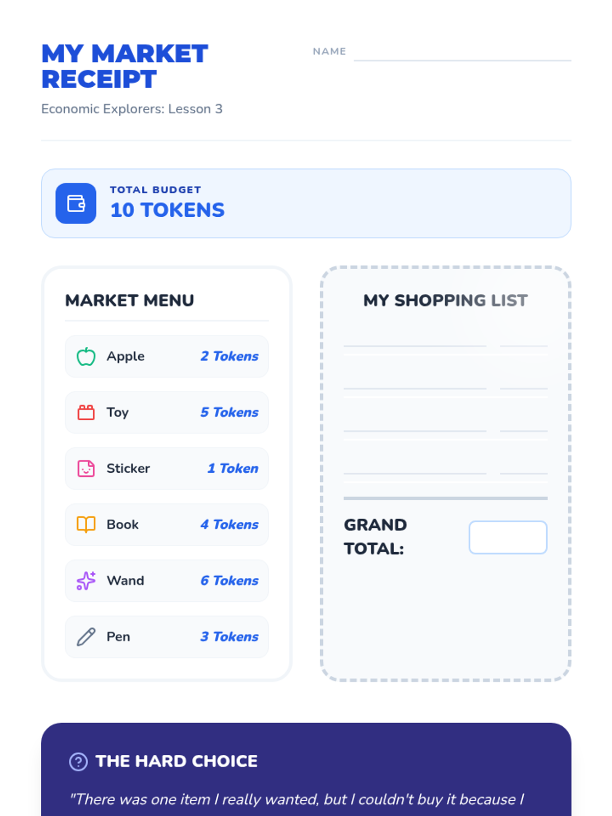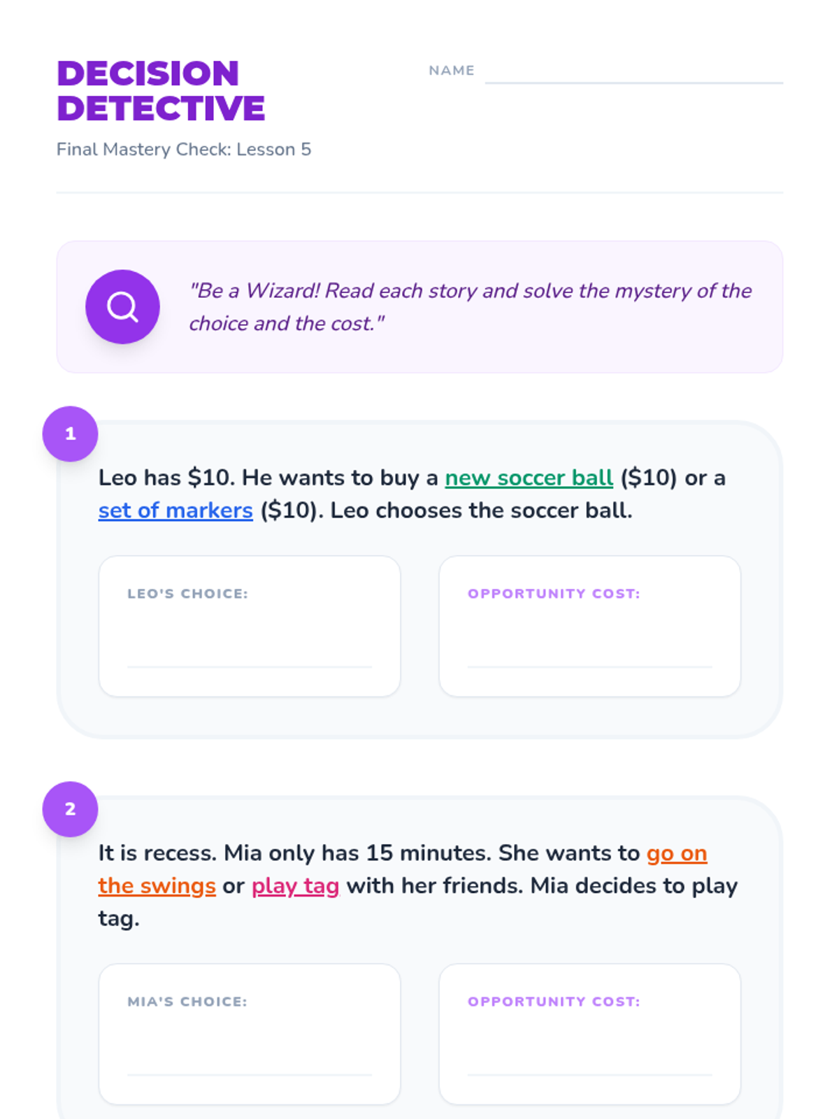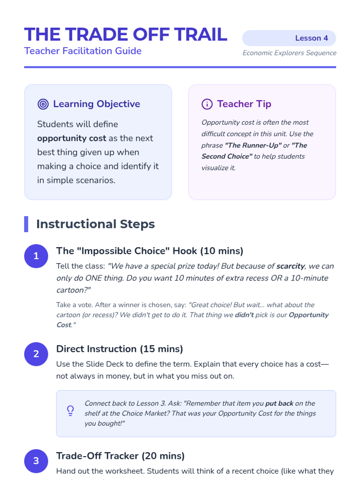 A comprehensive 2nd-grade economics sequence that guides students from distinguishing between needs and wants to understanding the complex concept of opportunity cost through simulations and hands-on activities.
