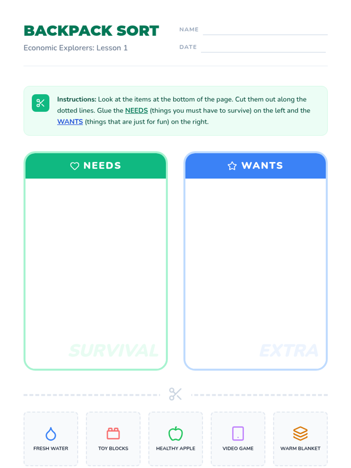 An introductory sequence for 2nd-grade students on economic concepts, focusing on the difference between needs and wants, the reality of scarcity, and the concept of opportunity cost through hands-on simulations and creative projects.