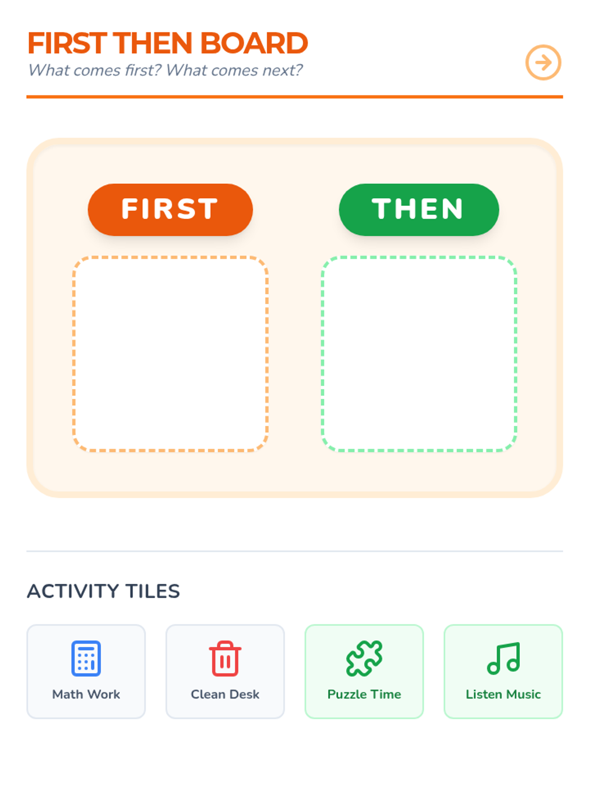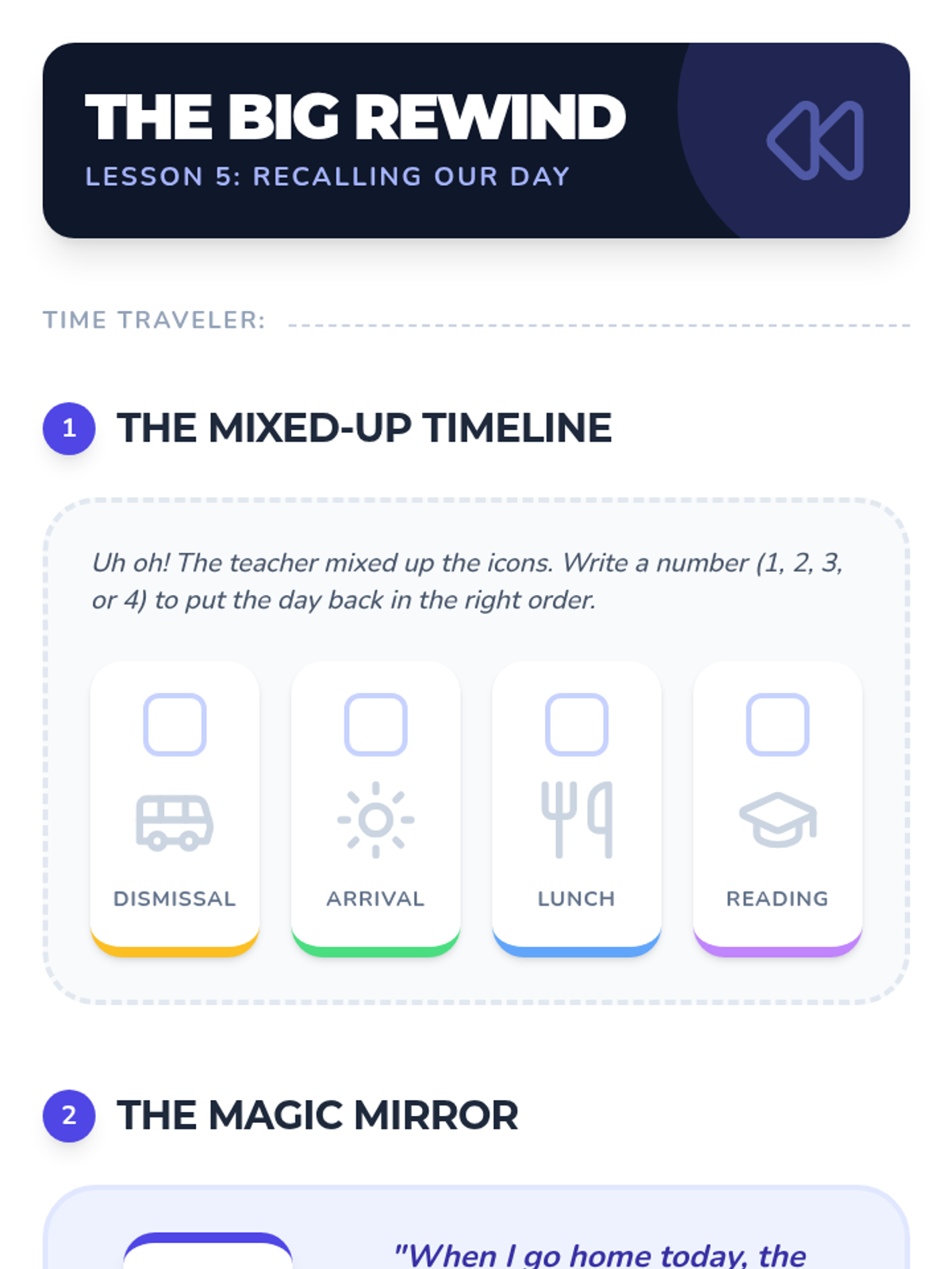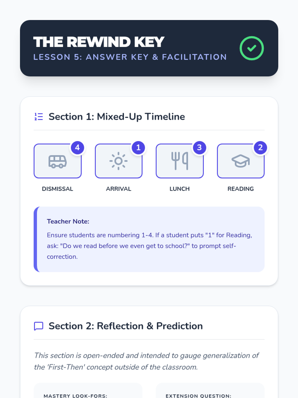 A foundational sequence for 4th-grade students to master visual schedule literacy. Students progress from matching concrete objects to abstract icons, understanding temporal order, utilizing 'First-Then' contingencies, and navigating a full classroom schedule to build independence and predictability.
