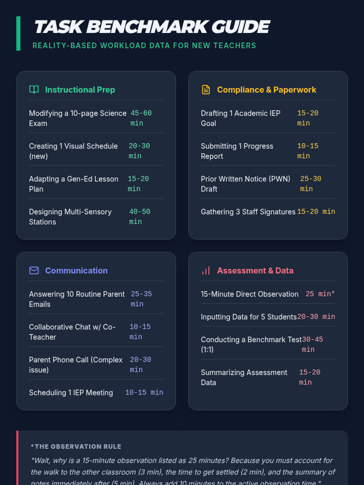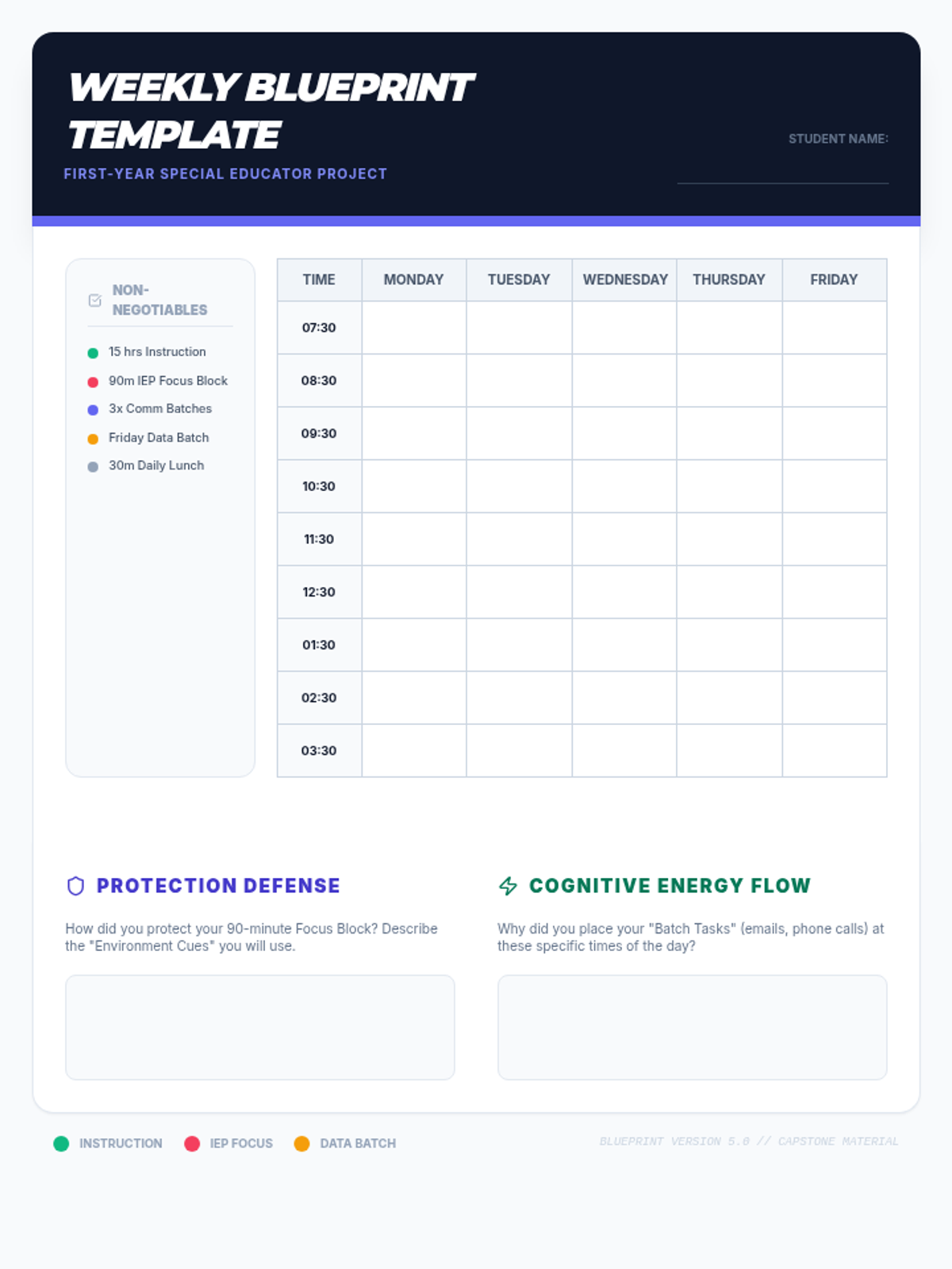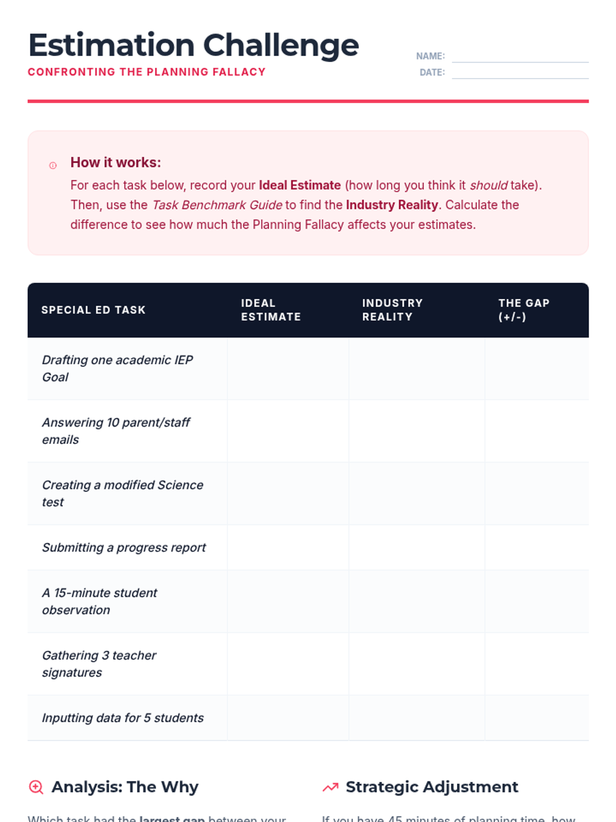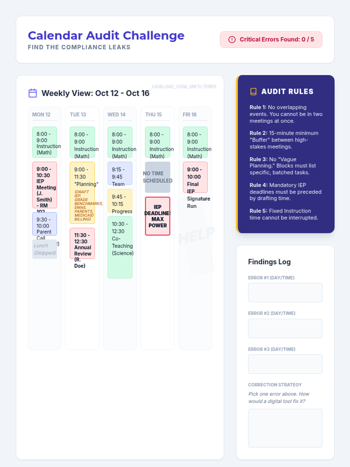 This sequence introduces 12th-grade students to the complex workload management required in Special Education. Students will learn to categorize tasks into instruction, compliance, and assessment pillars, improve their time estimation skills, and apply productivity strategies like time-blocking and task-batching to create a functional weekly schedule.