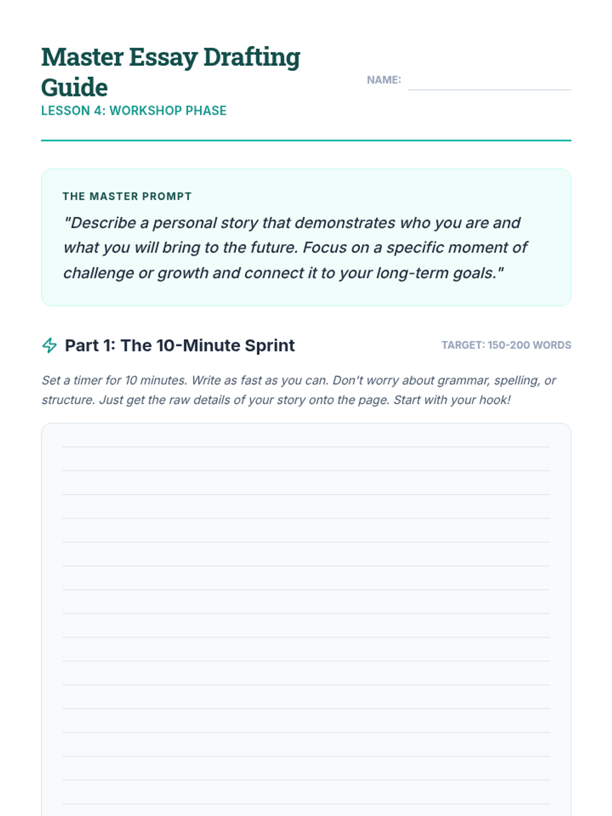 A comprehensive sequence designed for 10th-grade students to master the art of scholarship essay writing. Students will move from analyzing successful essays and identifying their own unique narratives to drafting a versatile 'master essay' and learning how to adapt it for various prompts and word counts.