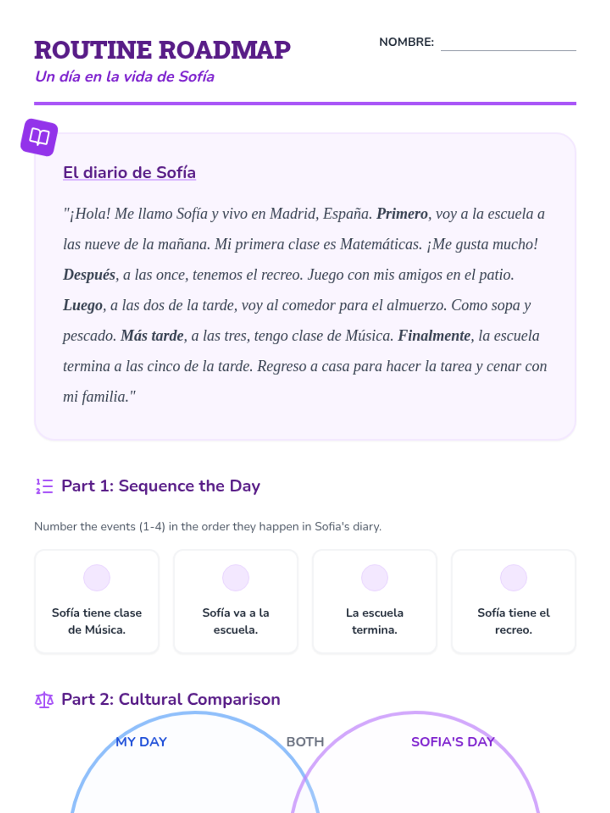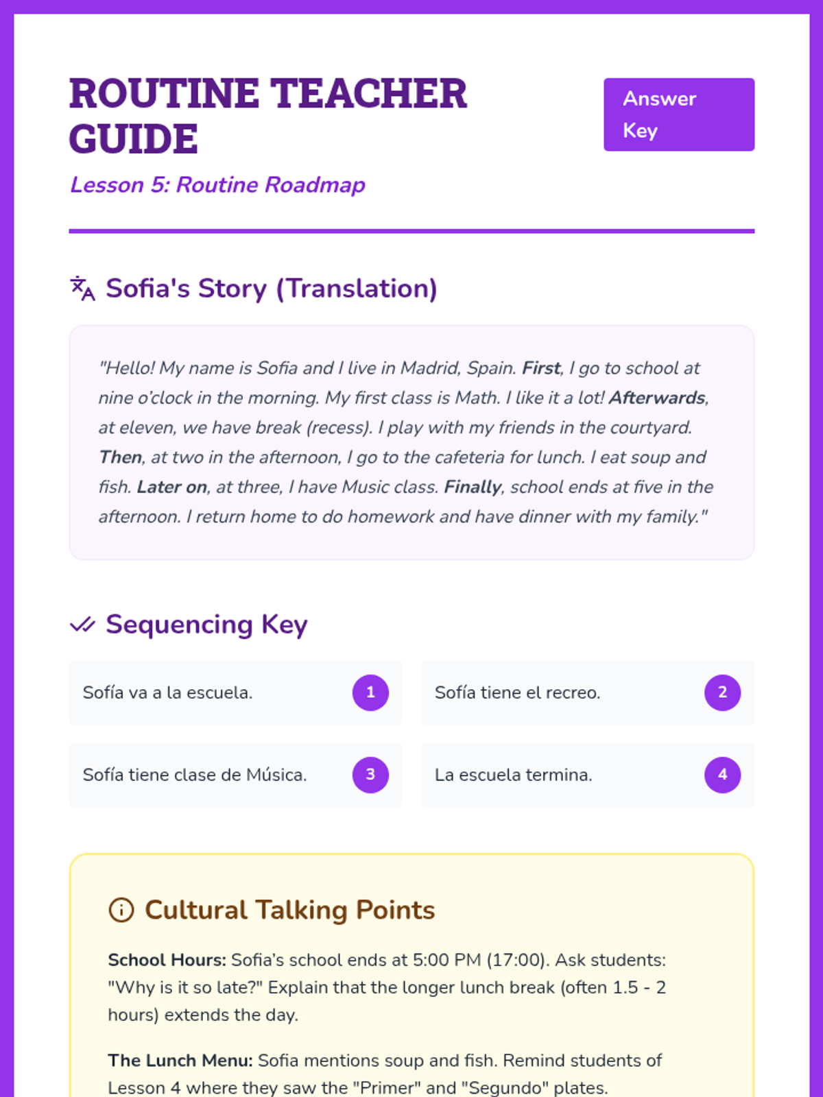 This sequence immerses 5th-grade students in the vocabulary of school life, schedules, and daily routines in Spanish-speaking countries. Through simulation and role-play contexts, students develop reading comprehension skills using authentic-style documents like class schedules, lunch menus, and supply lists.