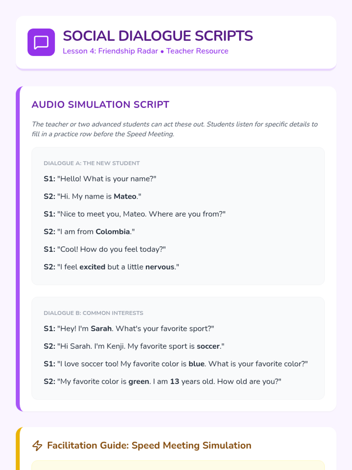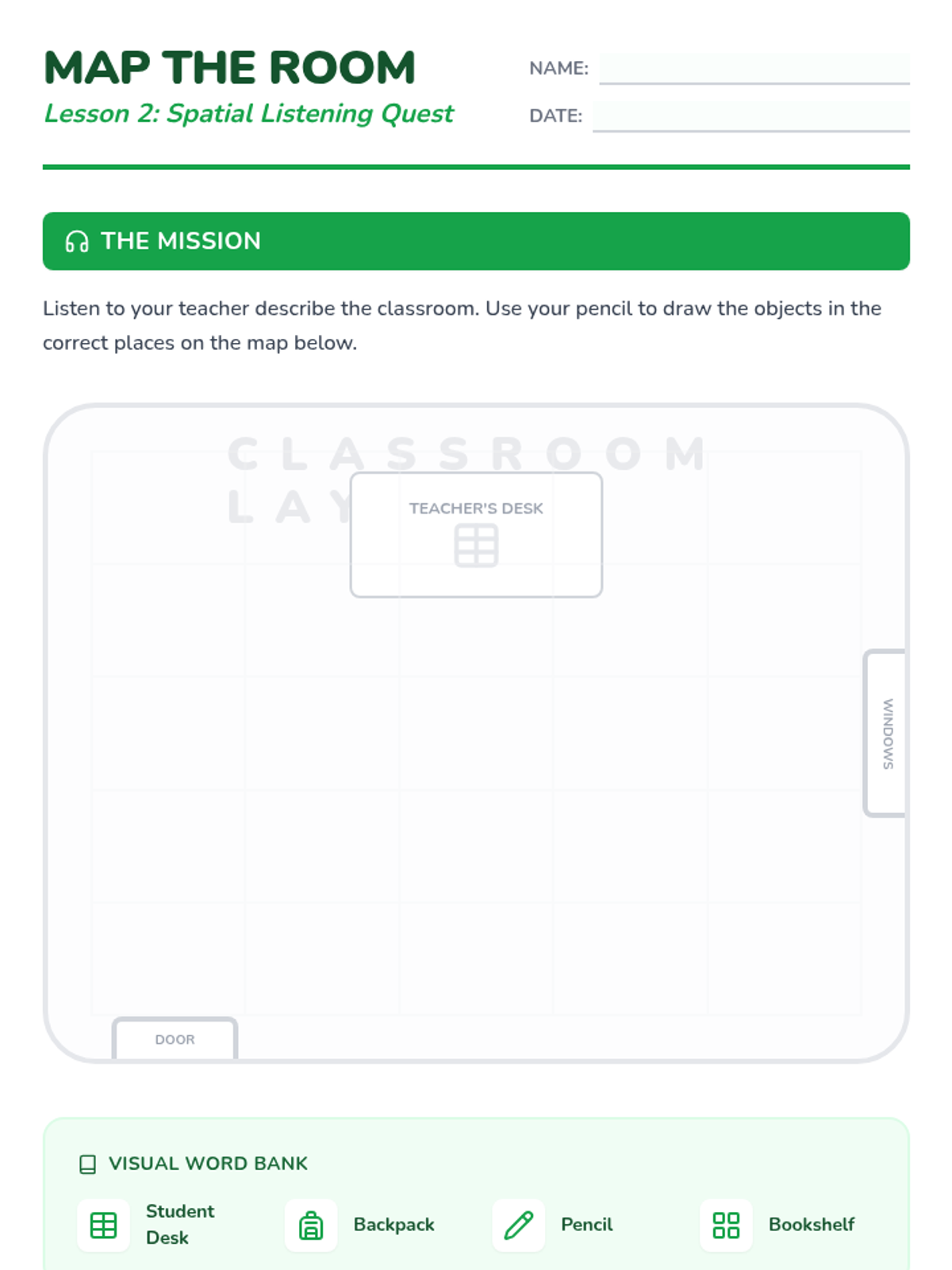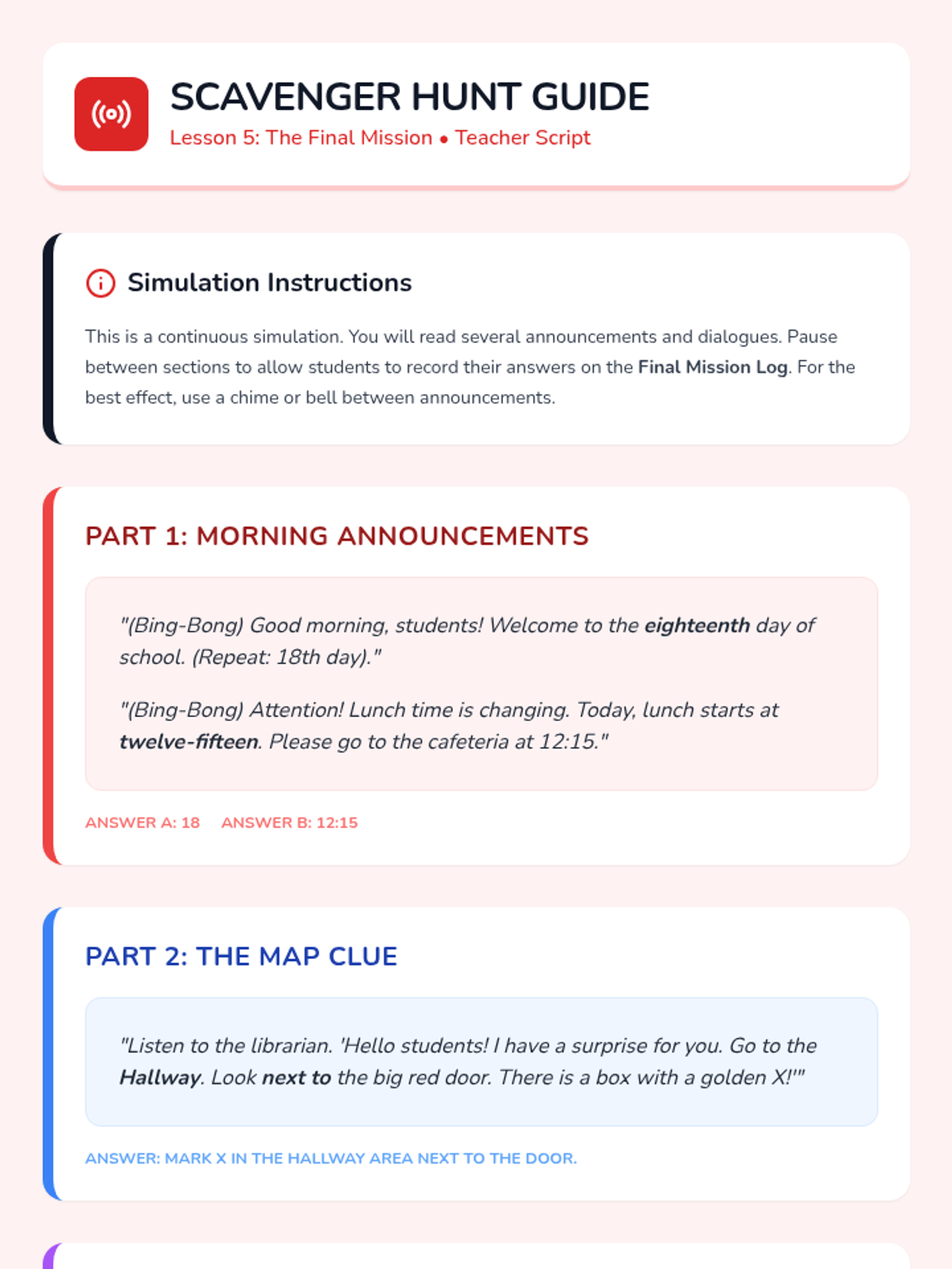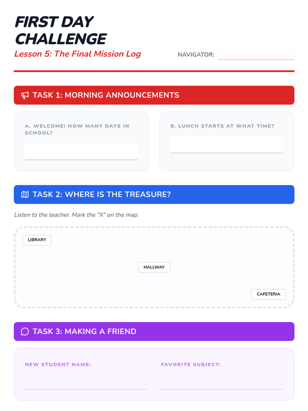 A comprehensive listening sequence for beginner ESL students to navigate their middle school environment. Students progress from basic classroom commands and object identification to mastering numbers, times, and social introductions through active listening simulations.