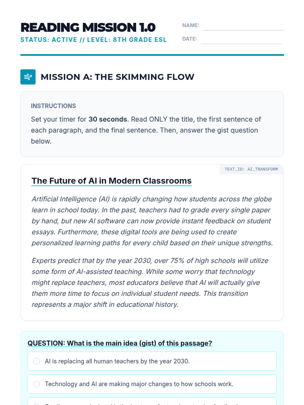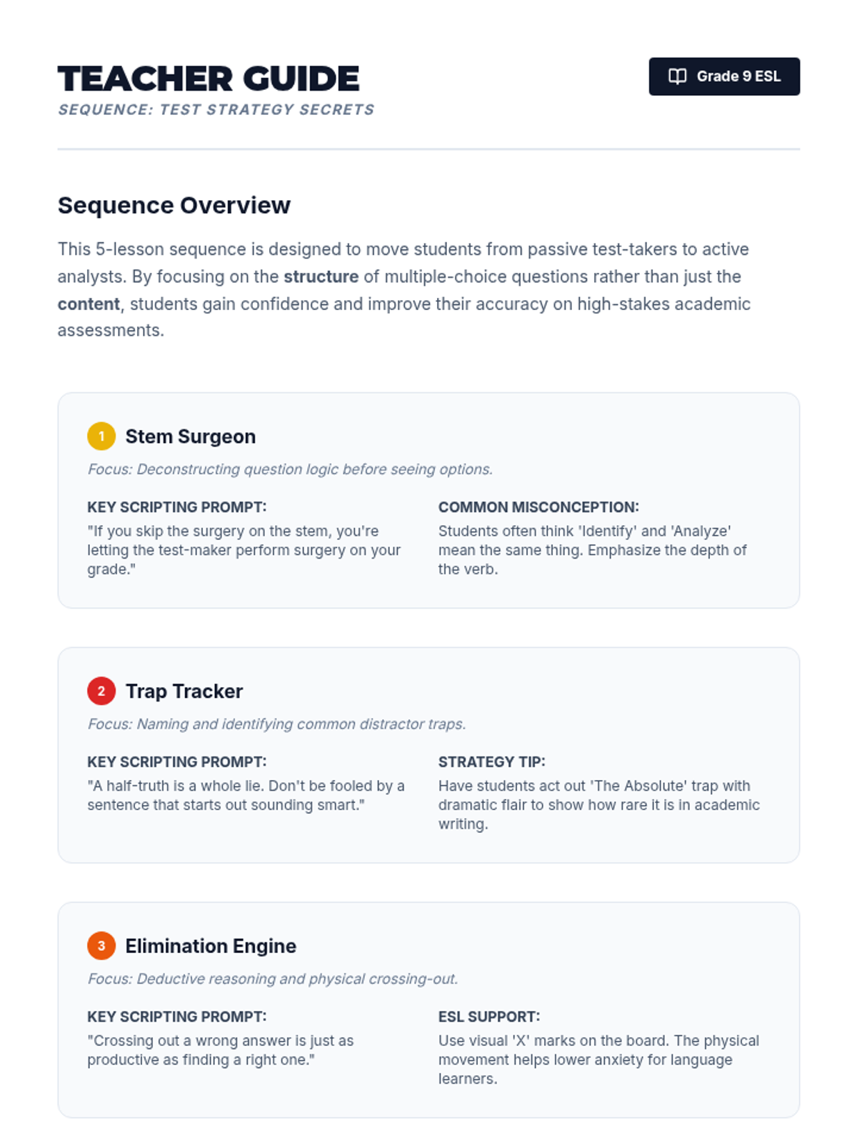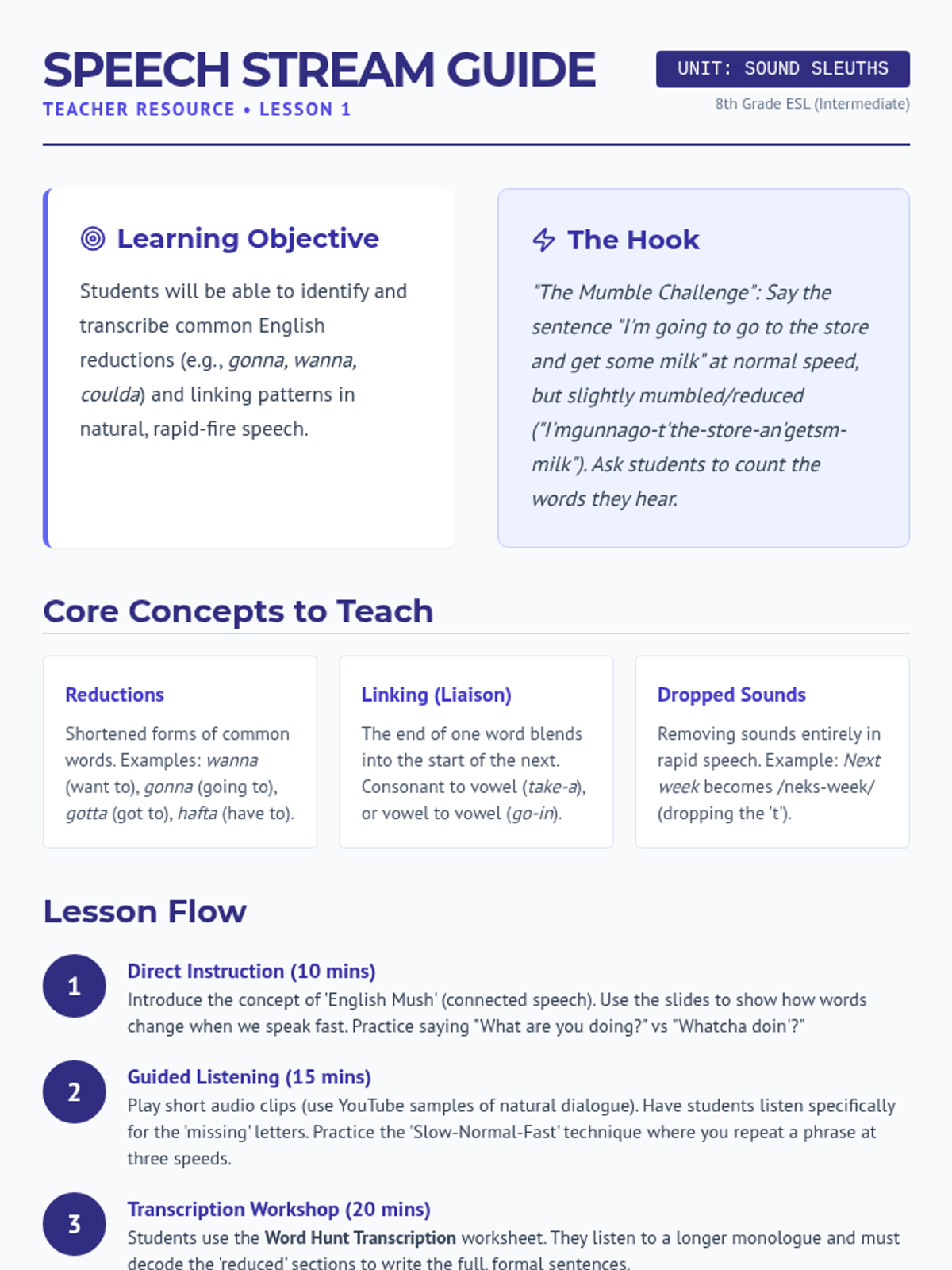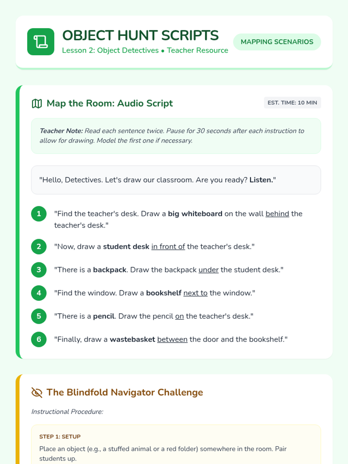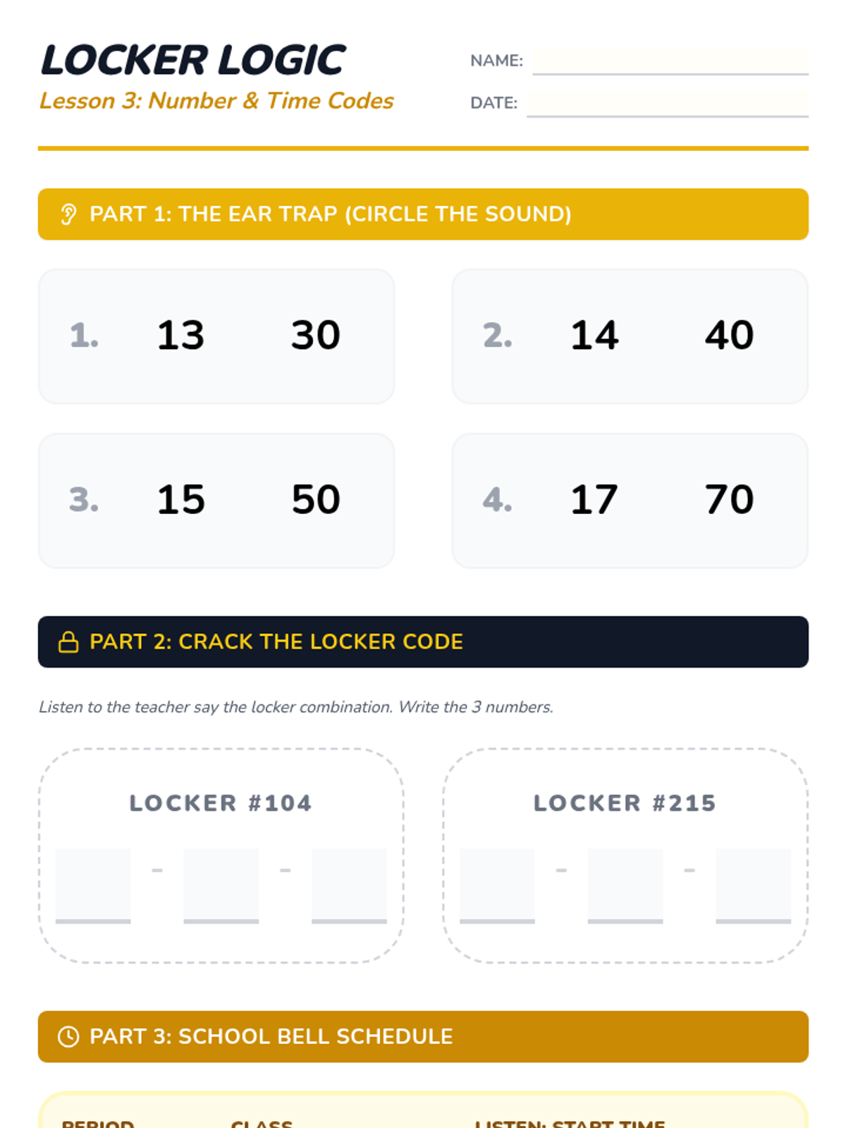 A comprehensive listening sequence for beginner ESL students to navigate their middle school environment. Students progress from basic classroom commands and object identification to mastering numbers, times, and social introductions through active listening simulations.