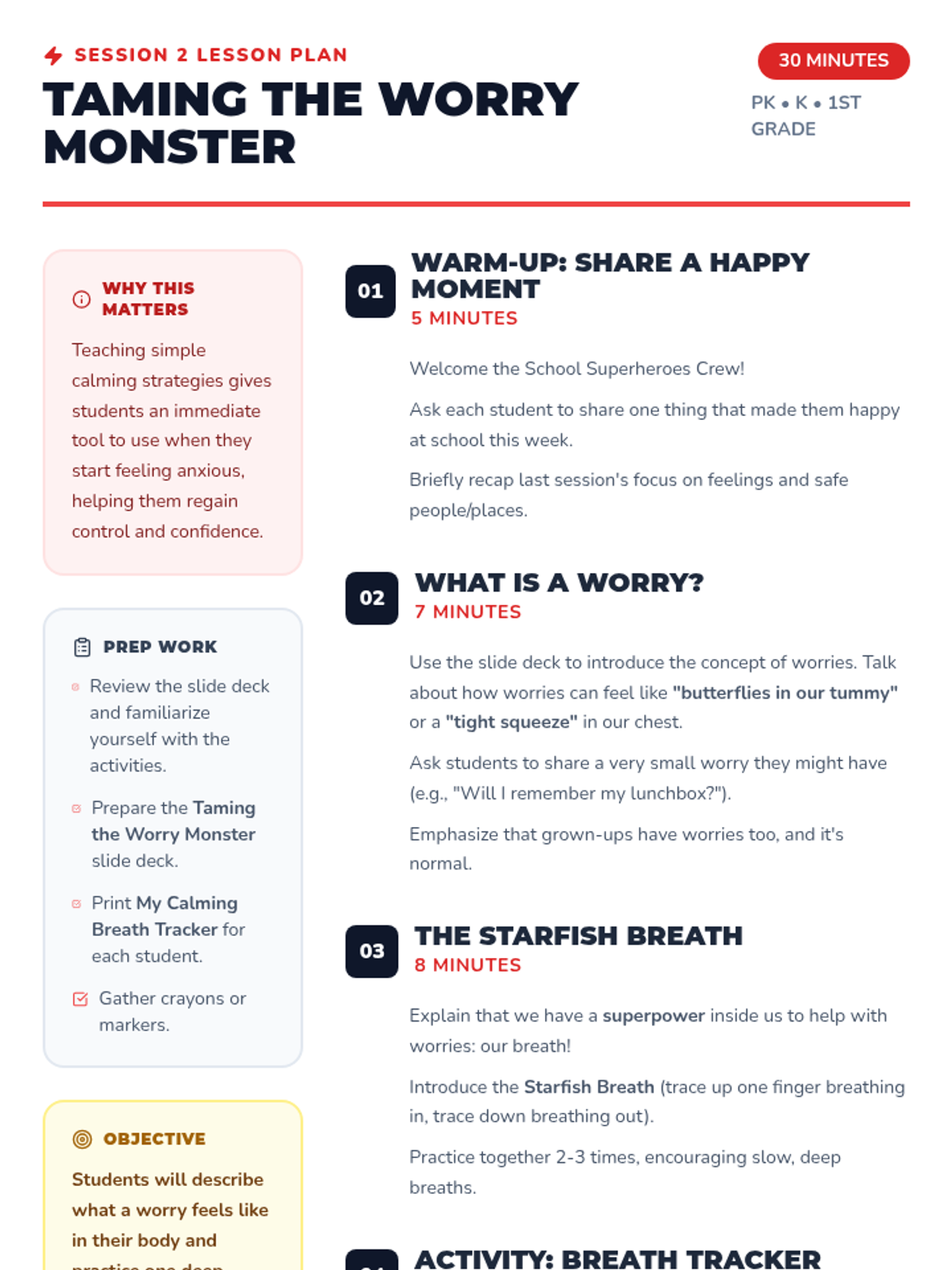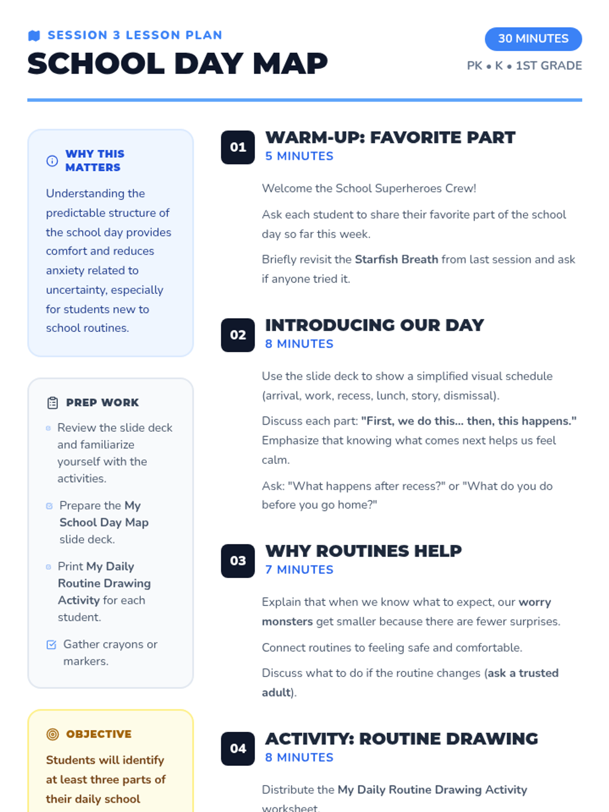 A 6-week small group guidance sequence for PK-1st grade students to manage school-related anxiety. Students learn to identify feelings, use calming breaths, understand routines, and build confidence through a superhero-themed curriculum.