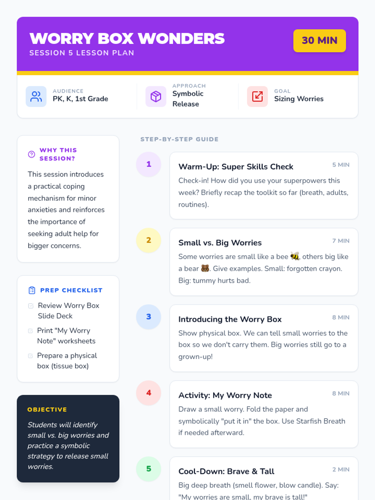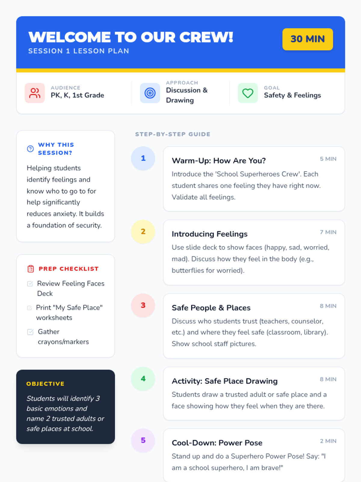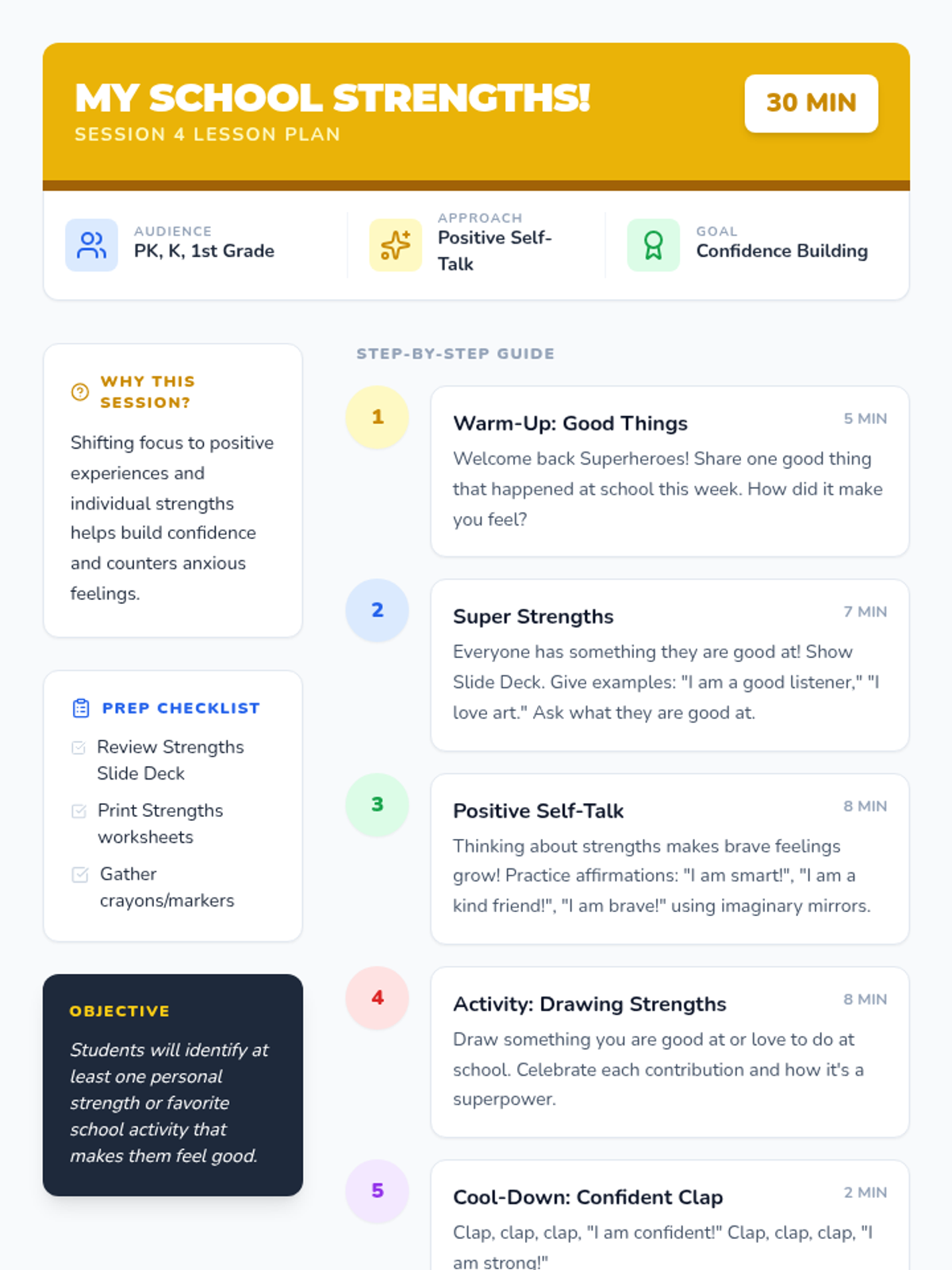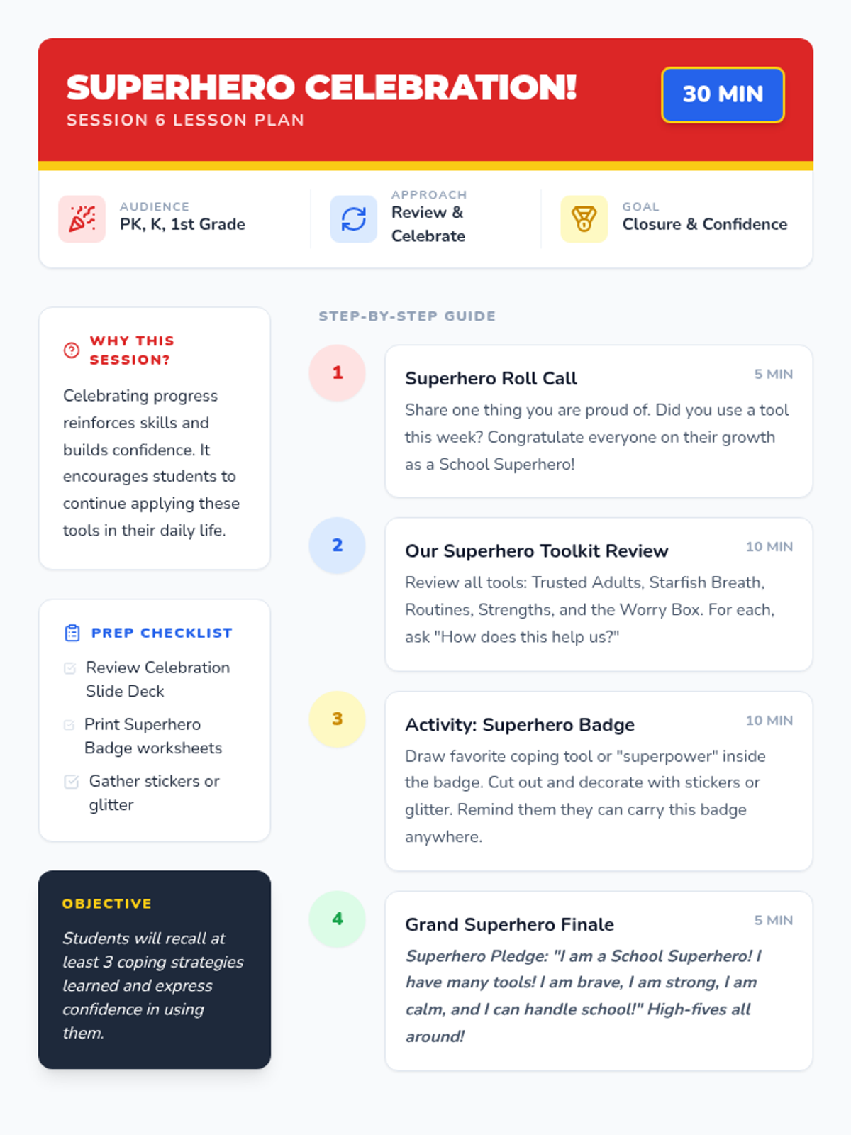 A 6-week small group guidance program for Pre-K, Kindergarten, and 1st-grade students to manage school-related anxiety, build confidence, and develop emotional regulation skills through a superhero-themed curriculum.