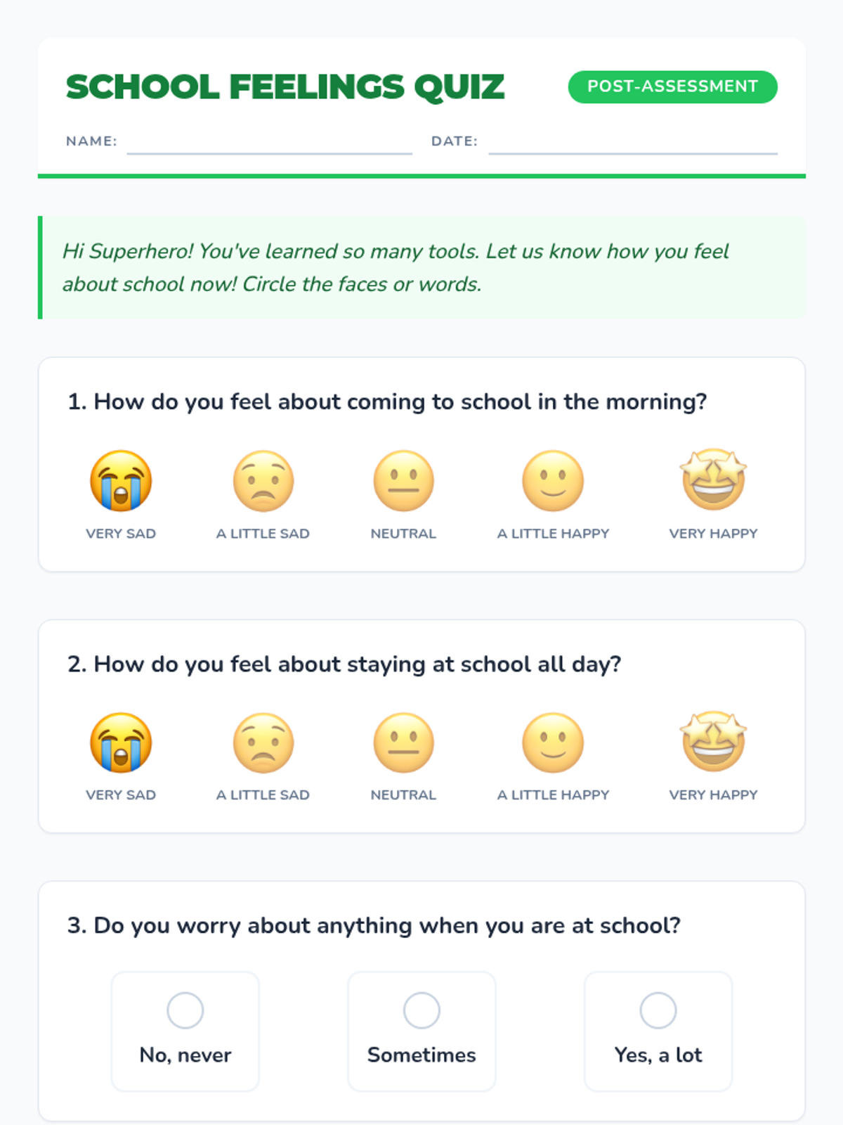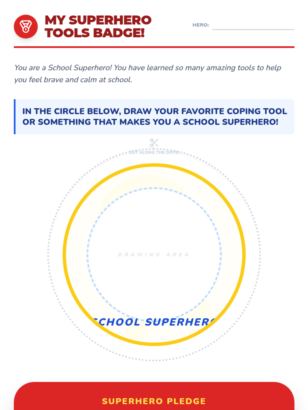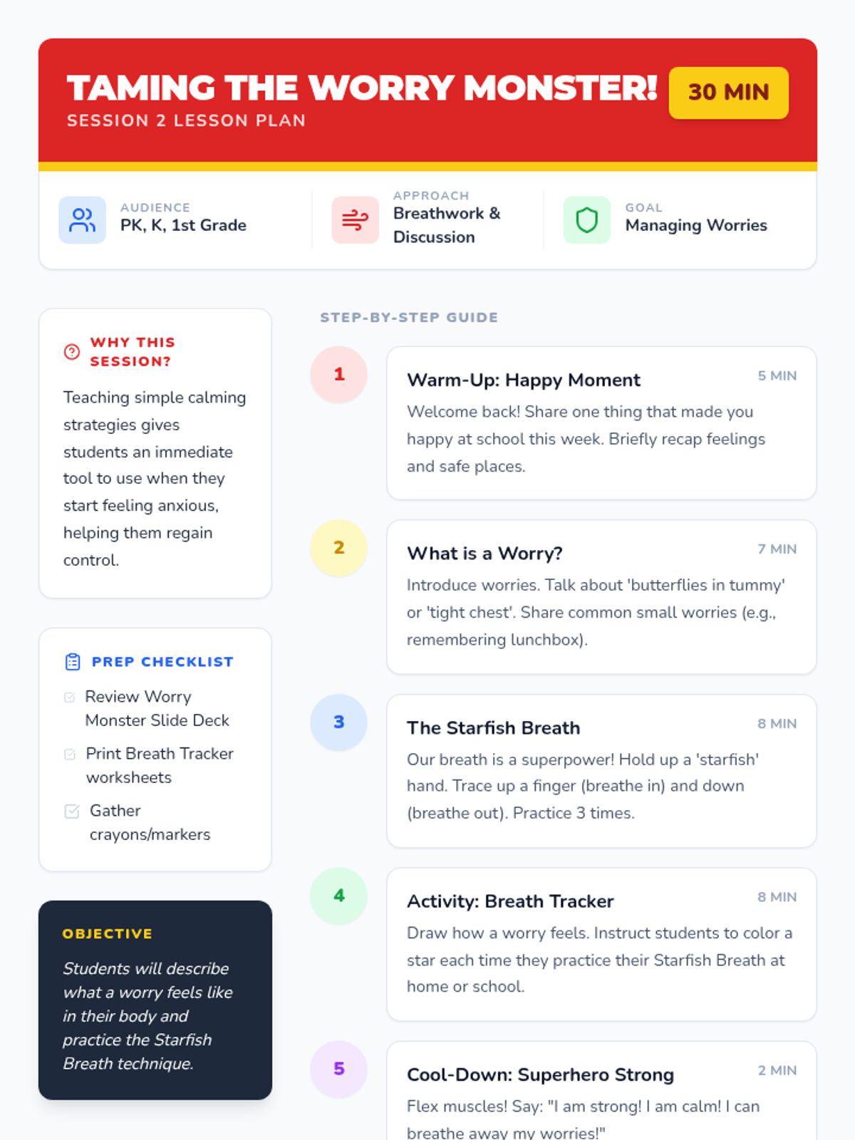 A 6-week small group guidance program for Pre-K, Kindergarten, and 1st-grade students to manage school-related anxiety, build confidence, and develop emotional regulation skills through a superhero-themed curriculum.