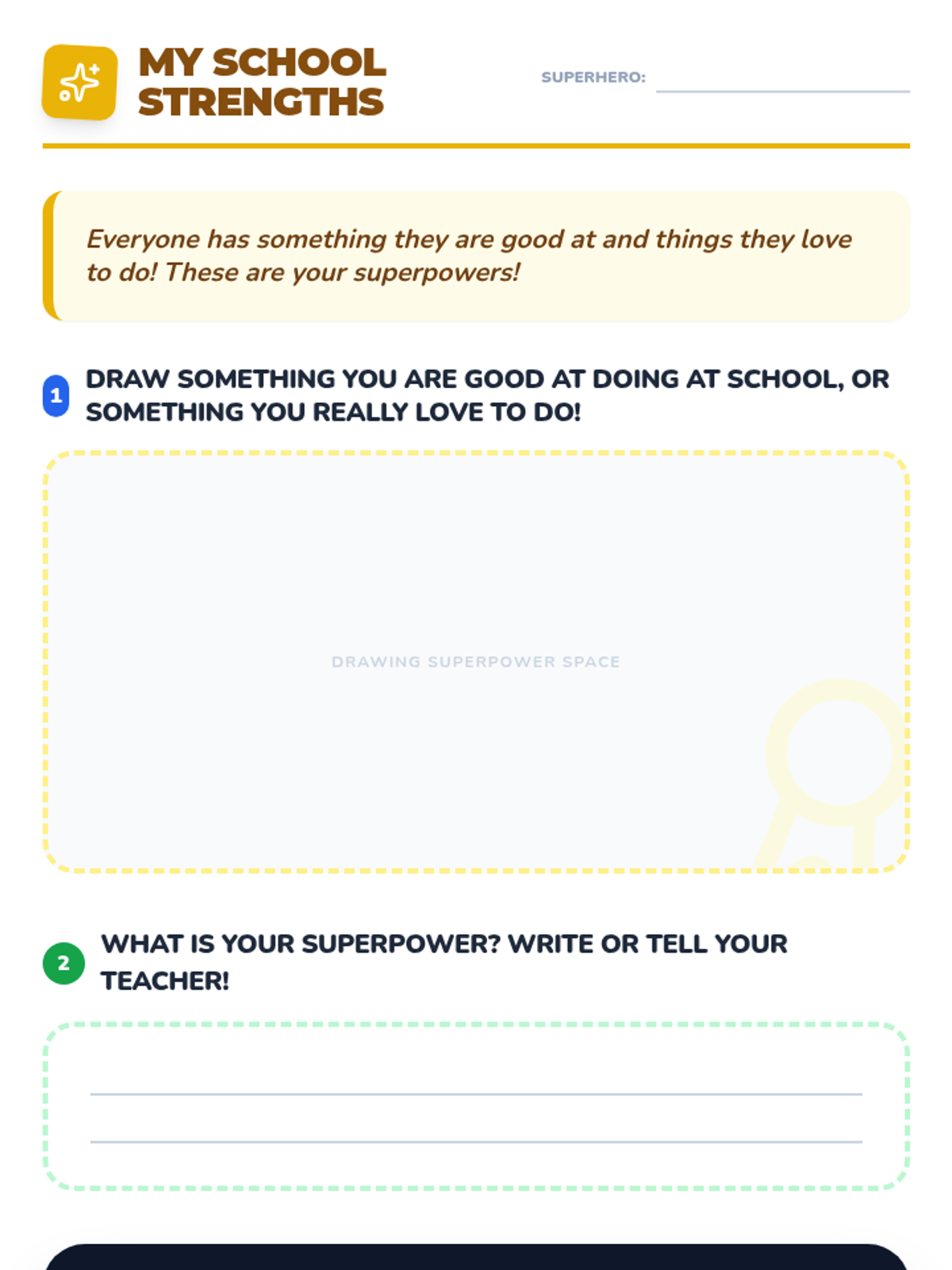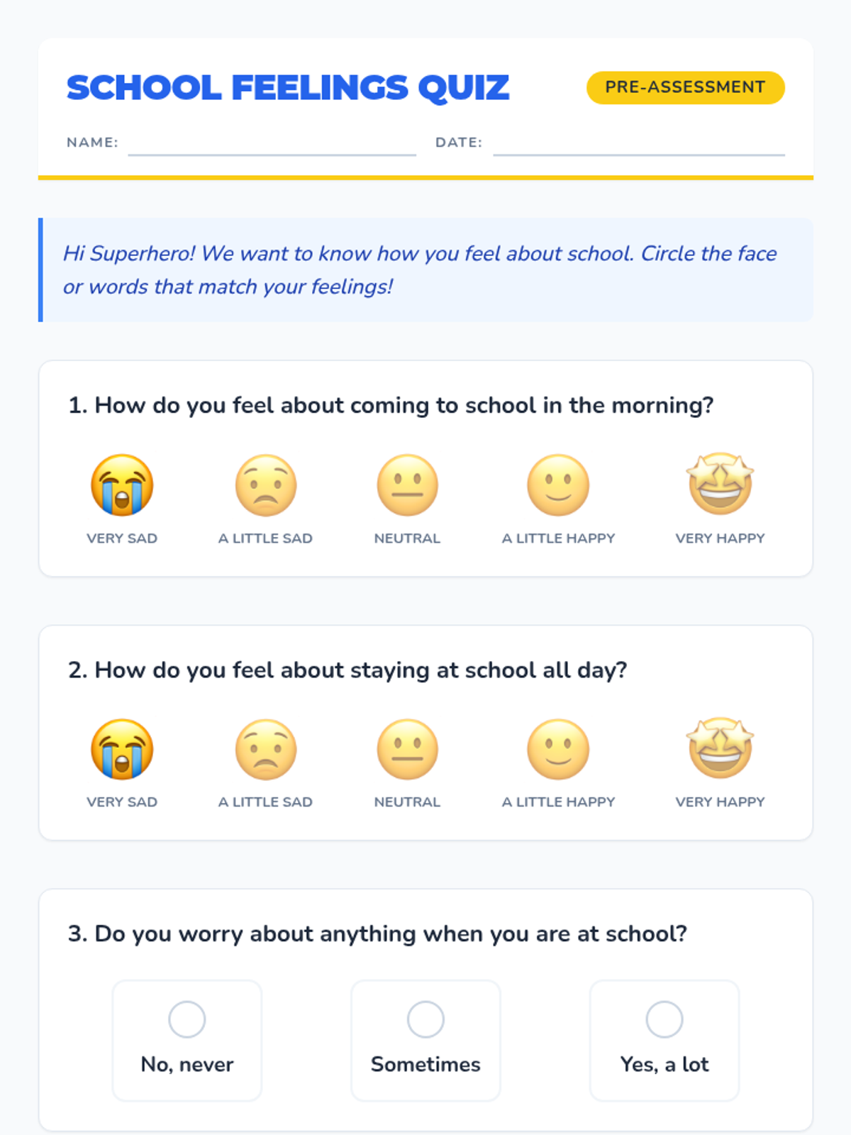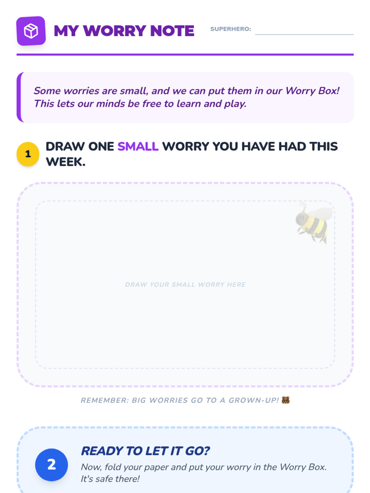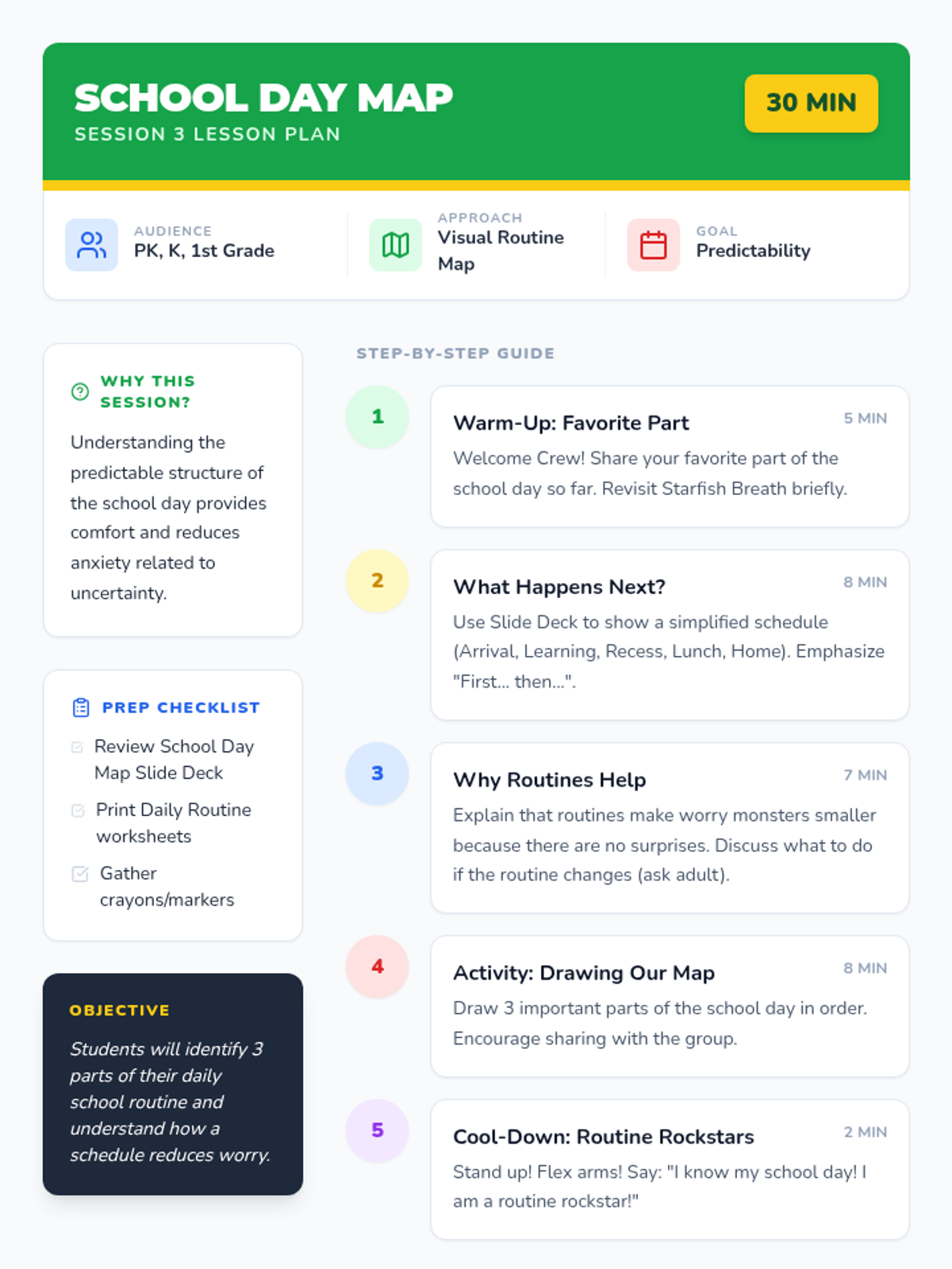 A 6-week small group guidance program for Pre-K, Kindergarten, and 1st-grade students to manage school-related anxiety, build confidence, and develop emotional regulation skills through a superhero-themed curriculum.