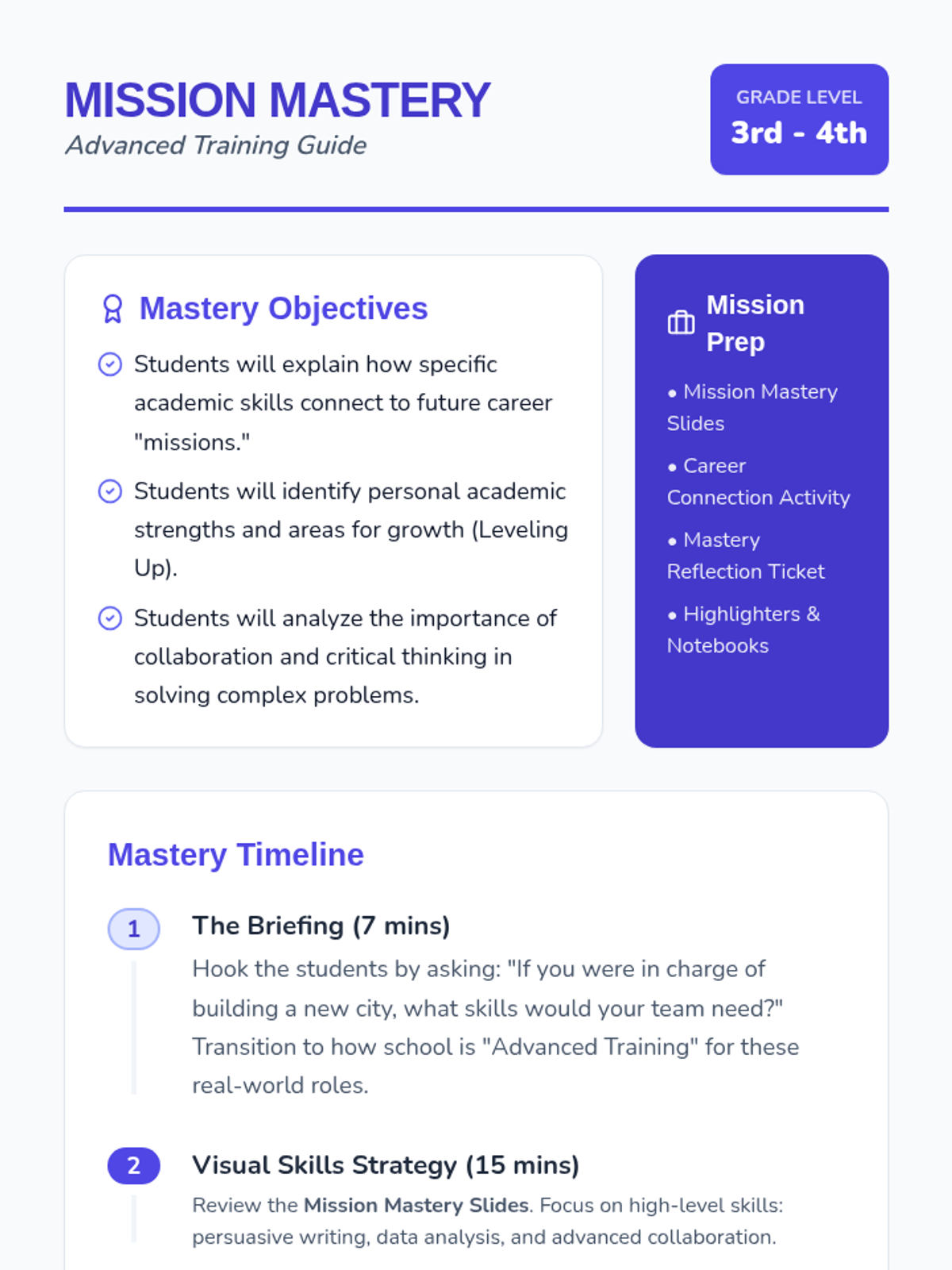 A series of lessons designed to help elementary students understand the value and real-world application of their education through a 'Superpower' and 'Mission' theme.