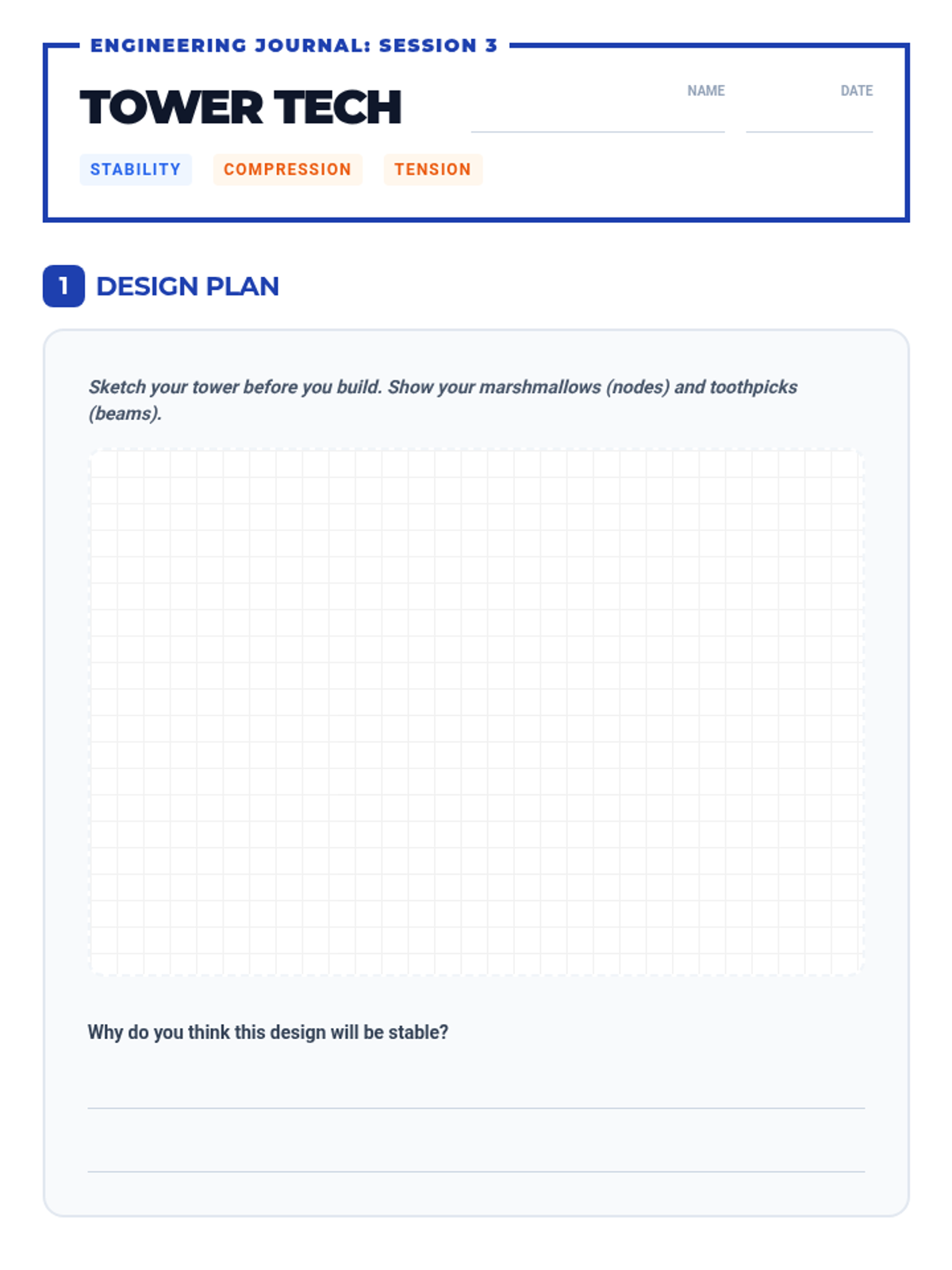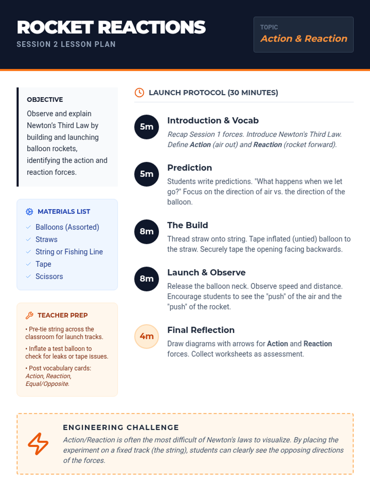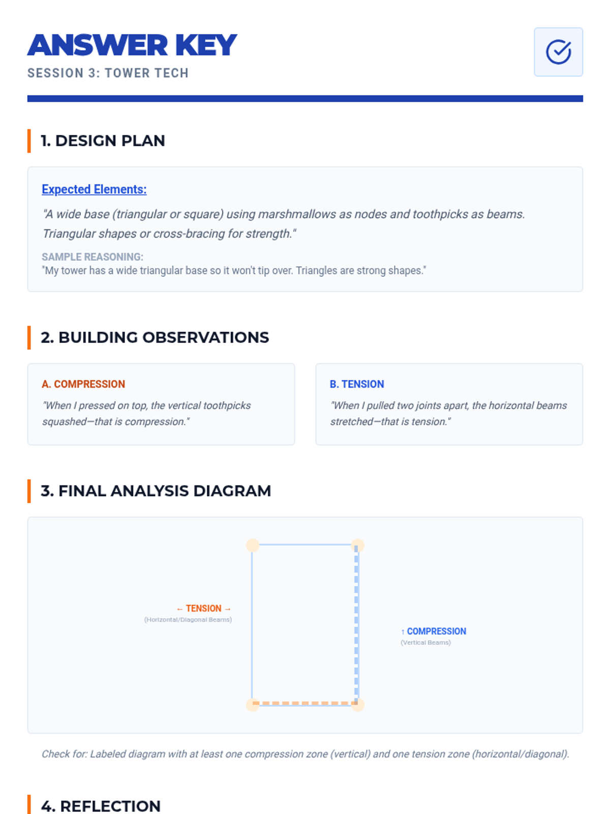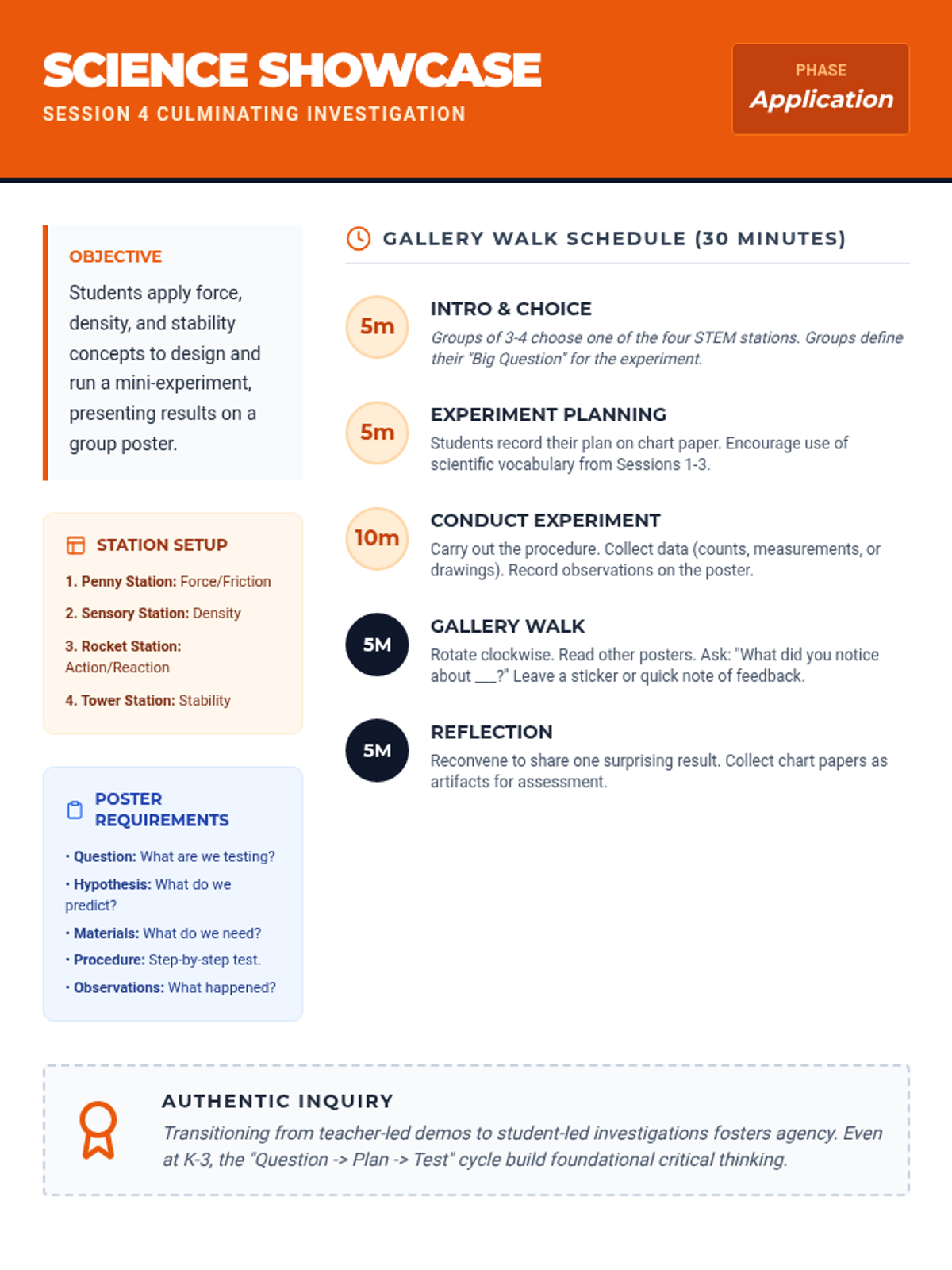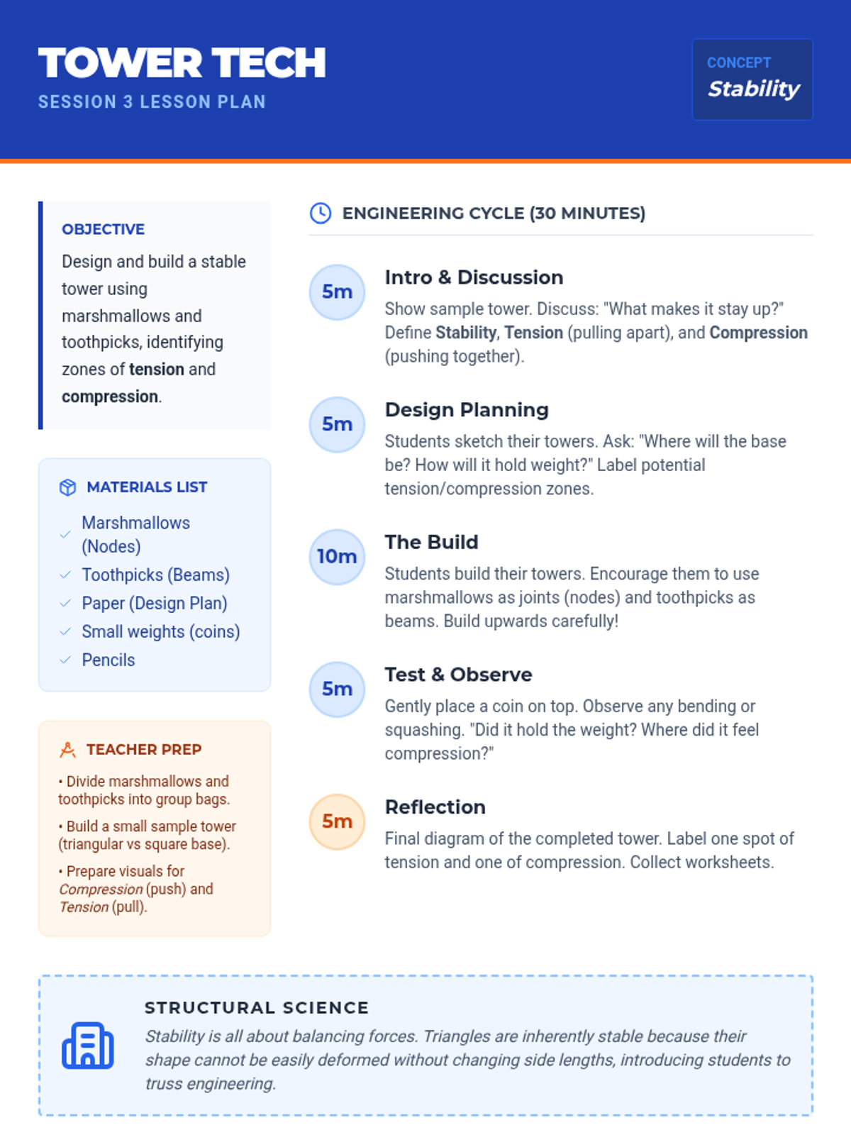 A 4-session K-3 STEM series where students explore forces, density, action-reaction, and structural stability through hands-on building challenges and scientific inquiry.