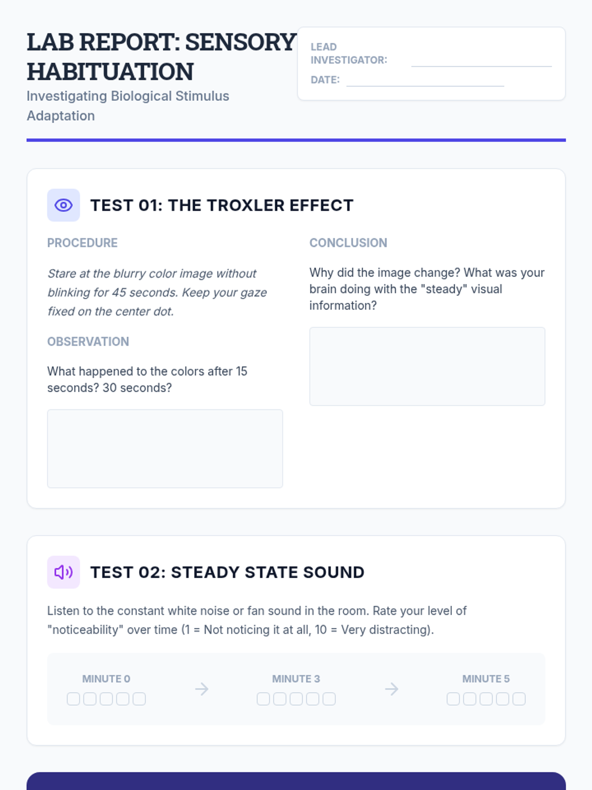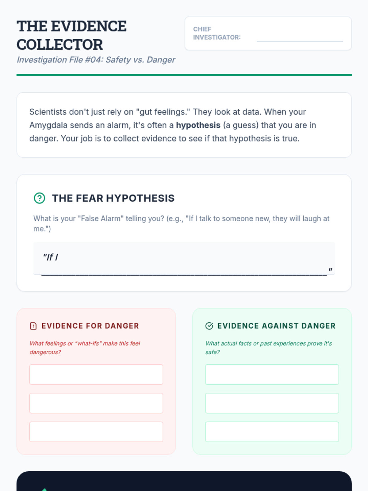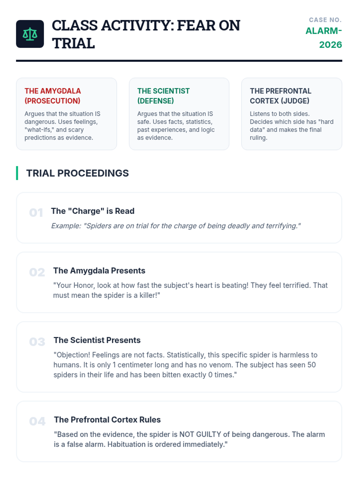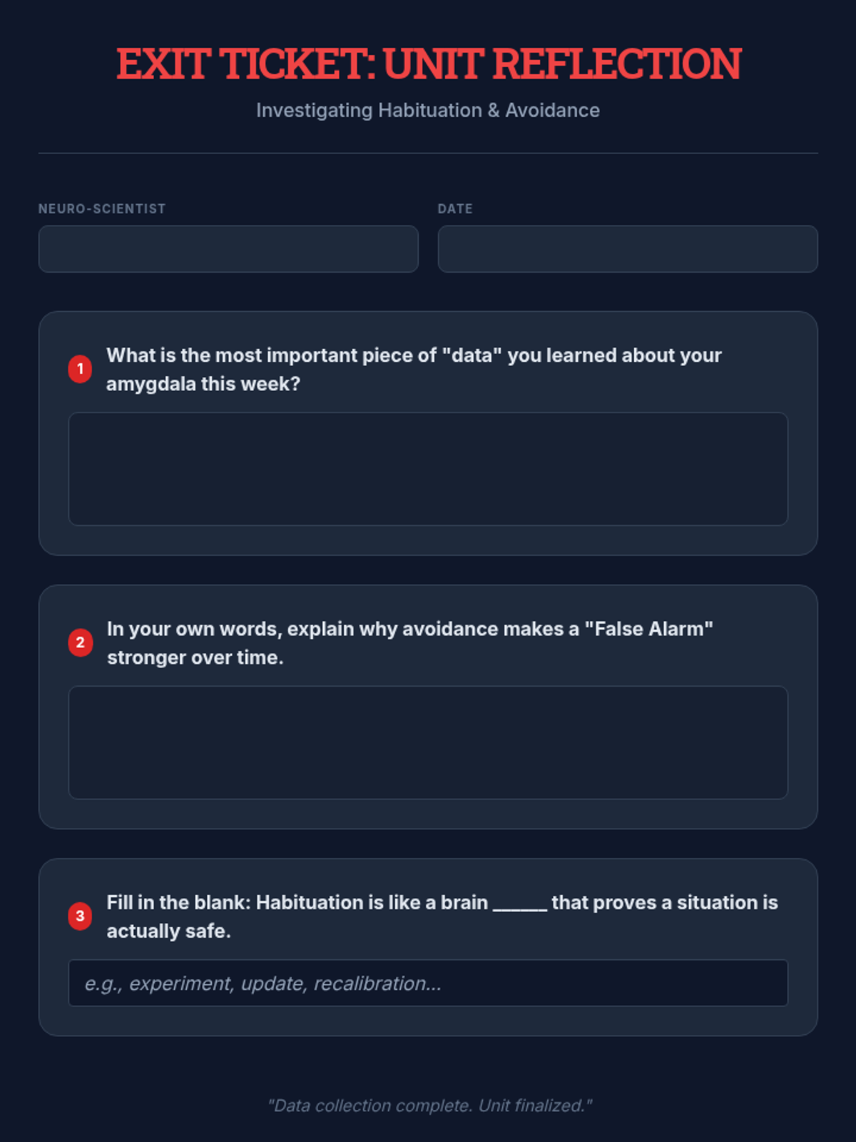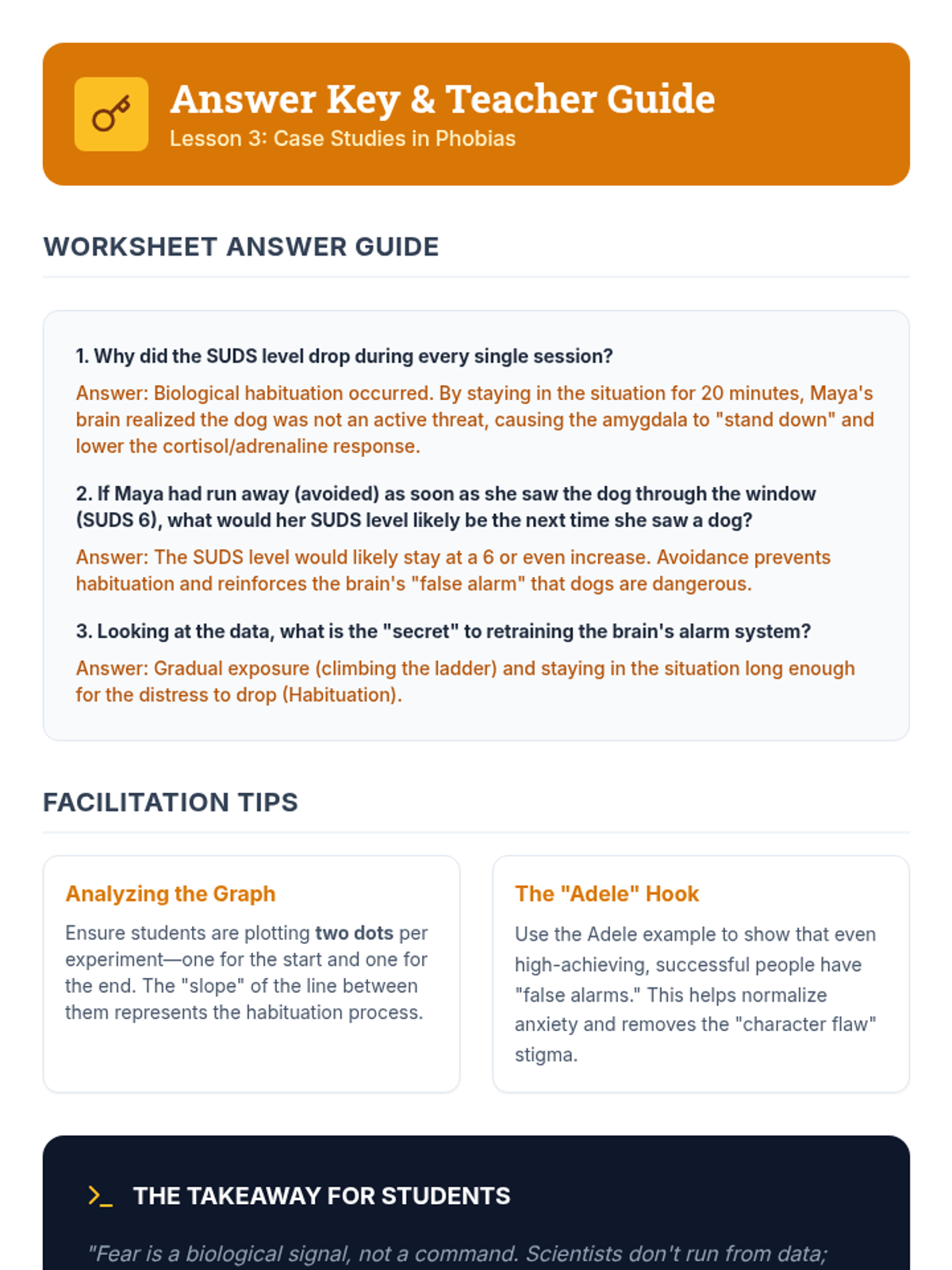 A scientific, inquiry-based exploration of anxiety, the amygdala, and habituation. Students learn how the brain's alarm system works and how to retrain it through evidence-based exposure hierarchies.