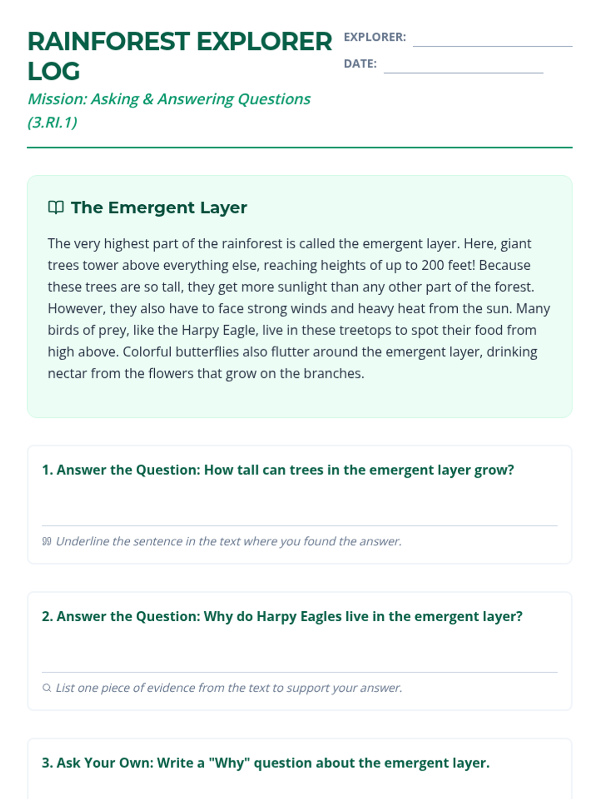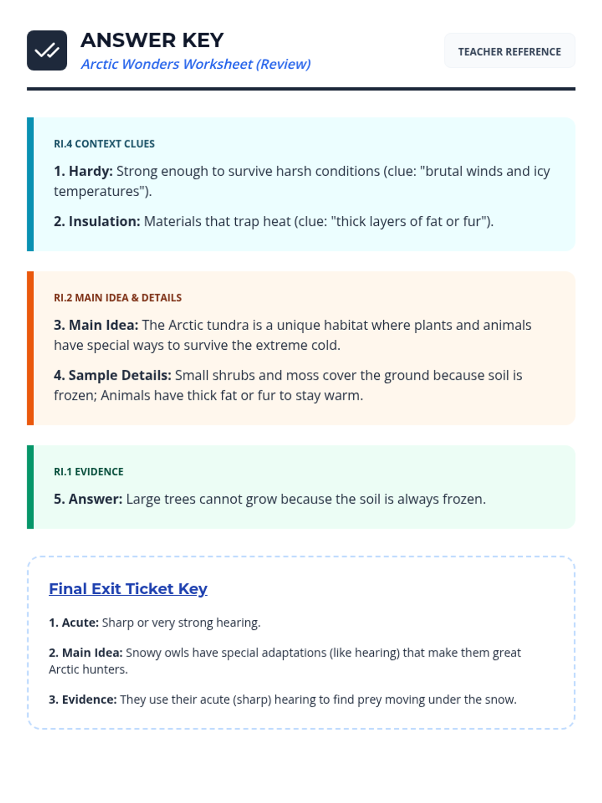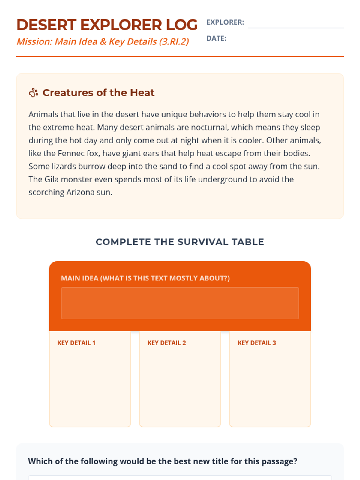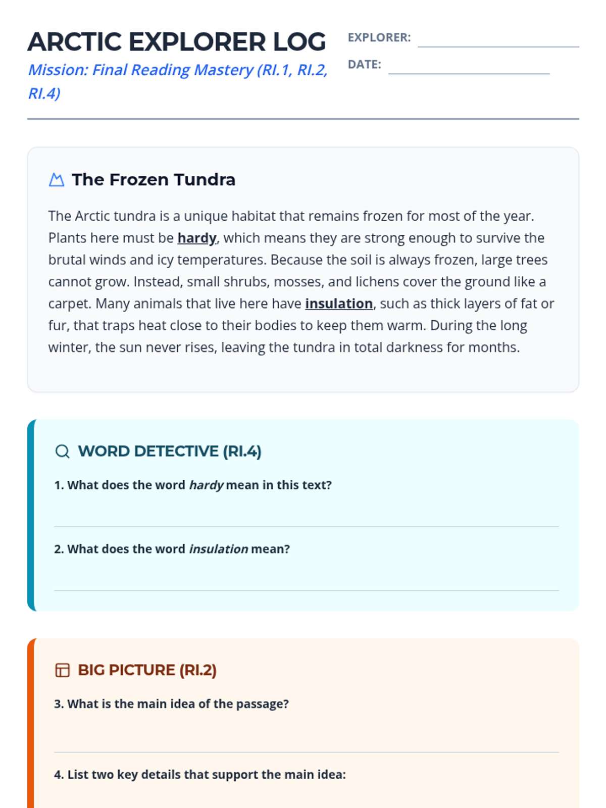 A 4-day science-themed reading sequence focusing on Arizona standards for informational text: asking and answering questions (3.RI.1), determining main ideas and key details (3.RI.2), and using context clues for vocabulary (3.RI.4). Students explore different global habitats while mastering reading comprehension skills.