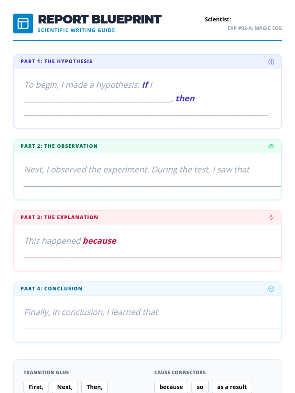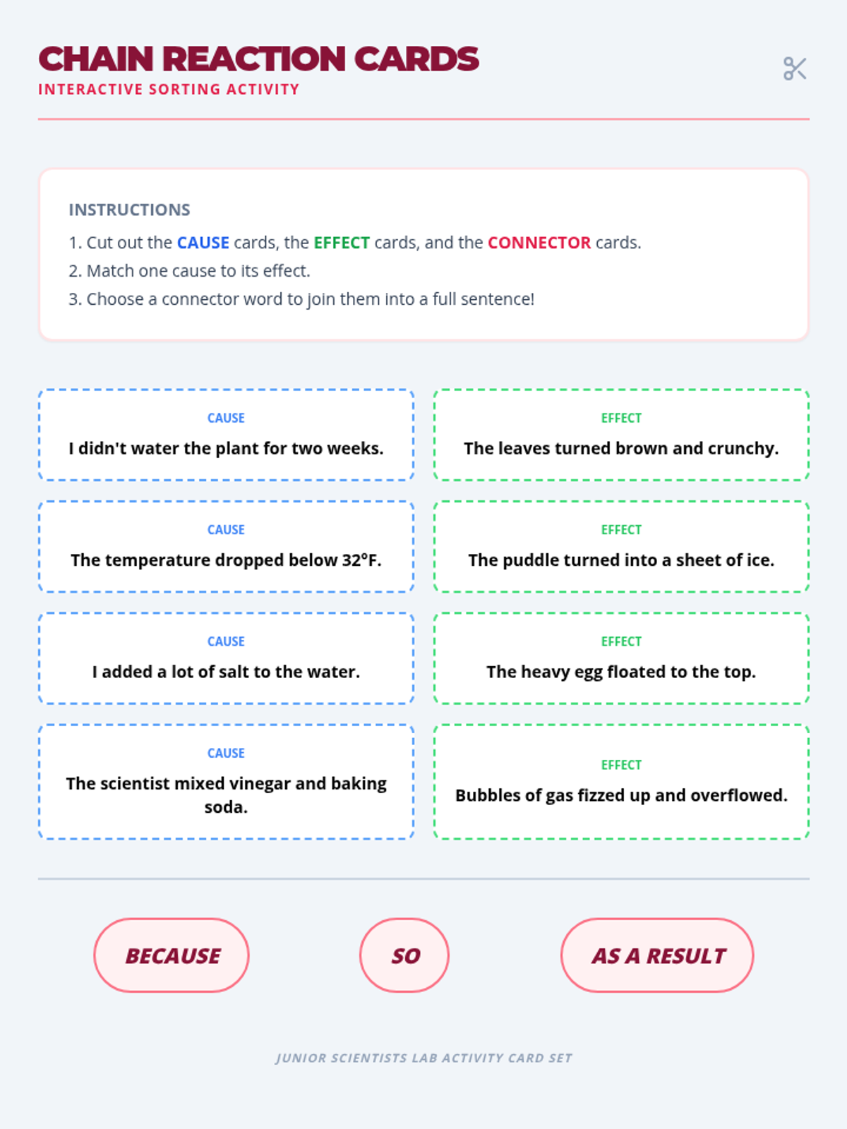 This inquiry-based sequence focuses on the specific language structures required to describe scientific phenomena, specifically cause-and-effect relationships and hypothesis generation for 3rd-grade ESL students. Students progress from sensory observation and vocabulary building to using complex sentence frames and drafting full scientific explanations.