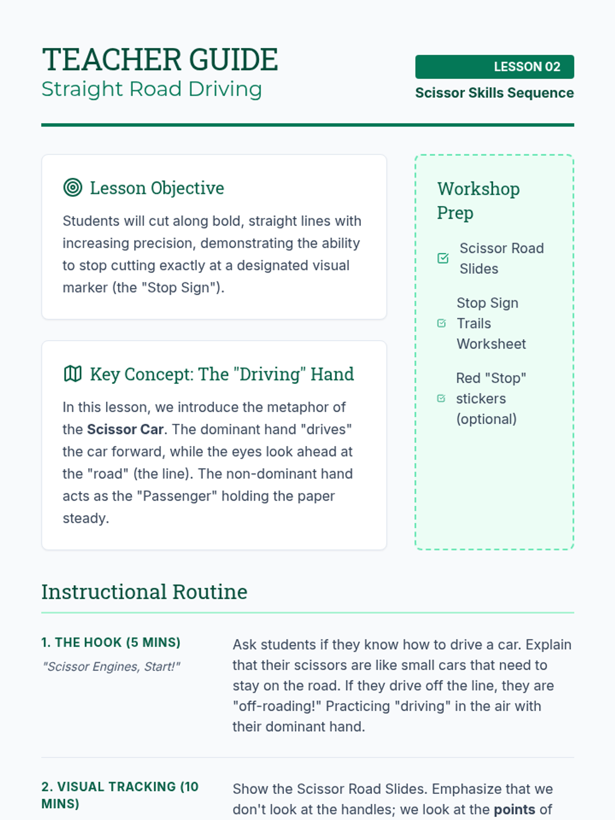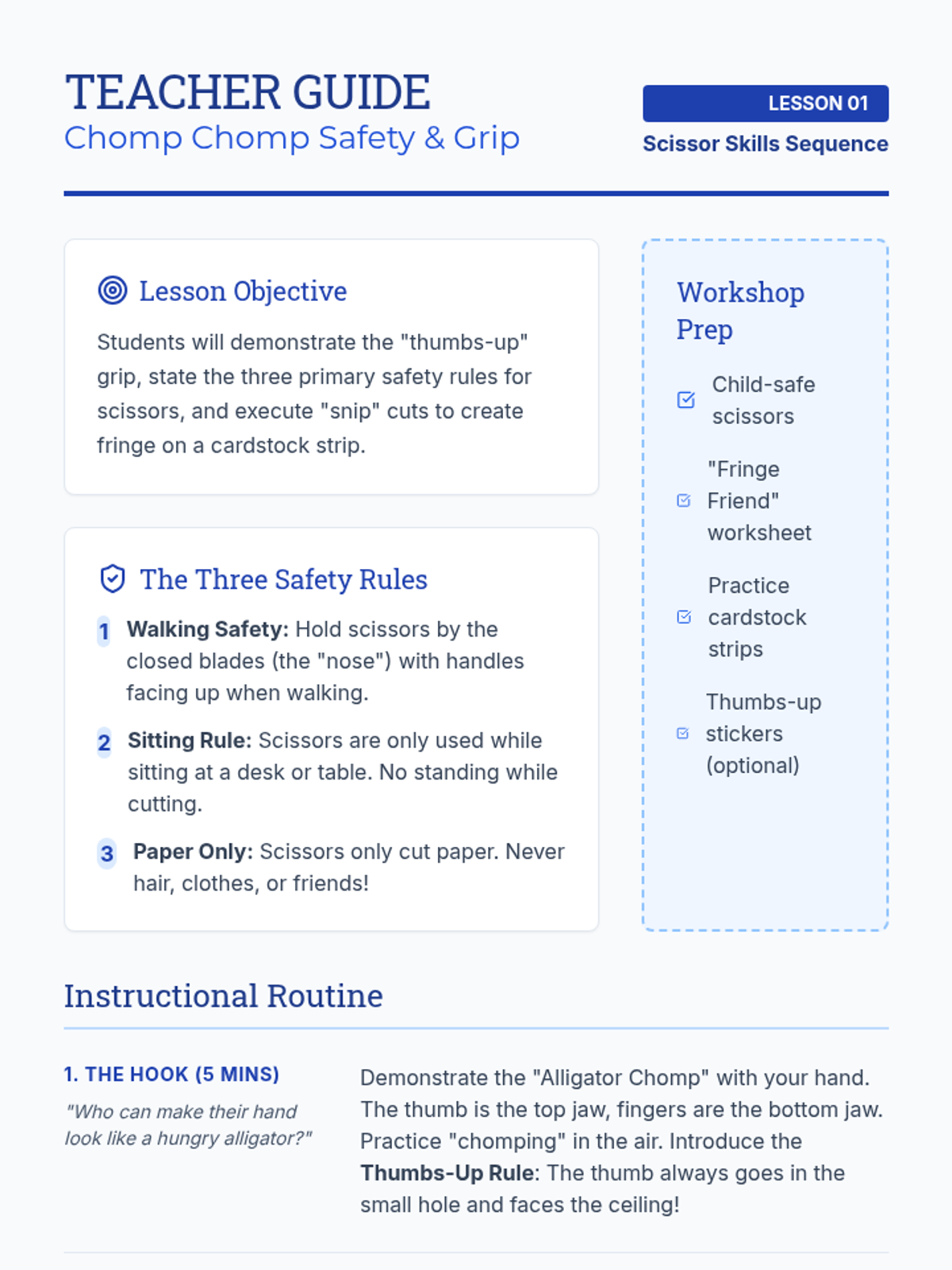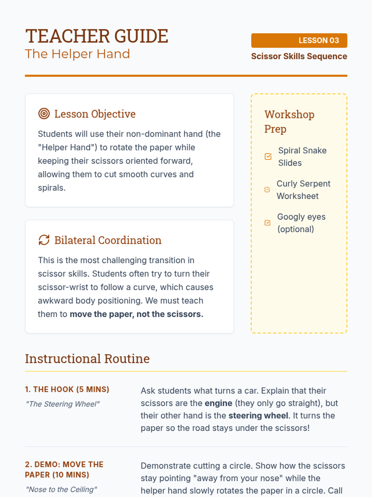 This 1st Grade sequence focuses on the development of bilateral coordination and precise cutting skills through a progression of five structured lessons. Students move from basic safety and grip mechanics to complex shape navigation, culminating in a creative assembly project.