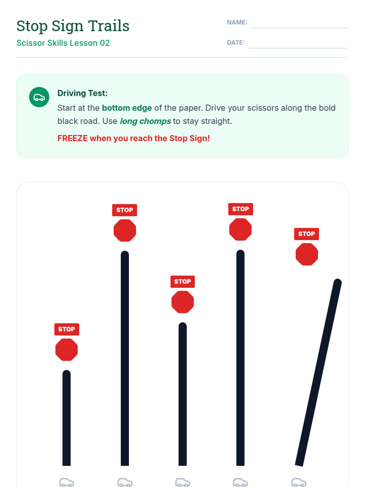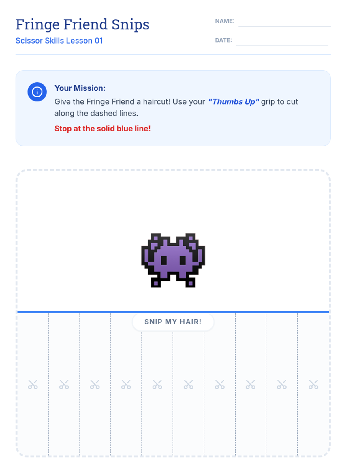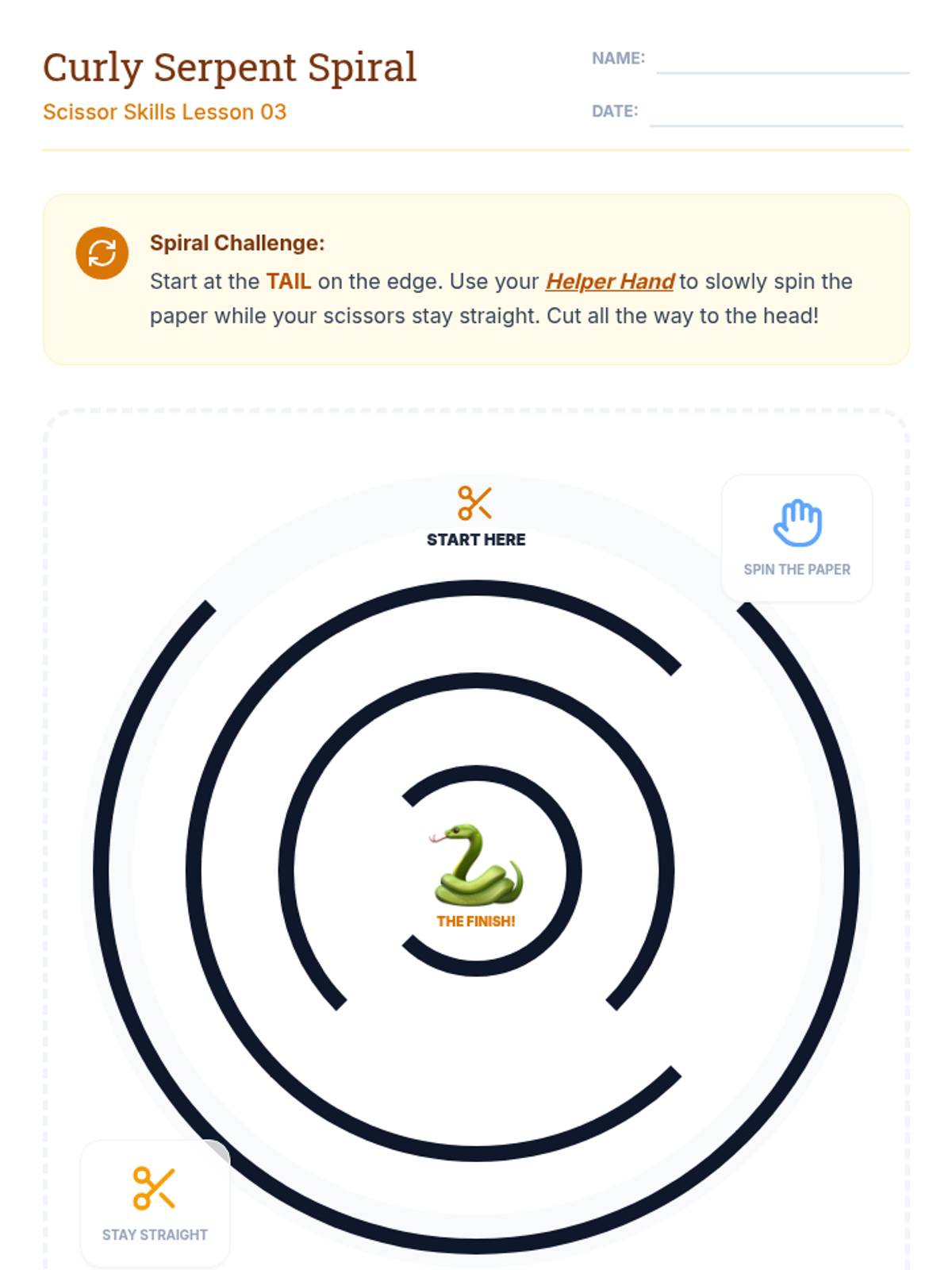 This 1st Grade sequence focuses on the development of bilateral coordination and precise cutting skills through a progression of five structured lessons. Students move from basic safety and grip mechanics to complex shape navigation, culminating in a creative assembly project.