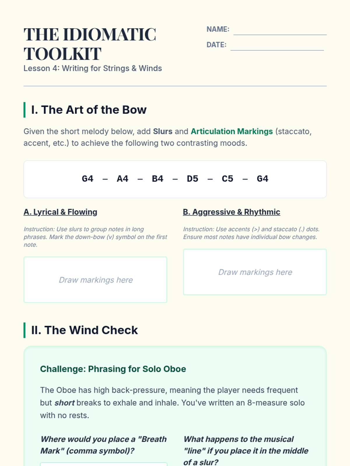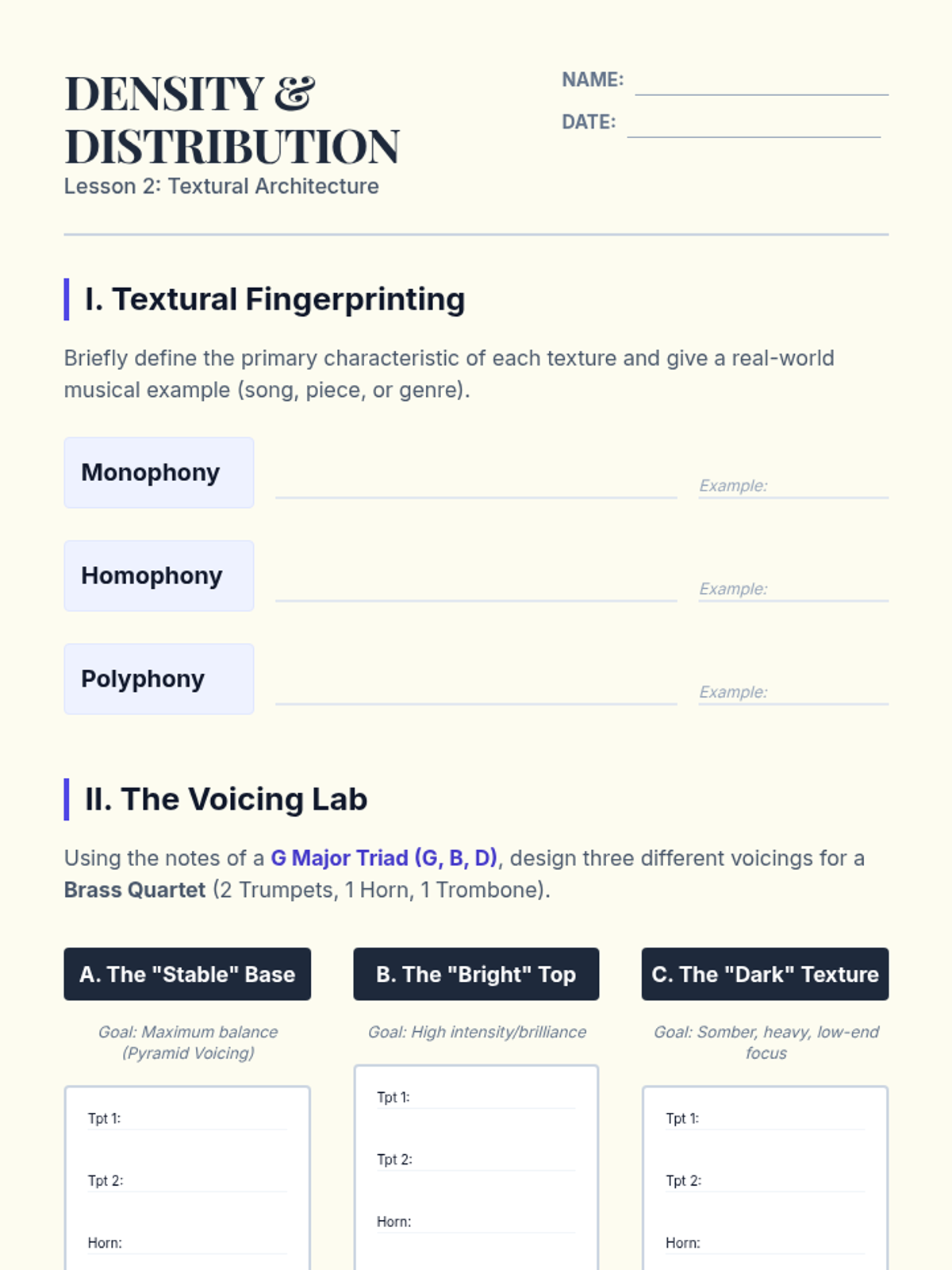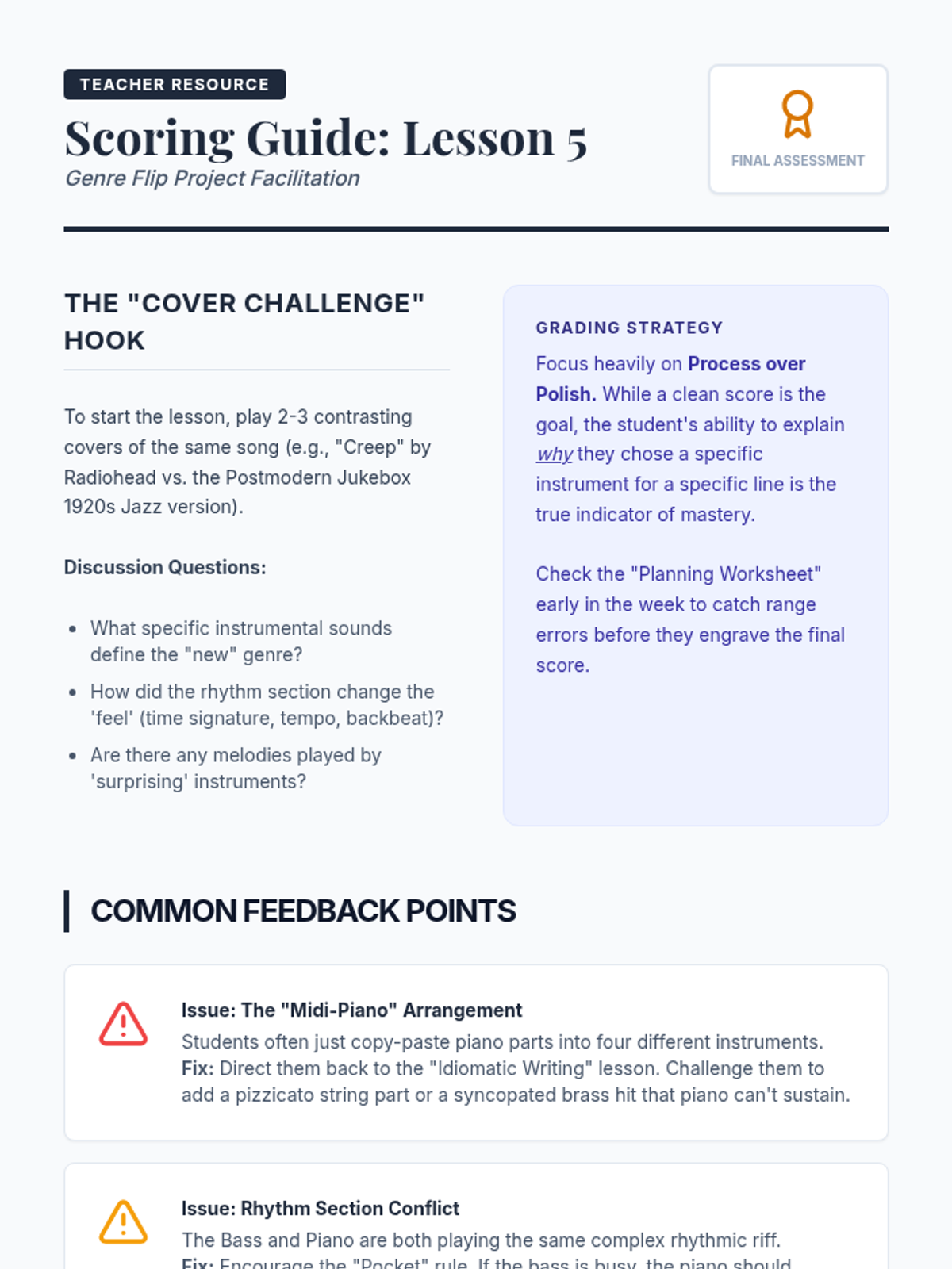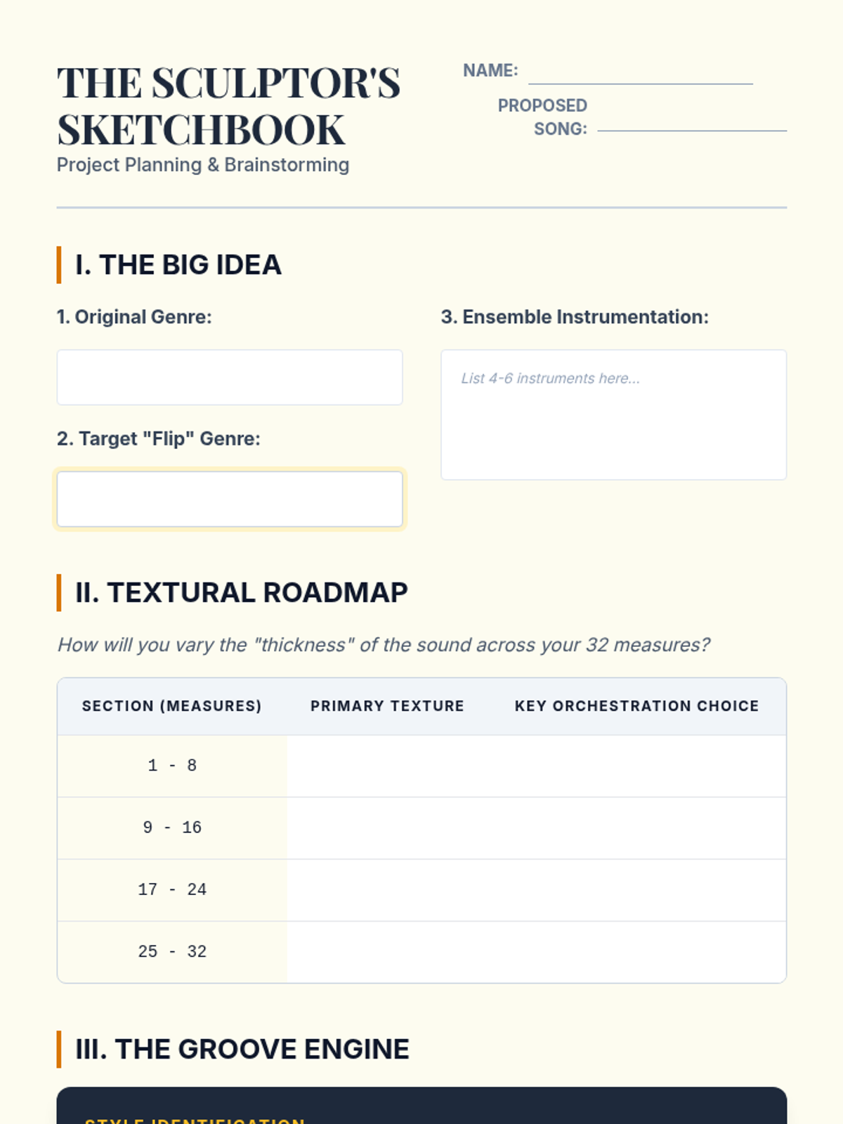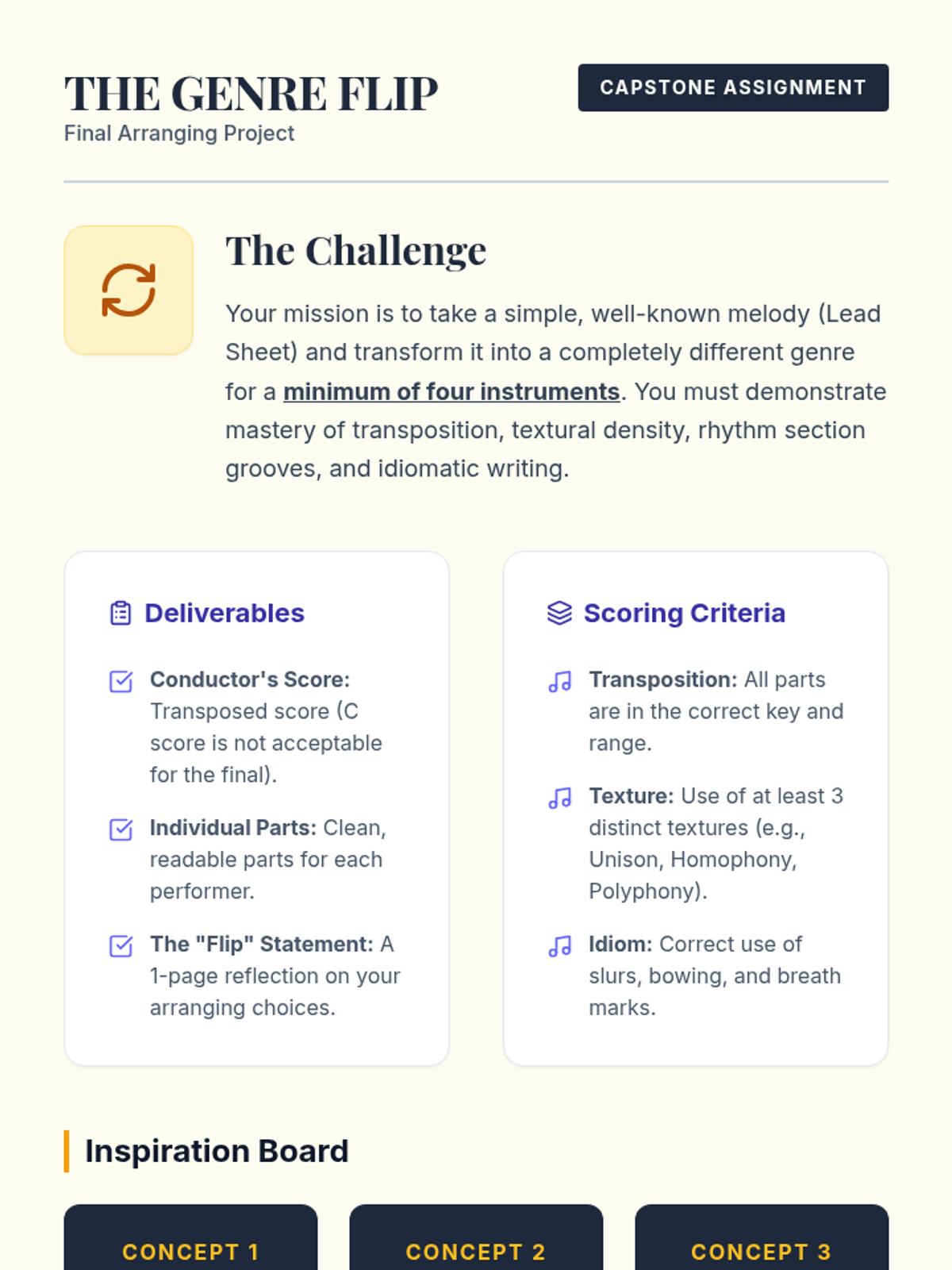 A comprehensive 12th-grade music composition sequence focusing on the art of arranging and orchestration. Students learn to adapt musical ideas for various ensembles, mastering instrument ranges, transpositions, and textural layering to redefine a work's genre and identity.