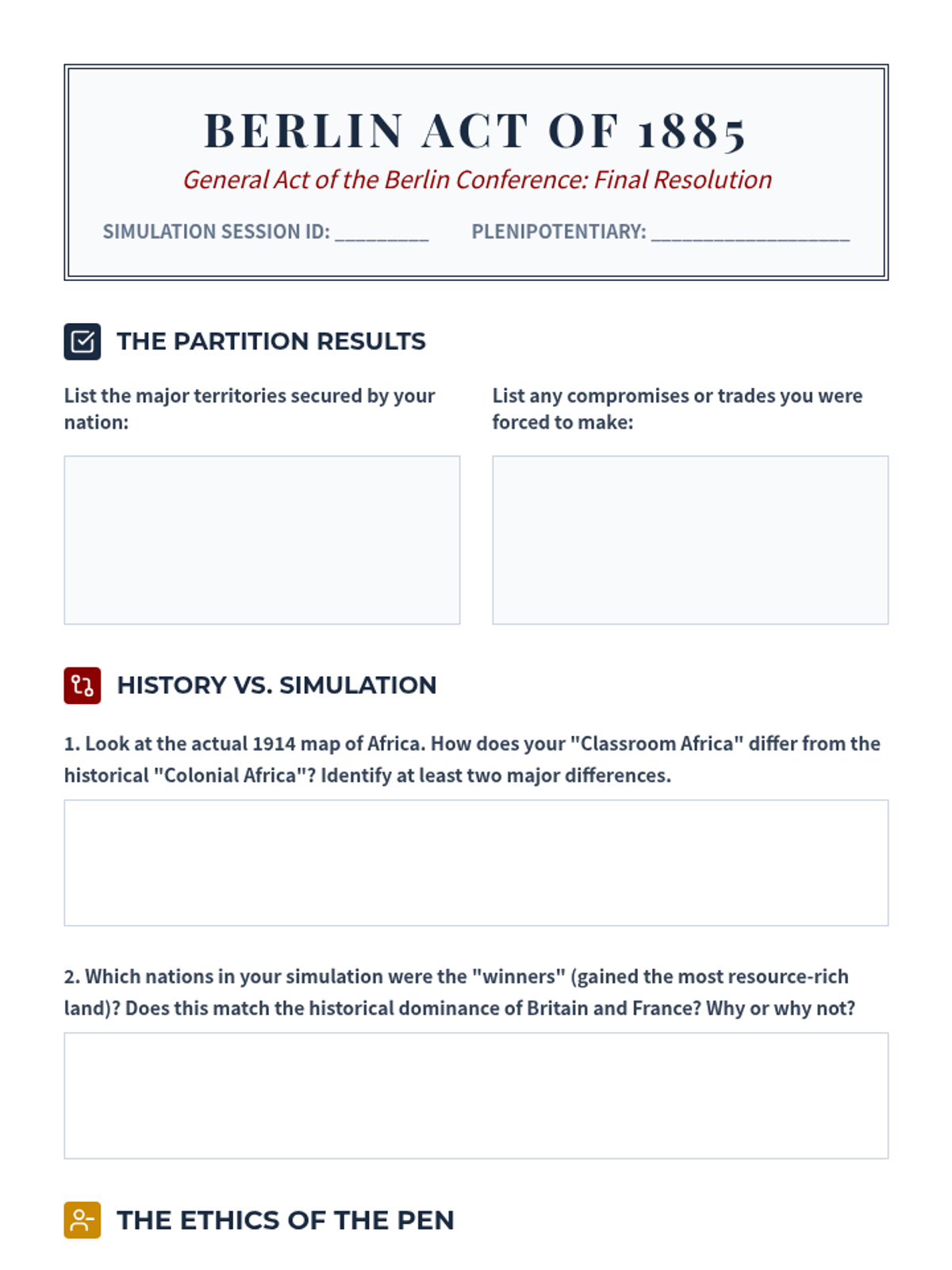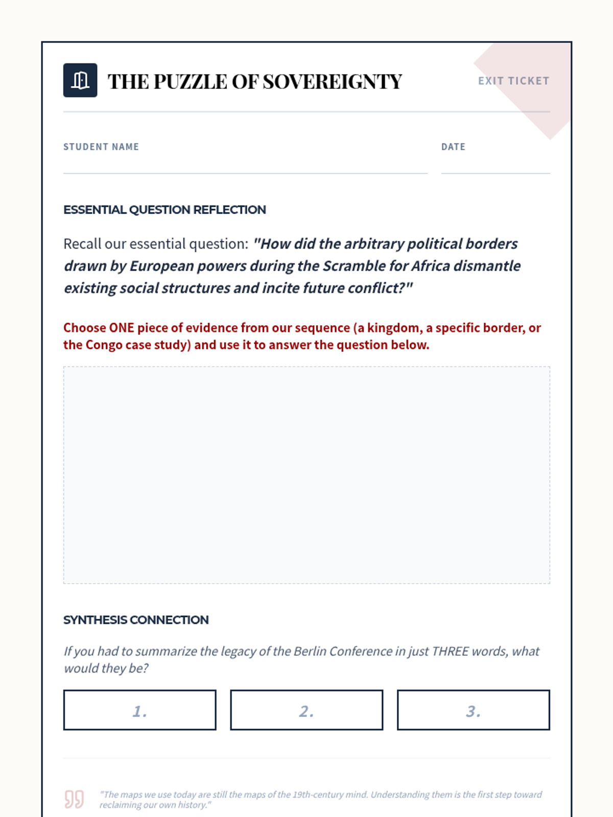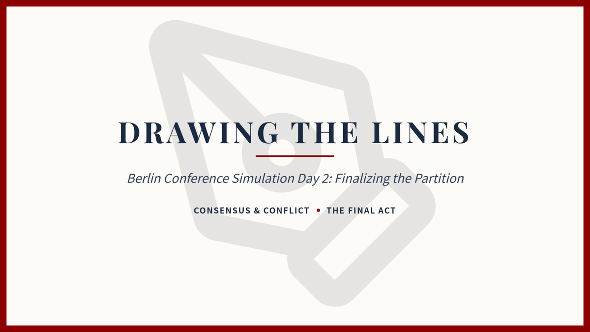 An immersive 11th-grade history sequence exploring the Scramble for Africa through a classroom simulation of the Berlin Conference. Students analyze pre-colonial African complexity, simulate the arbitrary redrawing of borders, and evaluate the long-term geopolitical and humanitarian consequences of European imperialism.