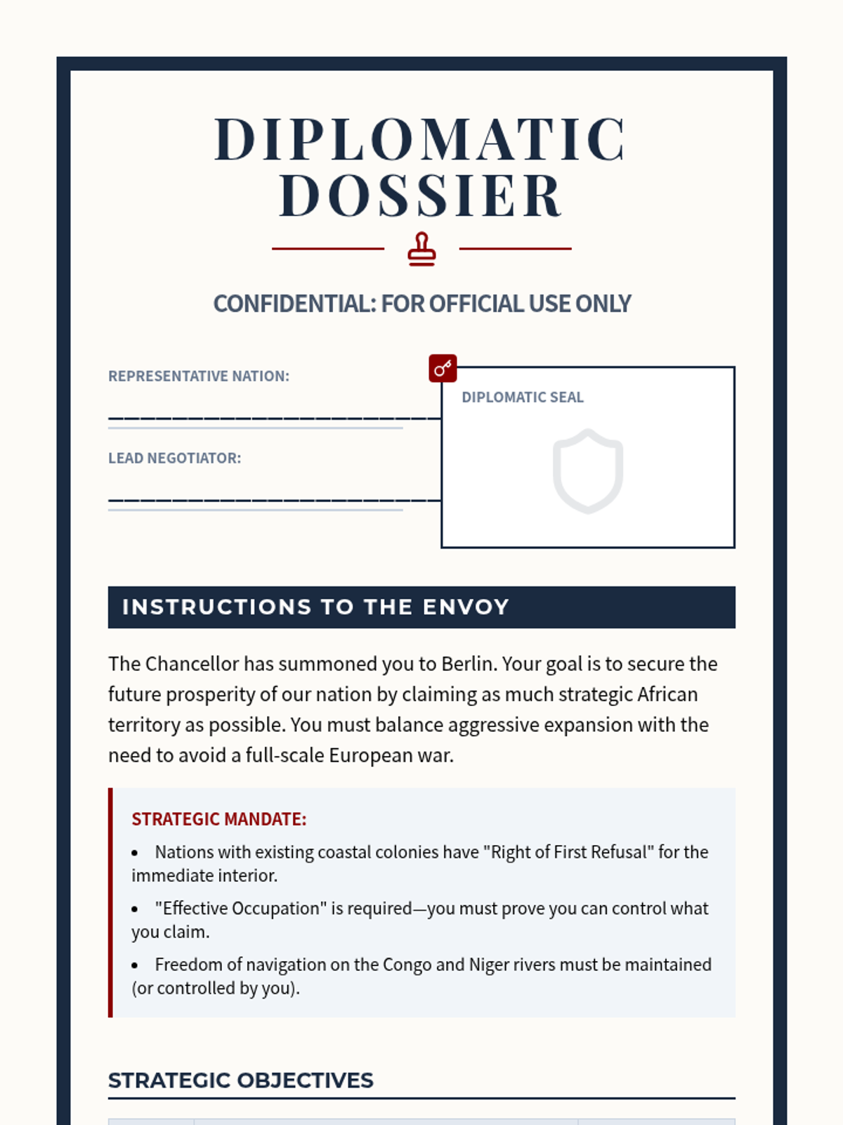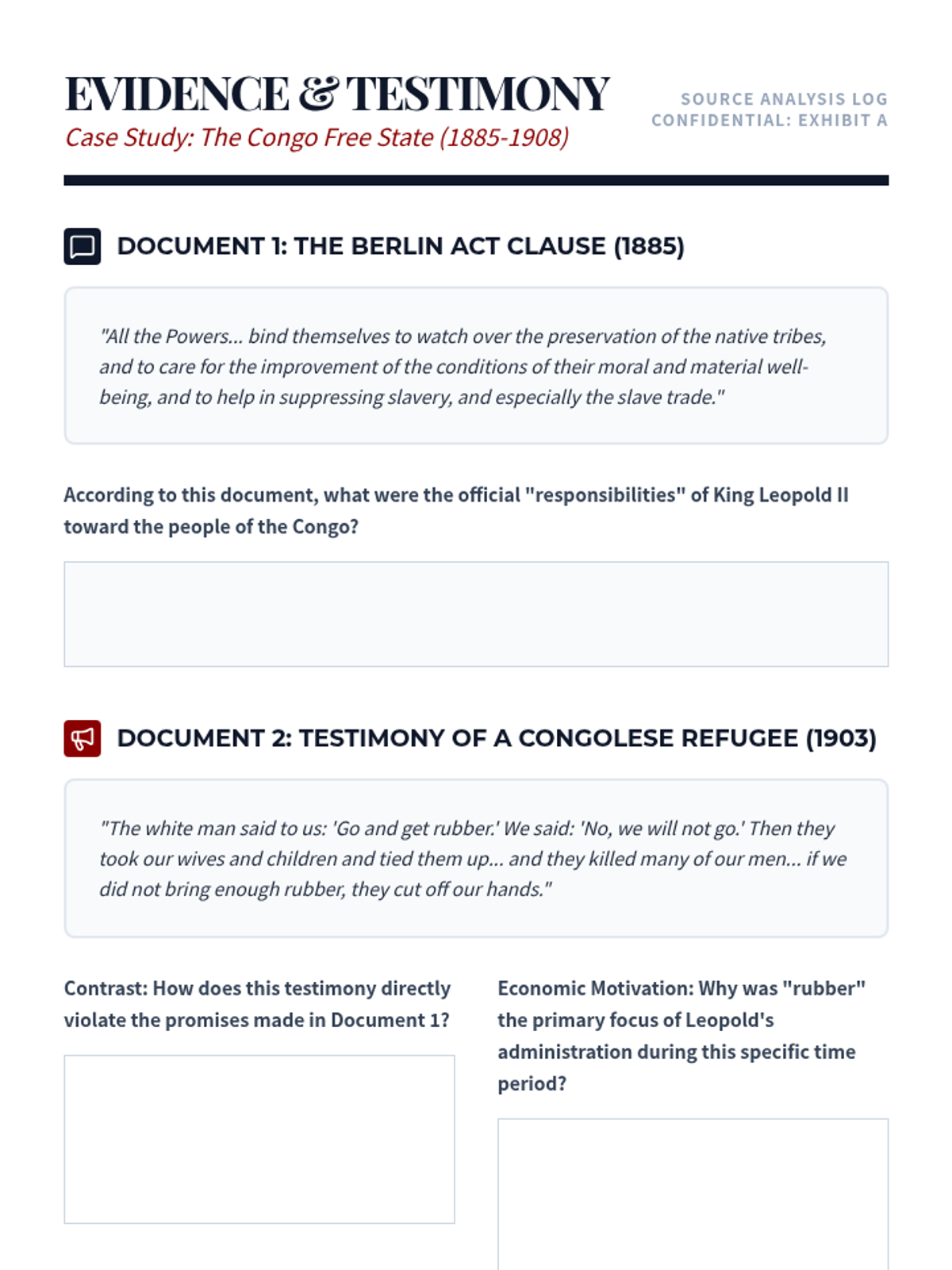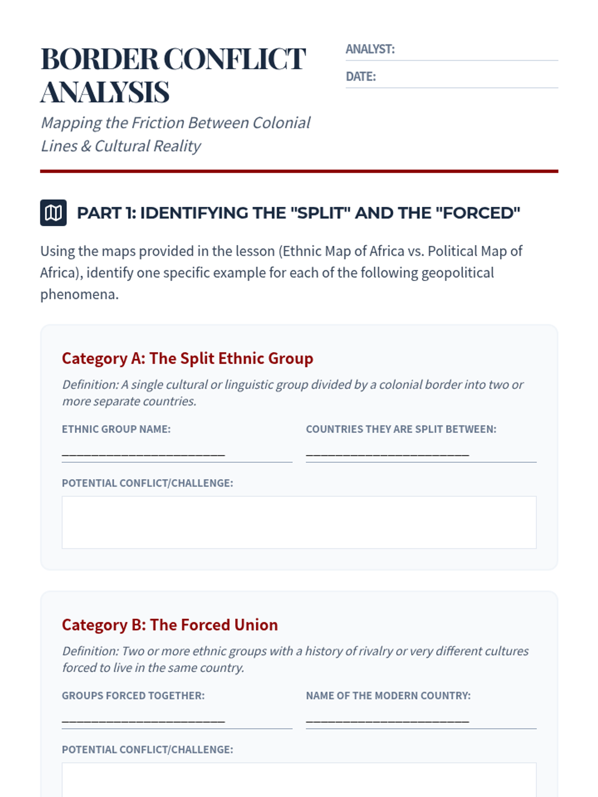 An immersive 11th-grade history sequence exploring the Scramble for Africa through a classroom simulation of the Berlin Conference. Students analyze pre-colonial African complexity, simulate the arbitrary redrawing of borders, and evaluate the long-term geopolitical and humanitarian consequences of European imperialism.