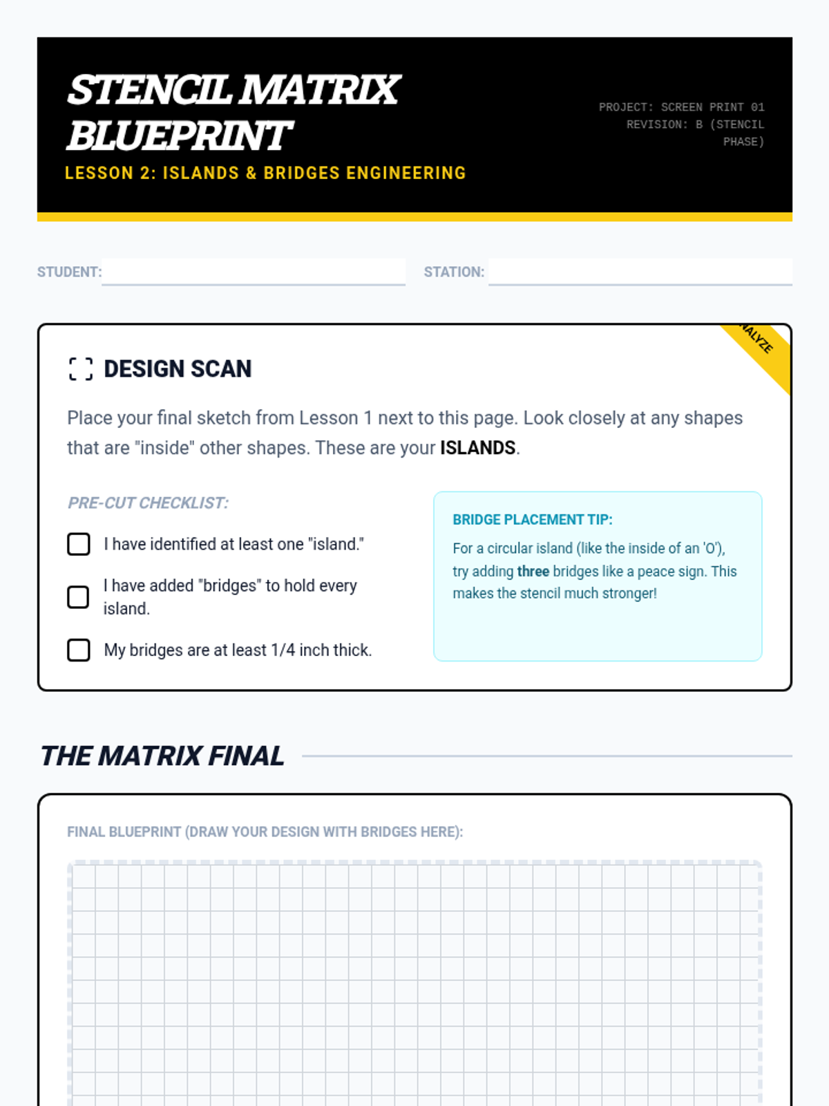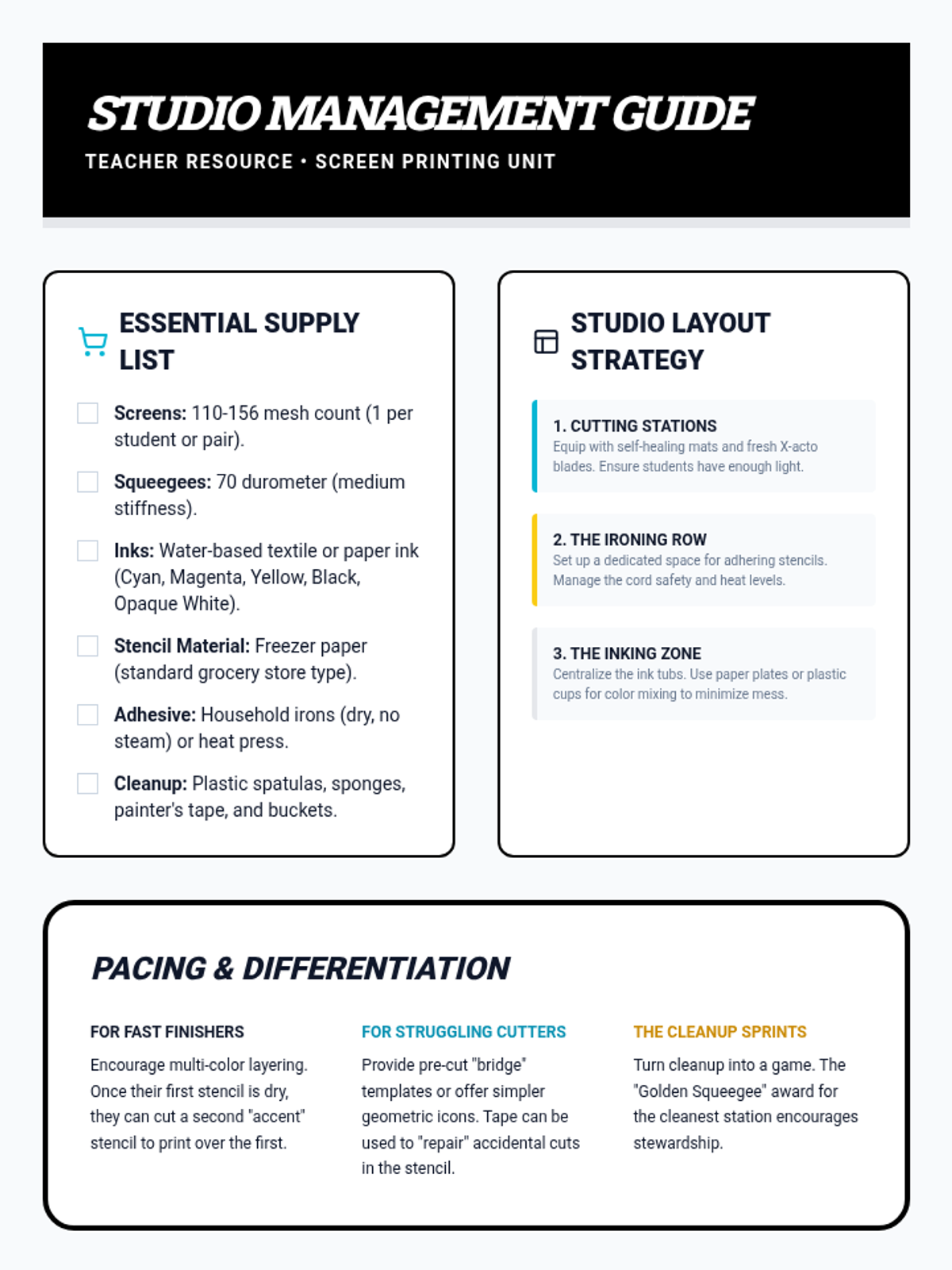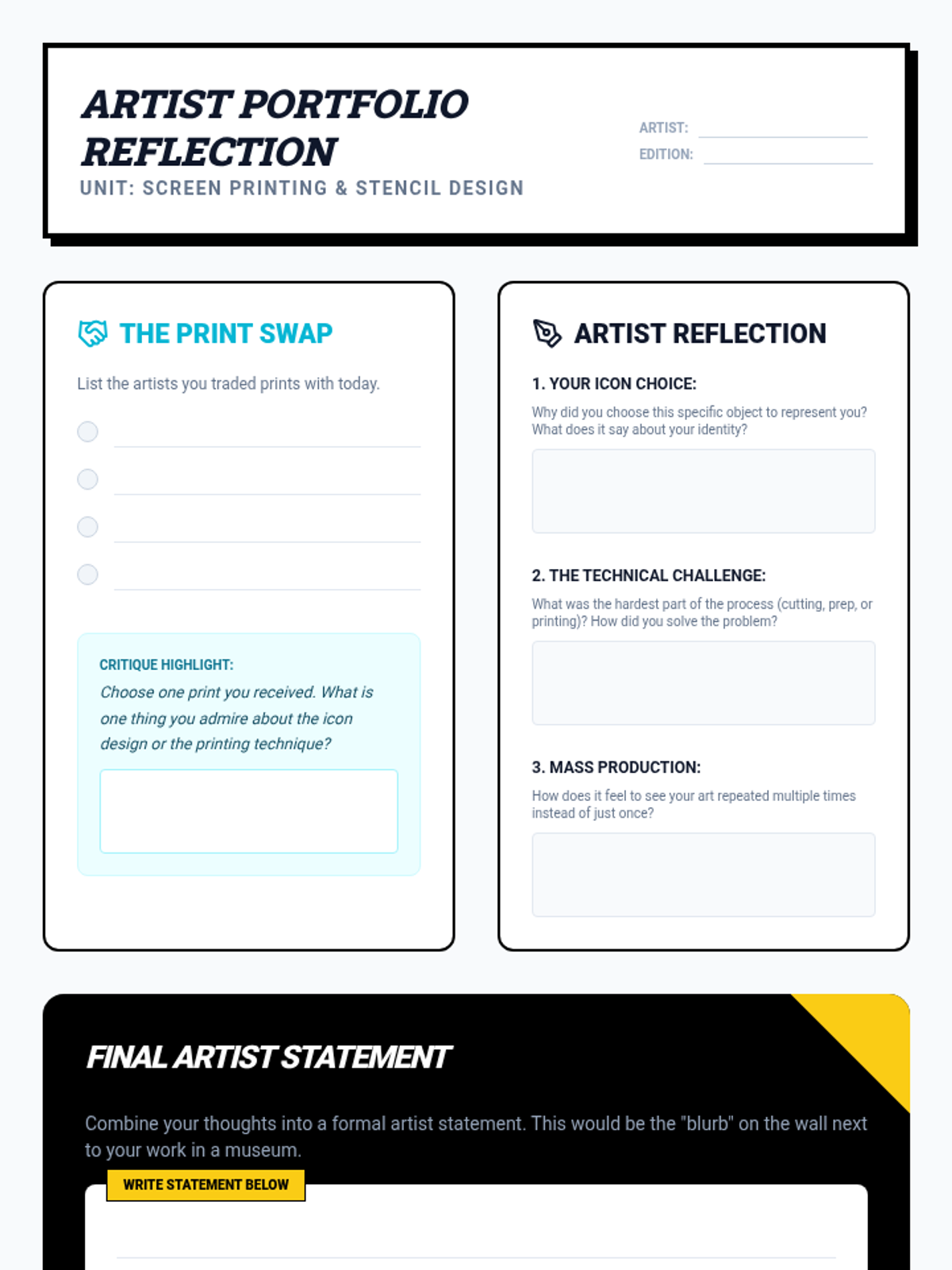 A project-based unit where 6th-grade students explore the intersection of Pop Art and graphic design. They learn stencil-based screen printing techniques to produce bold, reproducible icons on paper or fabric.