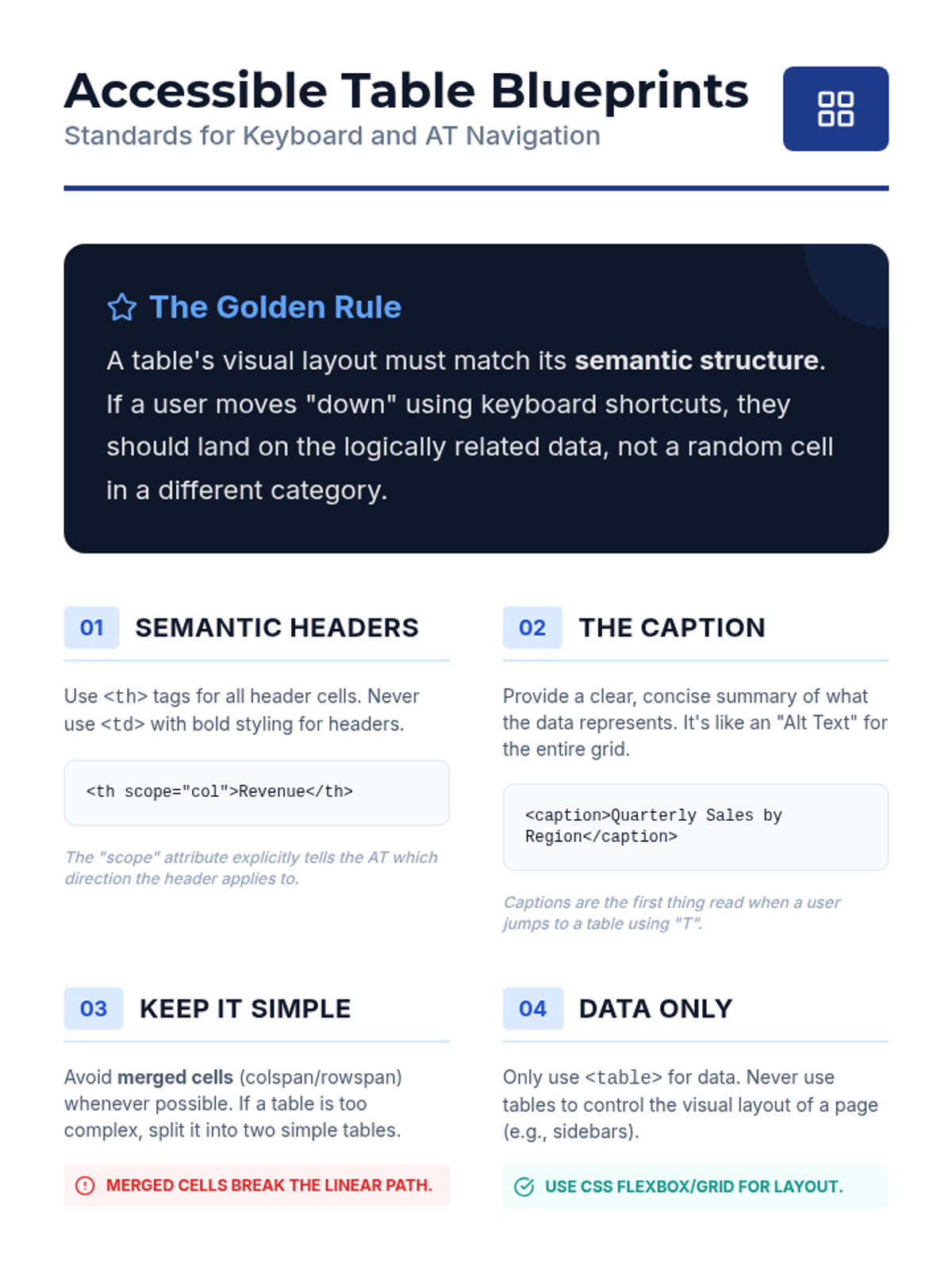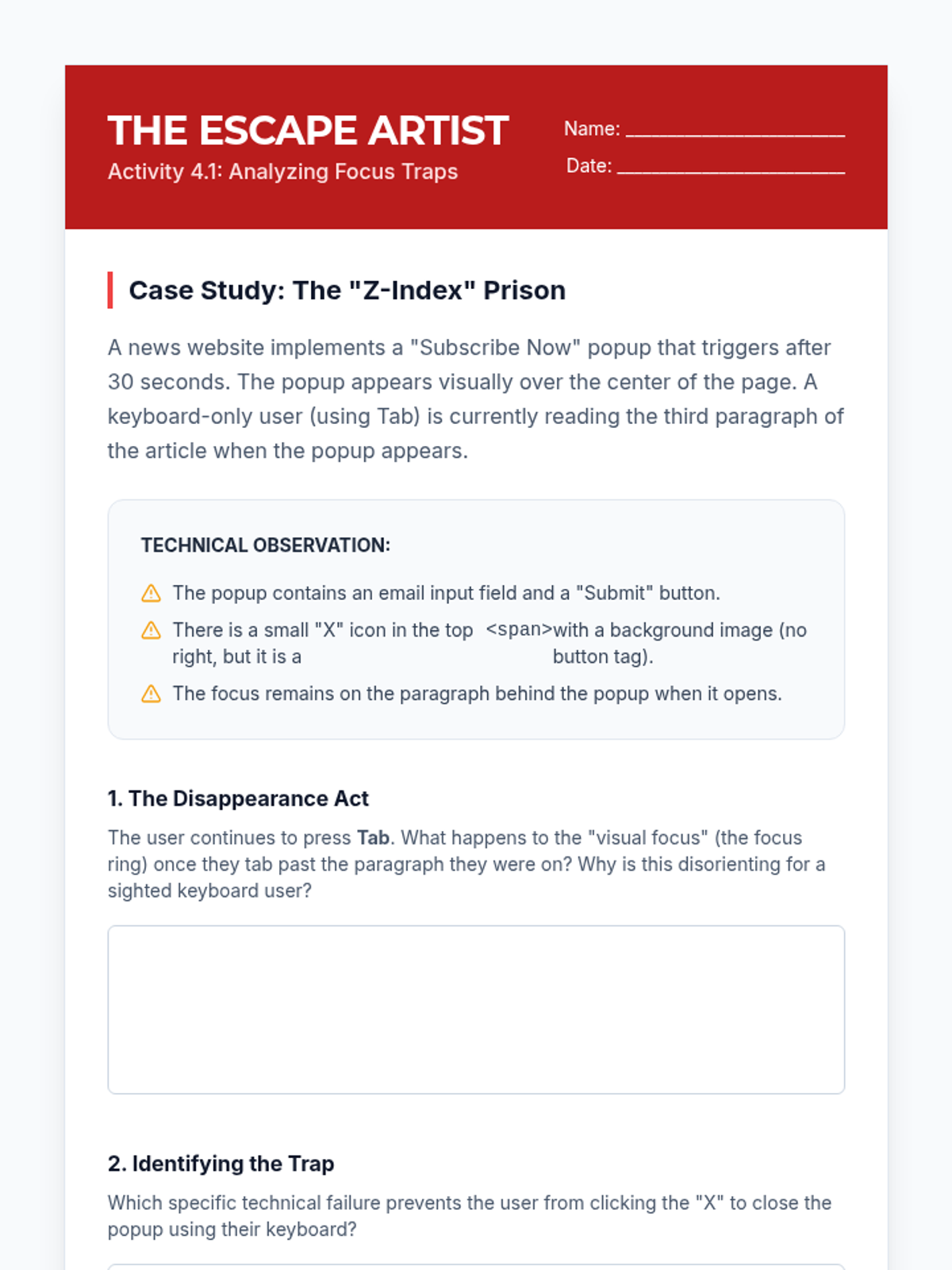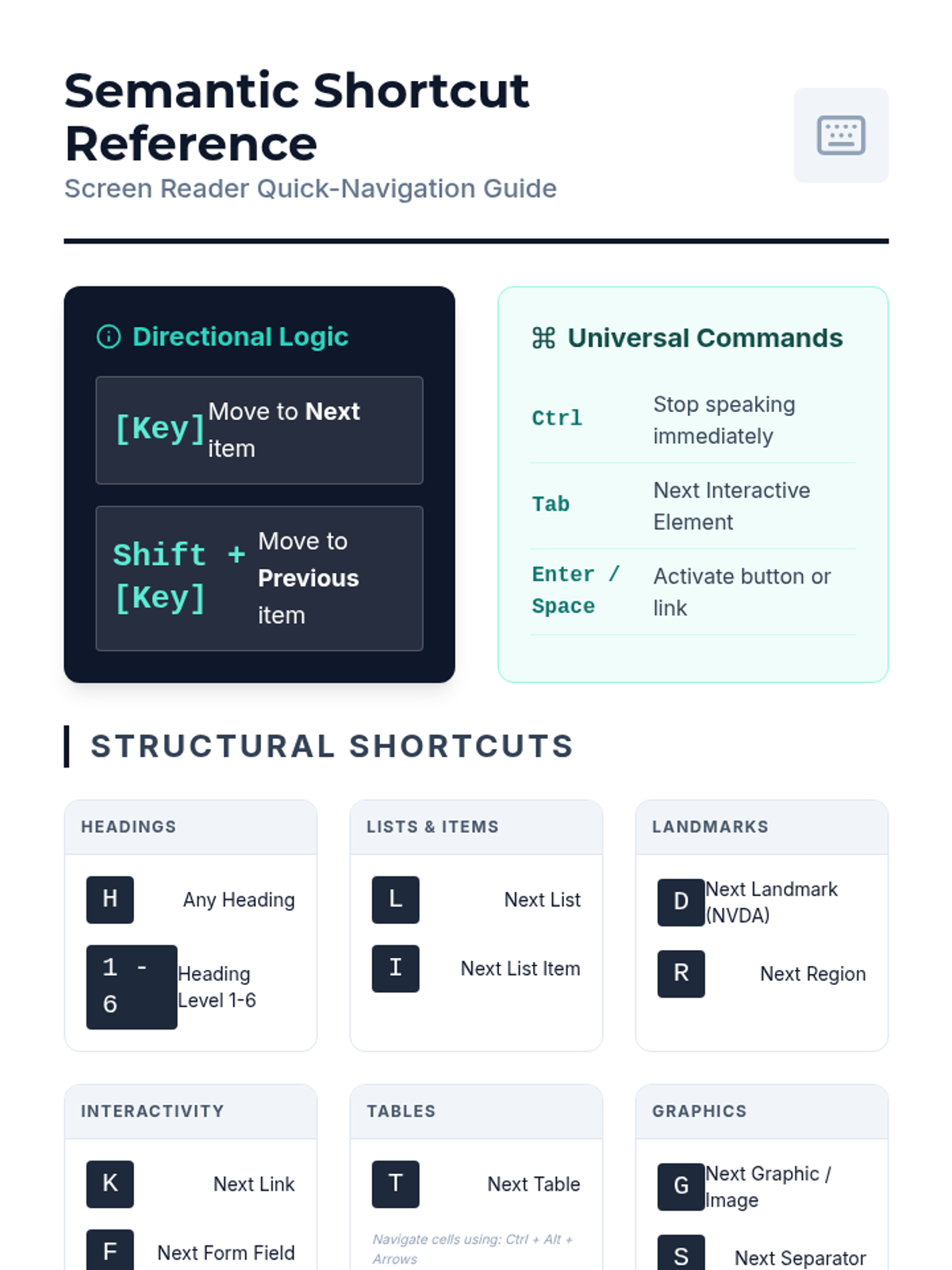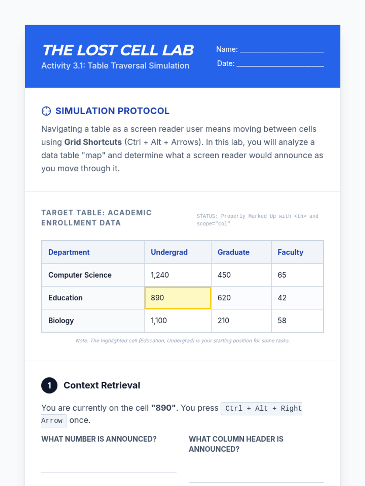 This sequence introduces undergraduate students to the critical role of keyboard navigation in assistive technology, specifically focusing on screen reader interaction. Students will analyze semantic navigation, table traversal, and focus traps to understand how to design and audit for digital accessibility.