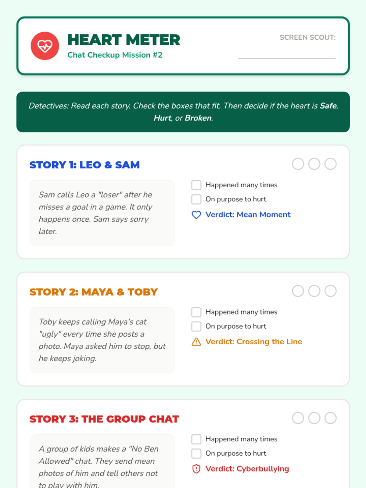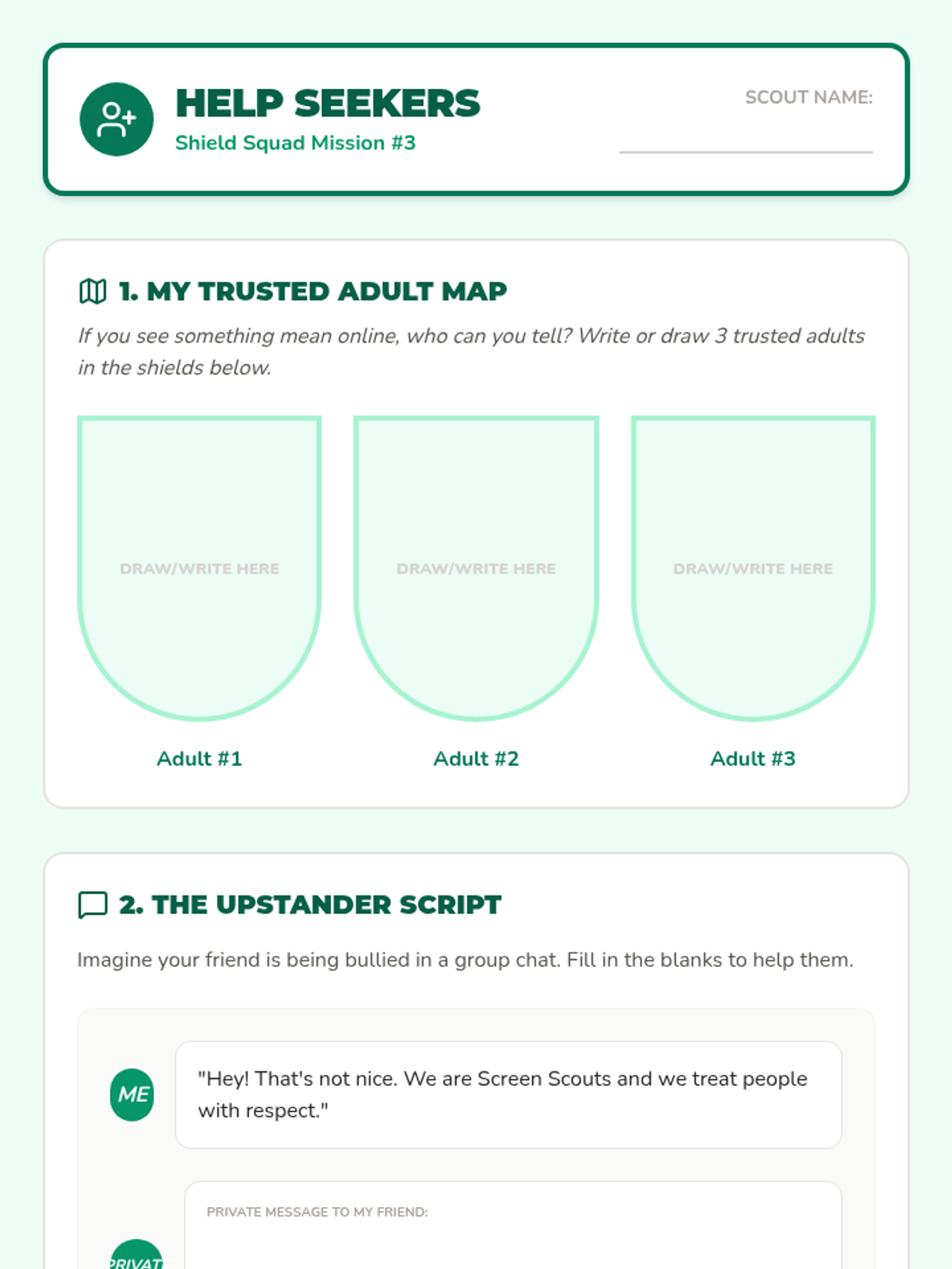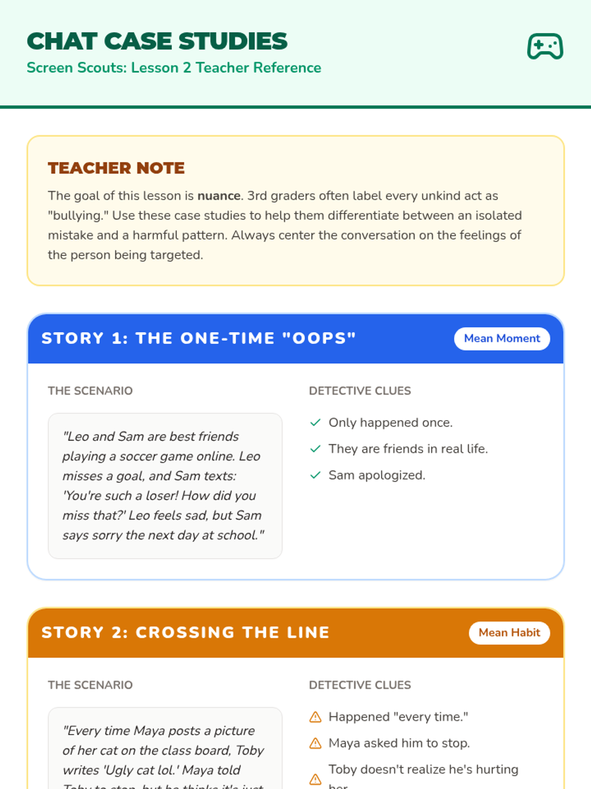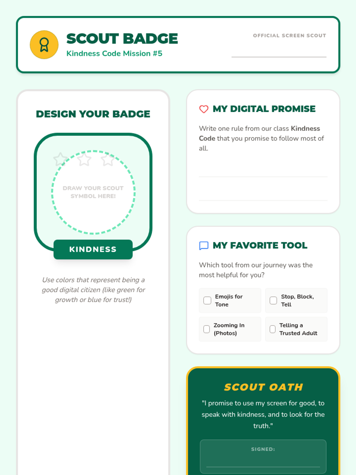 A 5-lesson sequence for 3rd graders focused on digital empathy, tone, cyberbullying prevention, media literacy, and creating a kind online community. Students learn to navigate digital spaces with kindness through the theme of being 'Screen Scouts'.