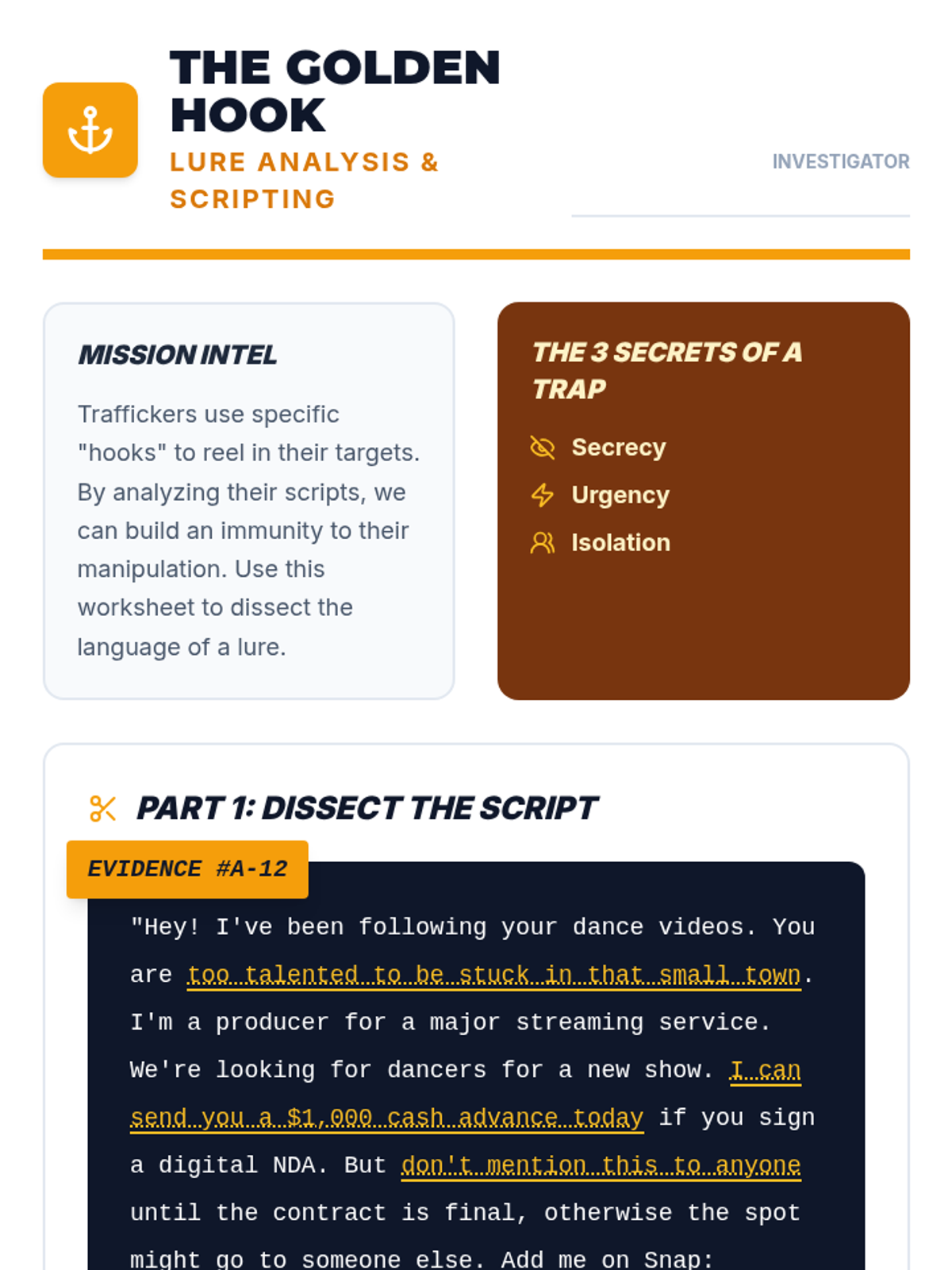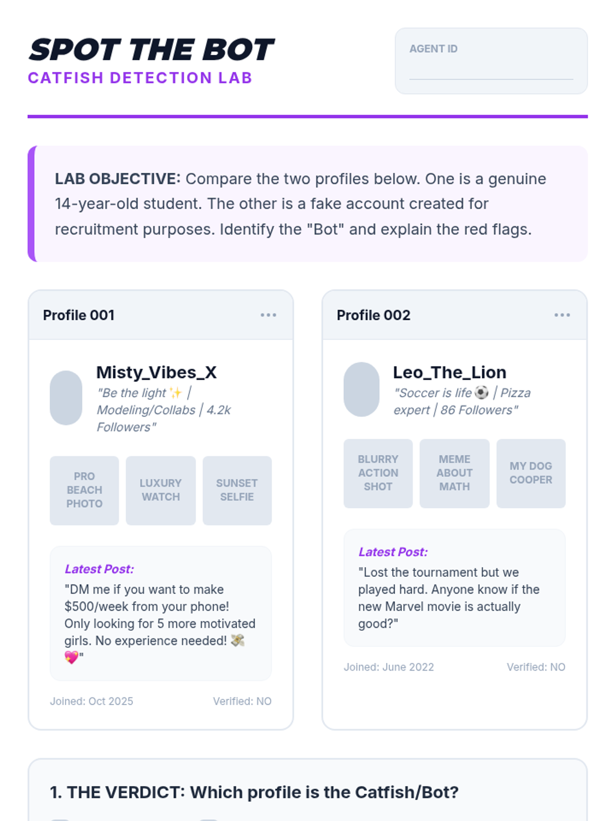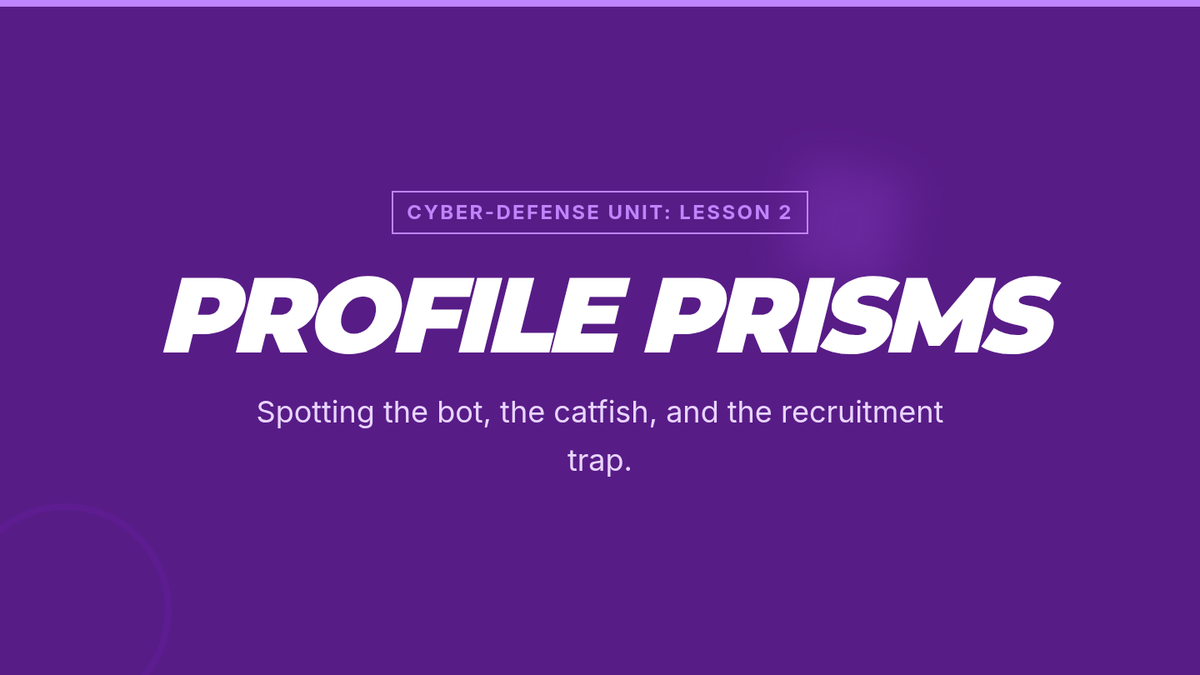A comprehensive sequence for 7th-grade students focused on identifying and resisting online grooming and recruitment tactics used by traffickers. Students develop digital literacy skills to recognize fake profiles, manipulative lures, and unsafe gaming interactions while creating a personal digital defense protocol.