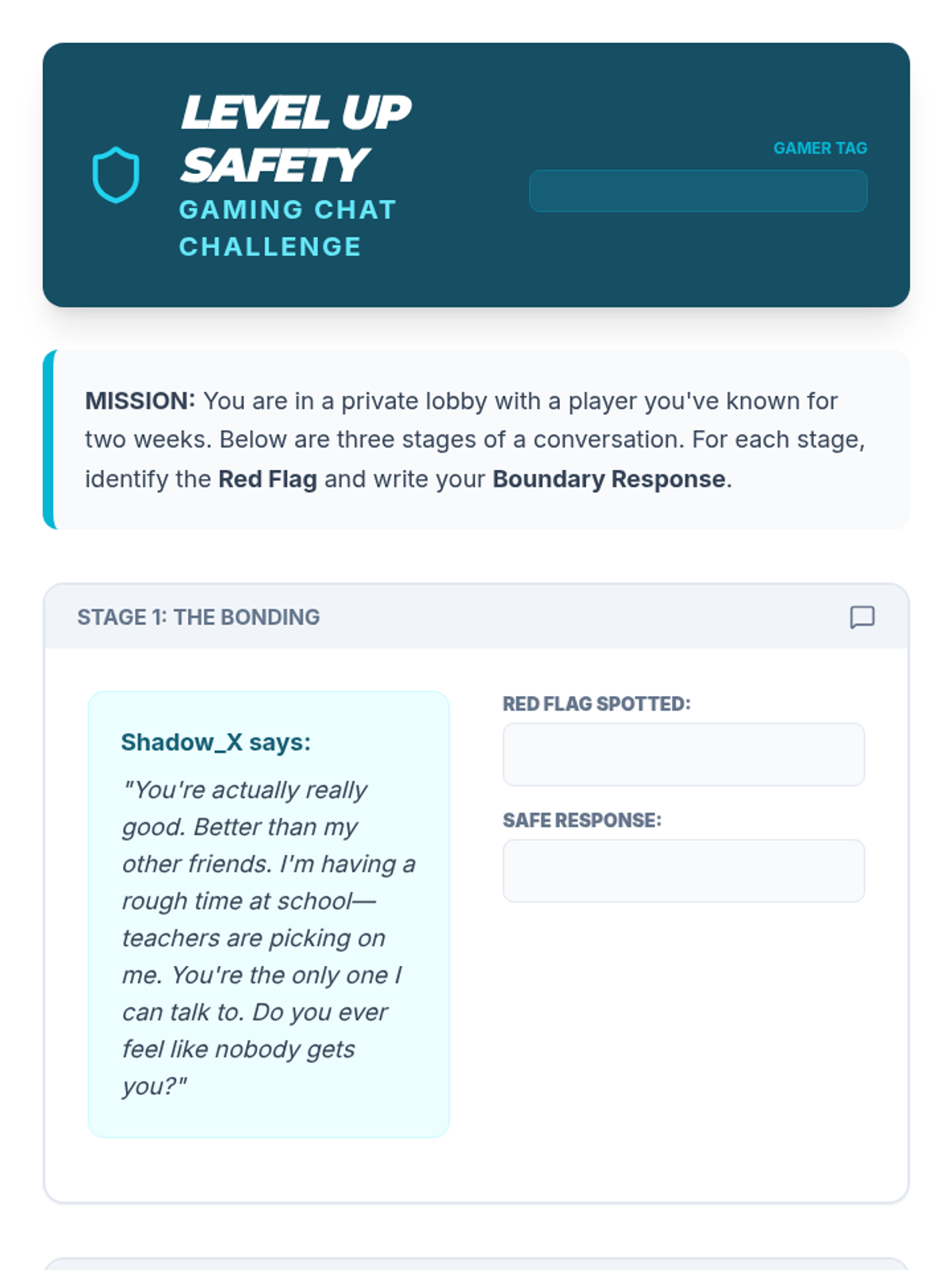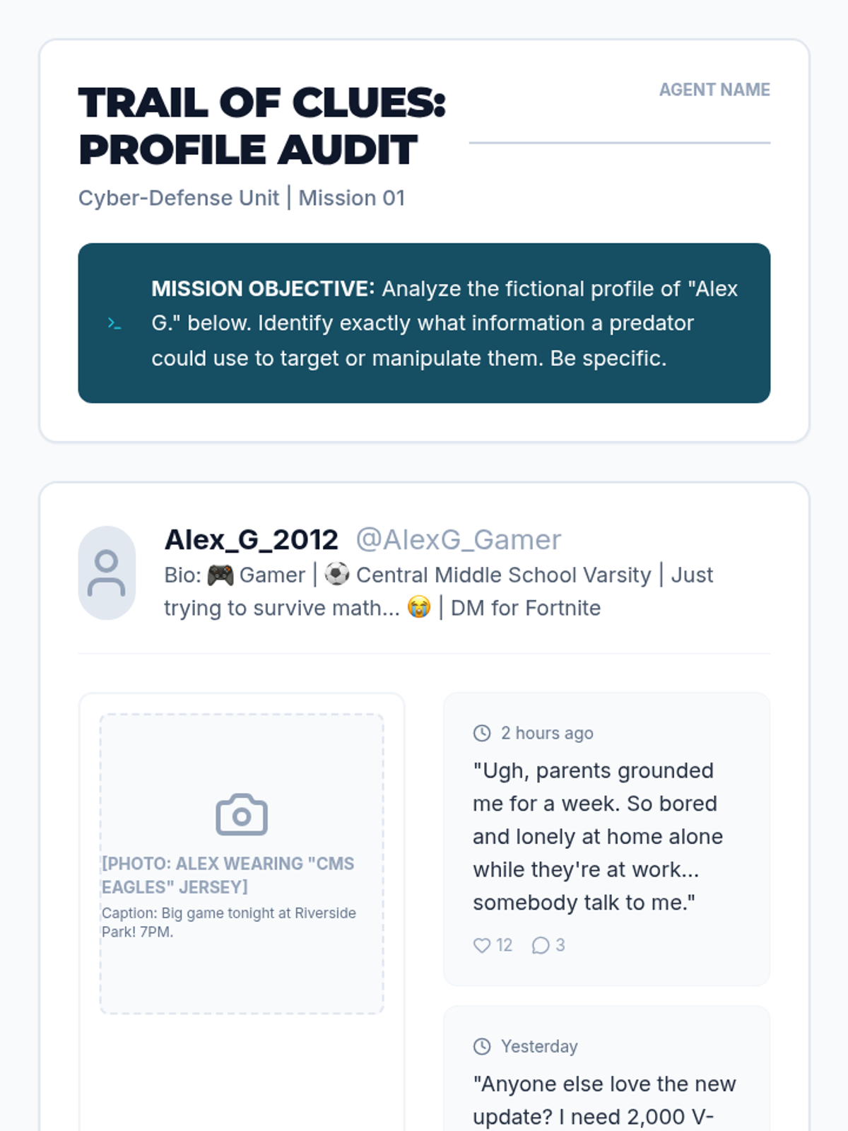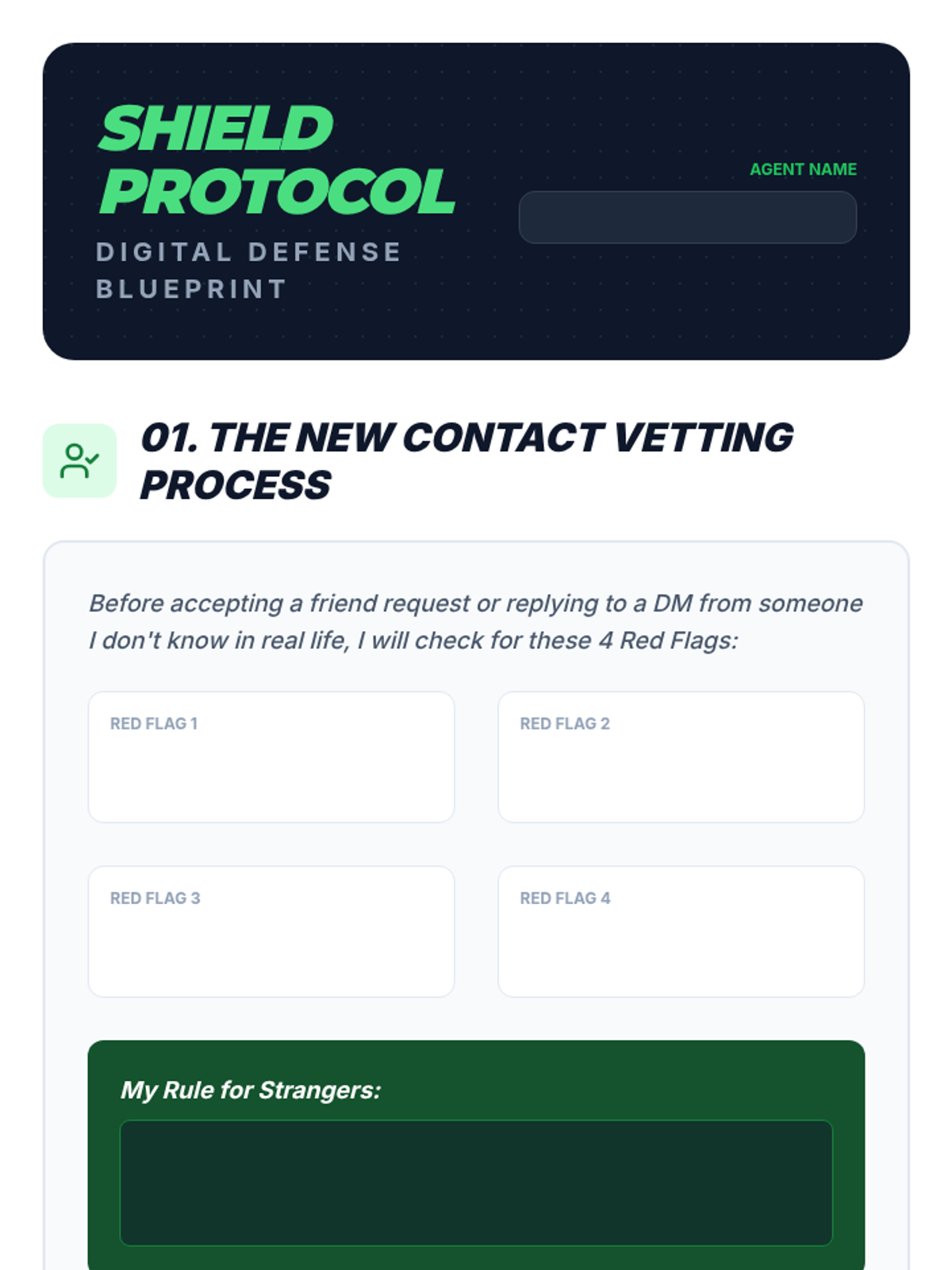 A comprehensive sequence for 7th-grade students focused on identifying and resisting online grooming and recruitment tactics used by traffickers. Students develop digital literacy skills to recognize fake profiles, manipulative lures, and unsafe gaming interactions while creating a personal digital defense protocol.