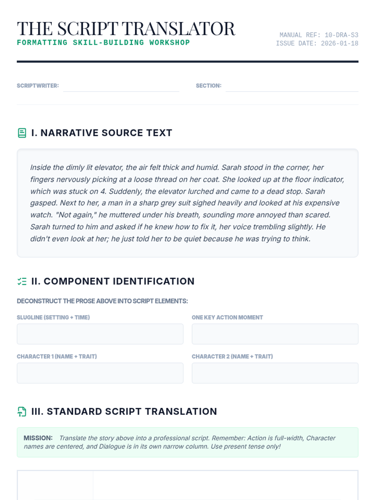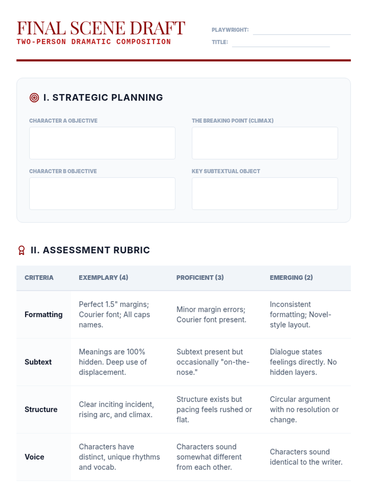 A technical foundation for playwriting, moving from critical analysis of dramatic structure and subtext to the mastery of professional industry formatting standards and scene composition.