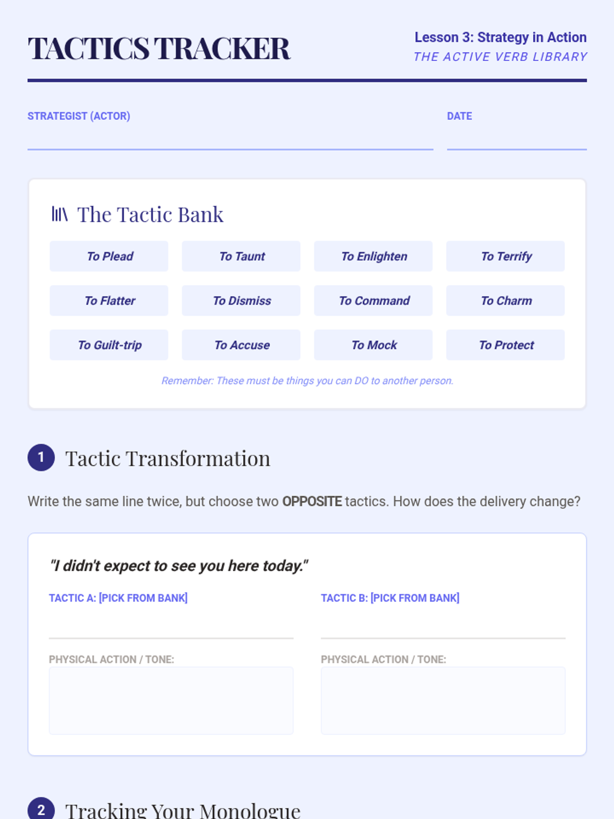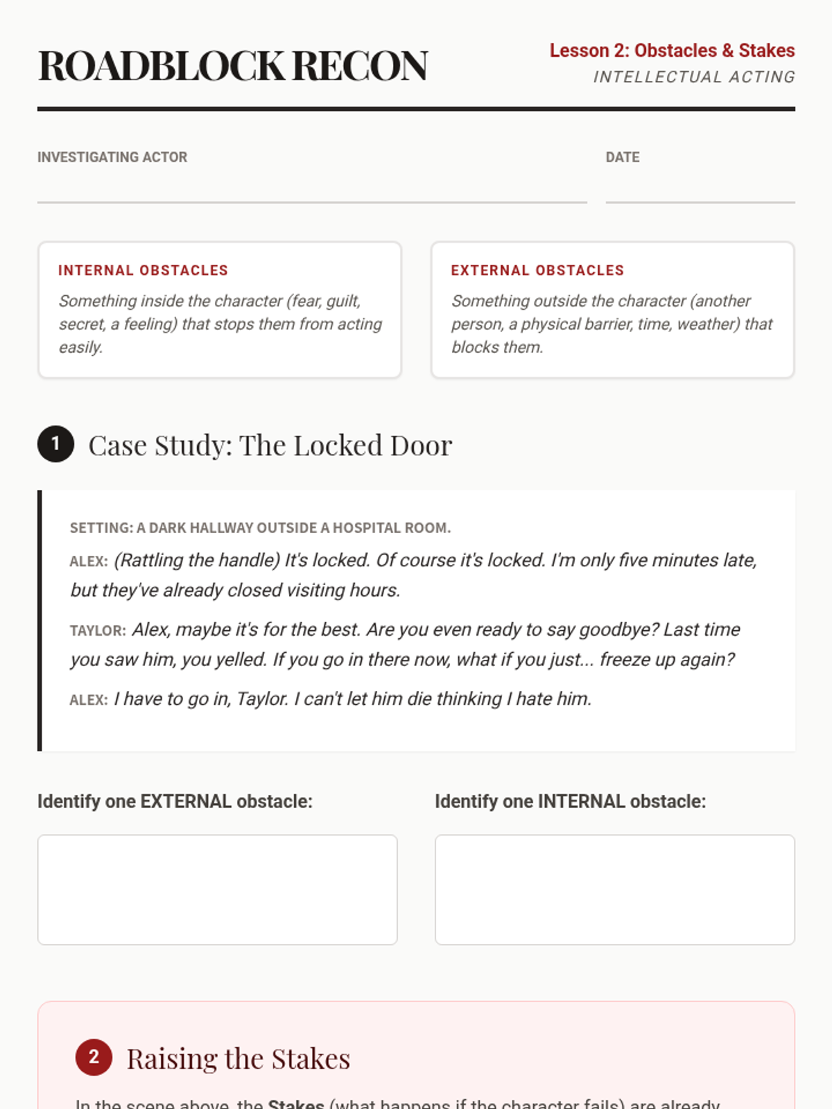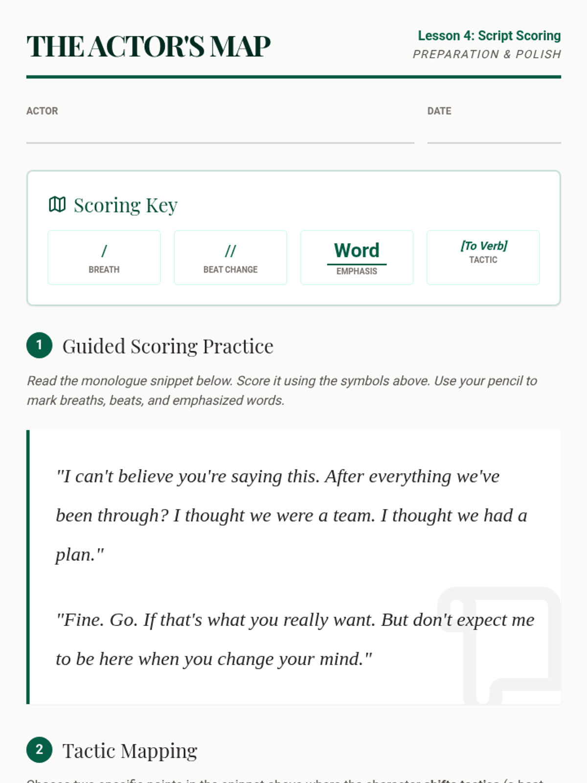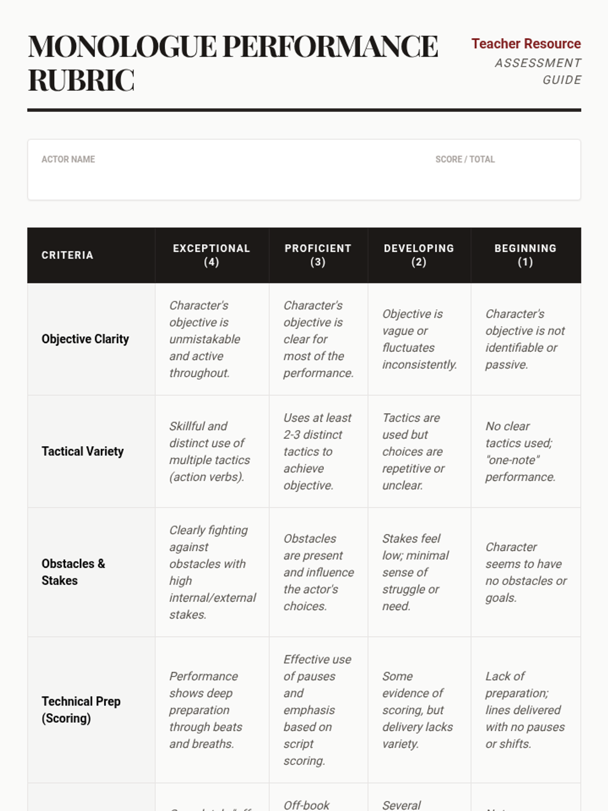 A comprehensive 8th-grade theater sequence introducing students to the Stanislavski system of acting through script analysis. Students progress from identifying character objectives and obstacles to choosing tactics and scoring a monologue for final performance.