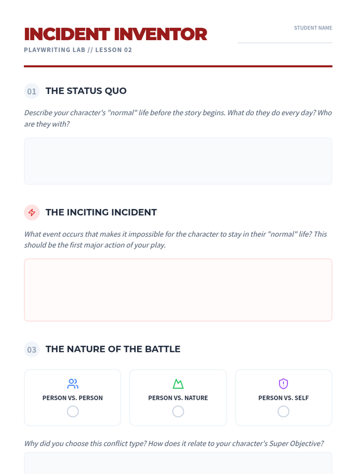 A 5-lesson unit for 6th-grade students exploring character construction and the narrative structure of stage plays, from initial concept to a professional pitch.