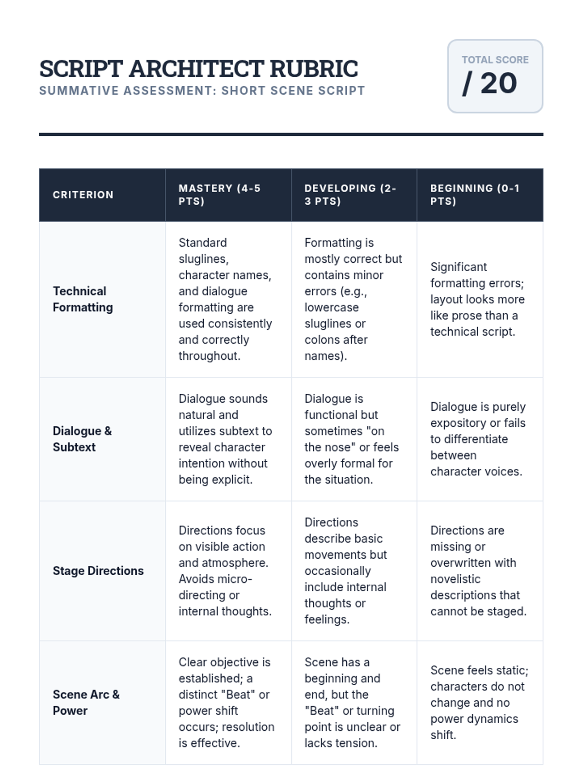 A foundational unit for 6th-grade students introducing the mechanics and creativity of playwriting. Students explore the differences between prose and drama, master character voice, learn standard script formatting, and craft original conflict-driven scenes.