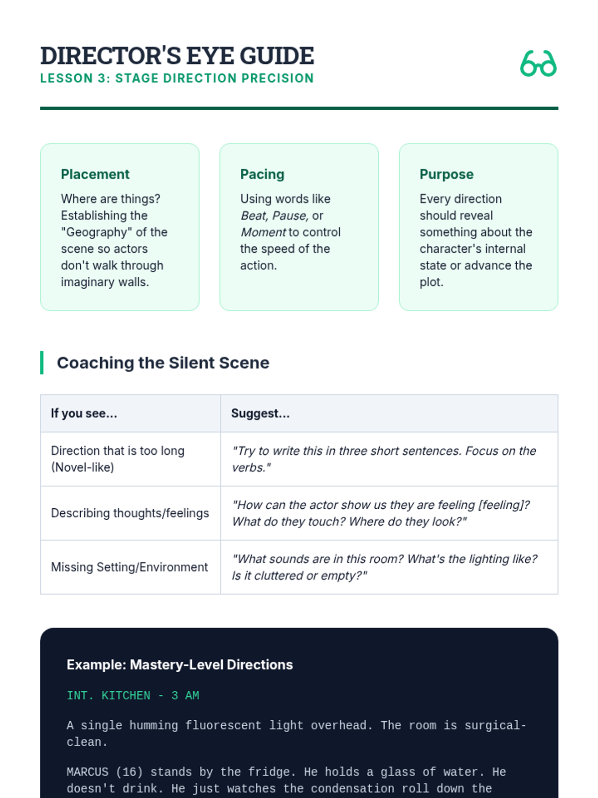 A comprehensive introduction to playwriting for 7th graders, focusing on the transition from narrative prose to technical script formatting, dialogue subtext, stage directions, and scene structure.