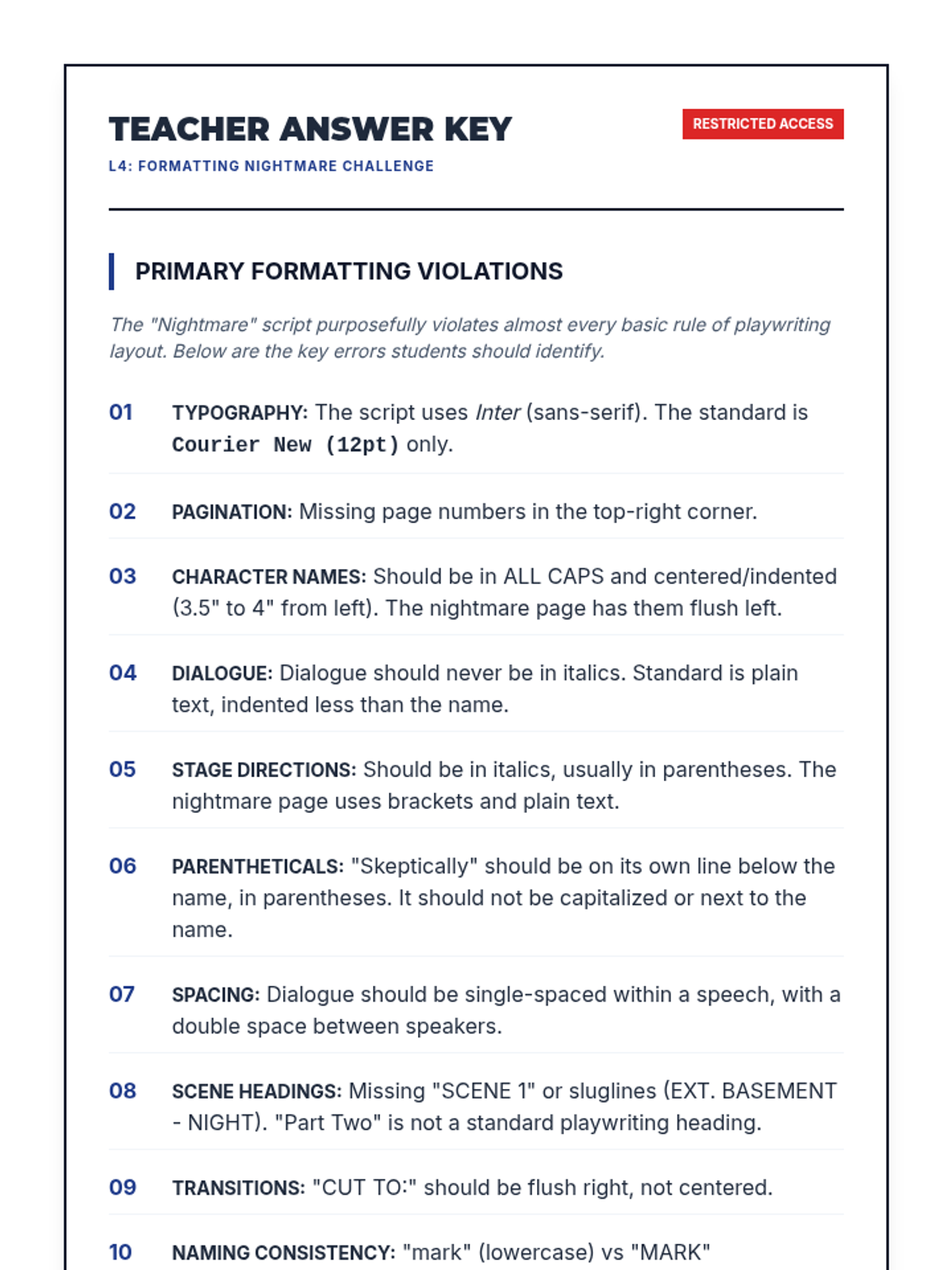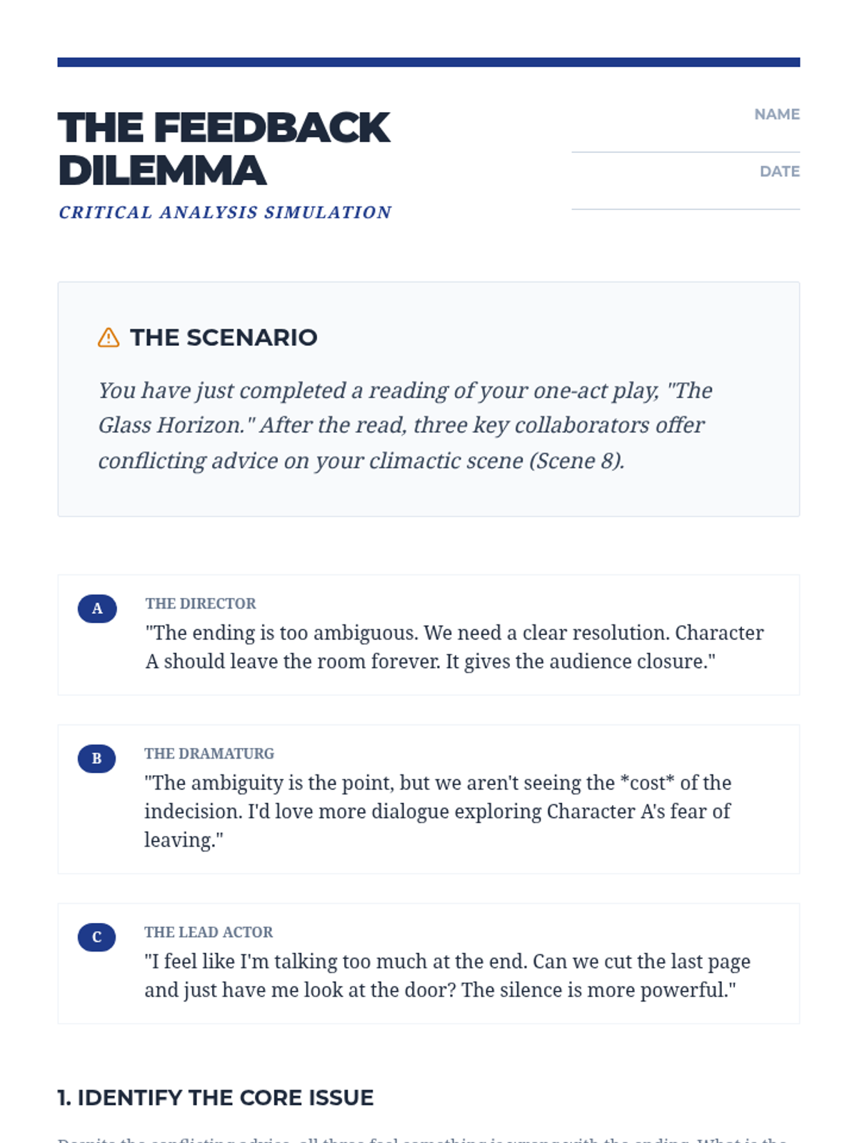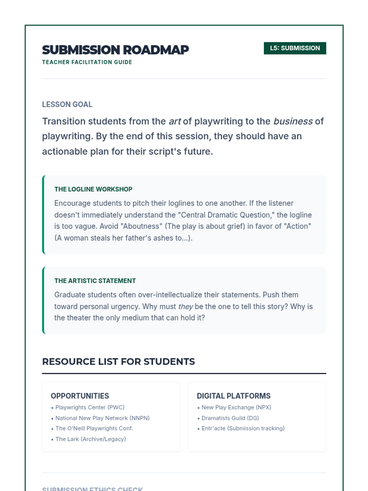 A comprehensive graduate-level course on the professional development of a new play, focusing on revision strategies, collaborative feedback, and industry-standard submission practices. Students transition from draft to a polished, professional-grade script and submission package.