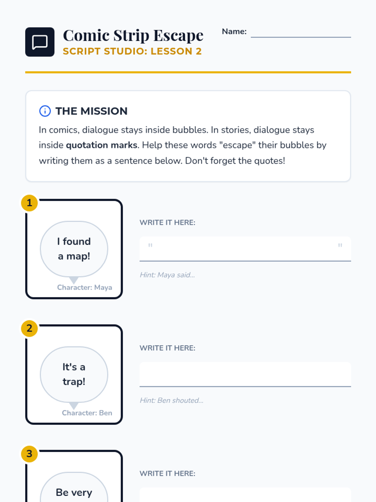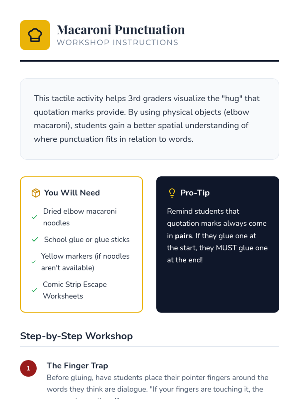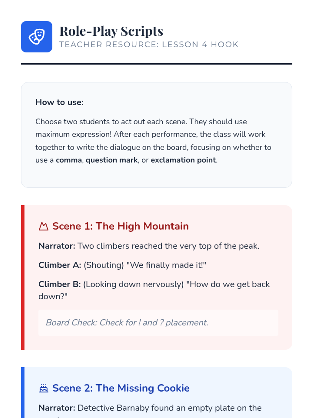 This 3rd-grade ELA sequence transforms students into 'Script Studio' editors as they master the mechanics of punctuating dialogue. Through inquiry, hands-on 'macaroni' workshops, and creative writing prompts, students learn to distinguish narration from speech and correctly place quotation marks, commas, and terminal punctuation in character dialogue.