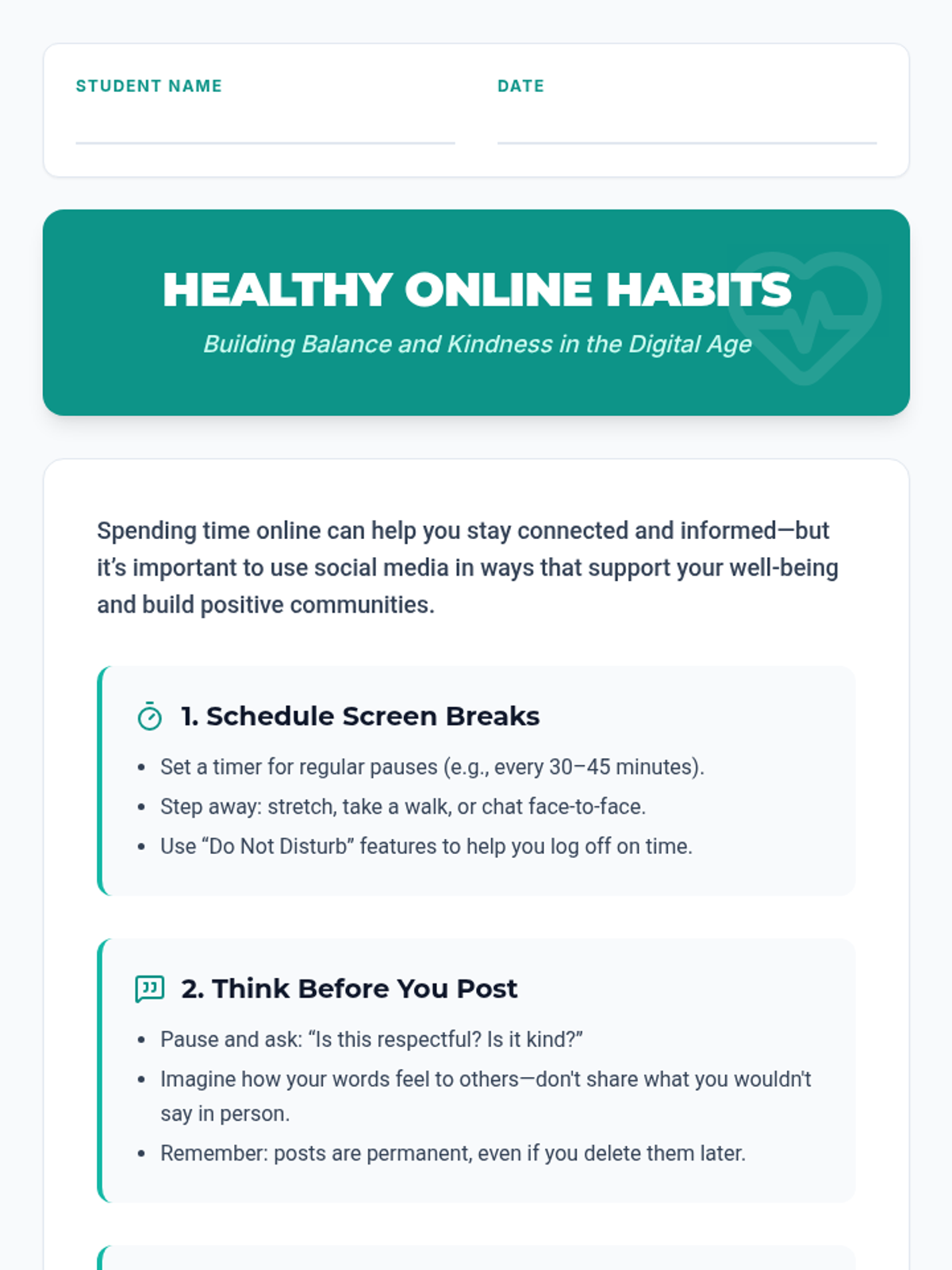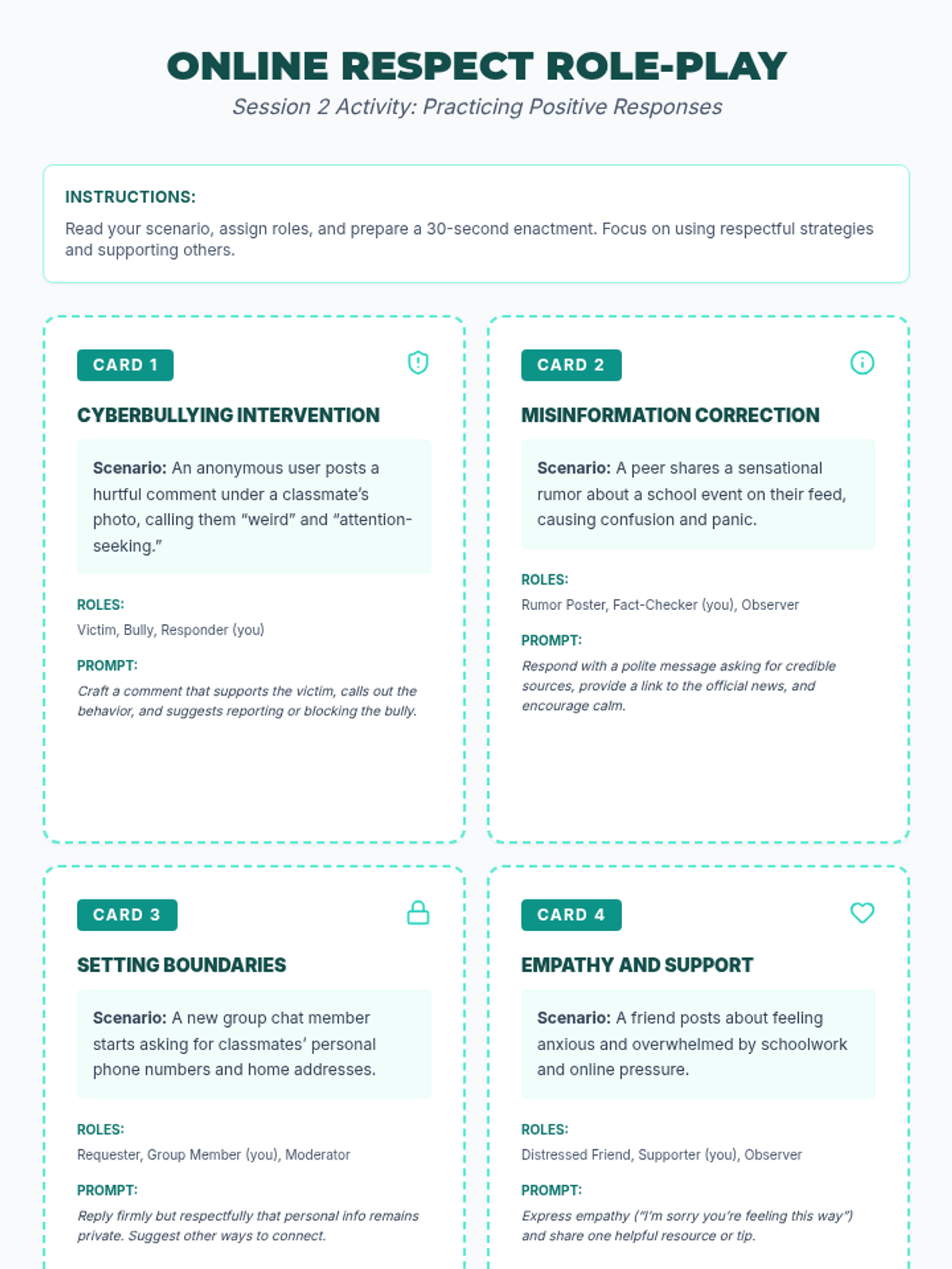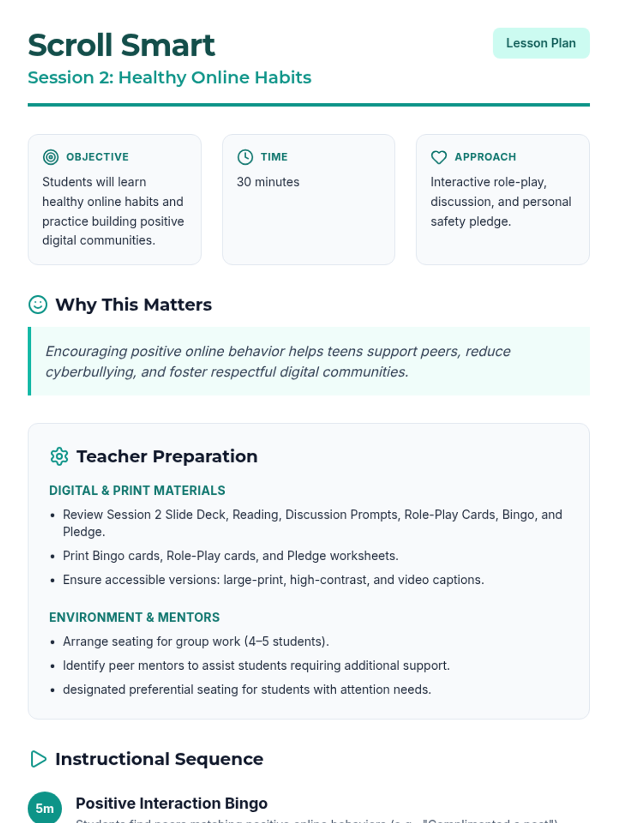A two-session lesson sequence for high school students focused on recognizing social media risks, protecting privacy, and fostering positive digital communities through interactive games, scenarios, and reflections.