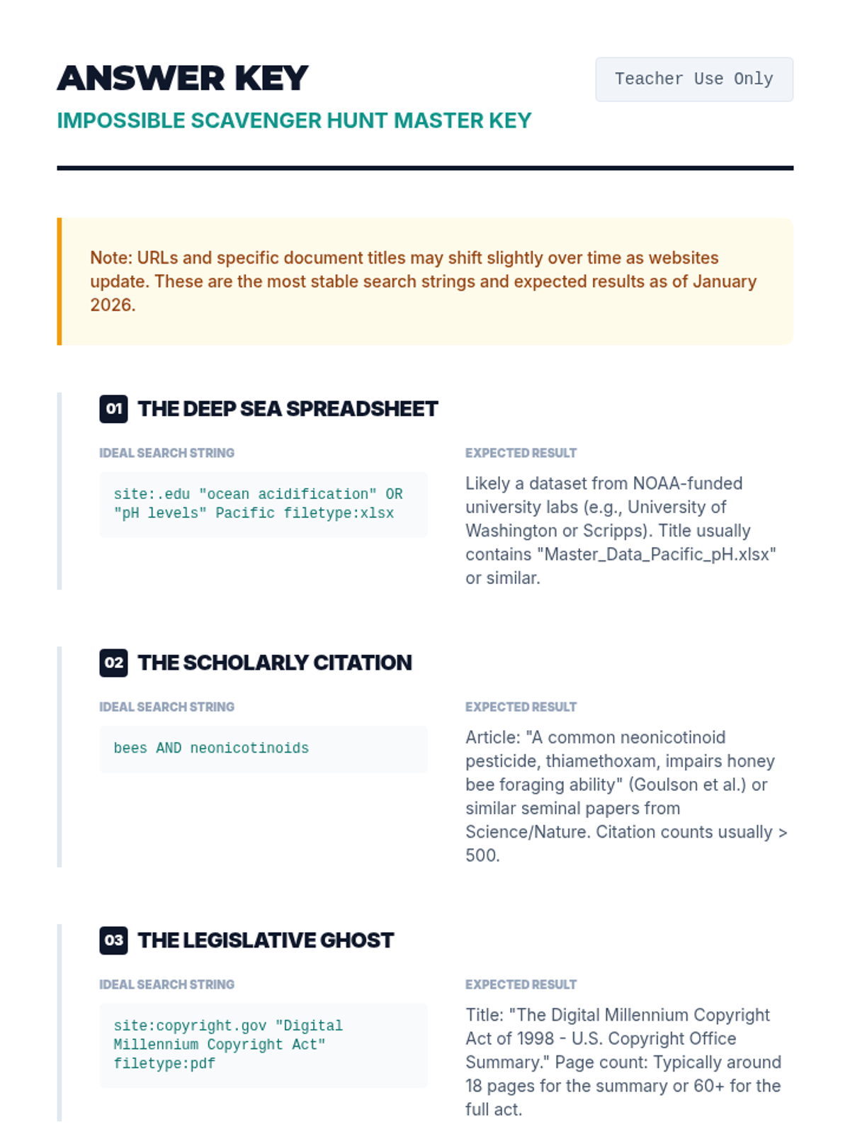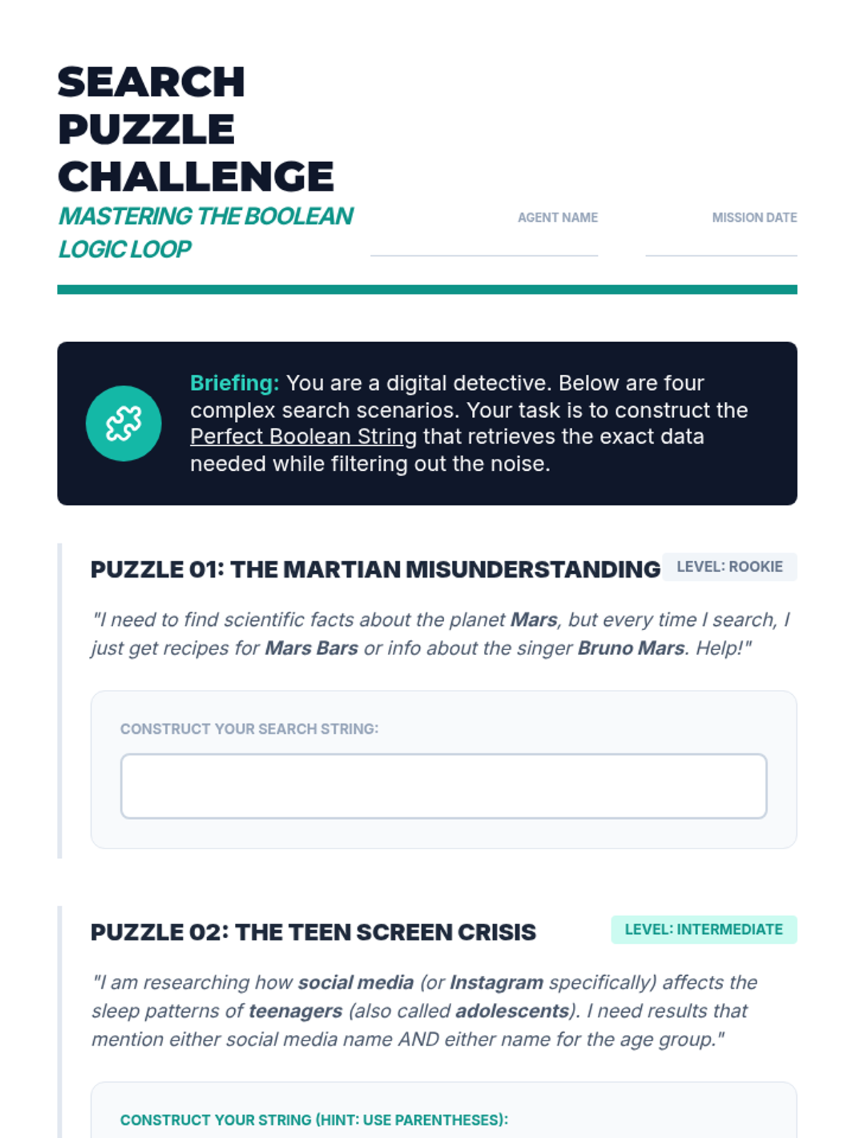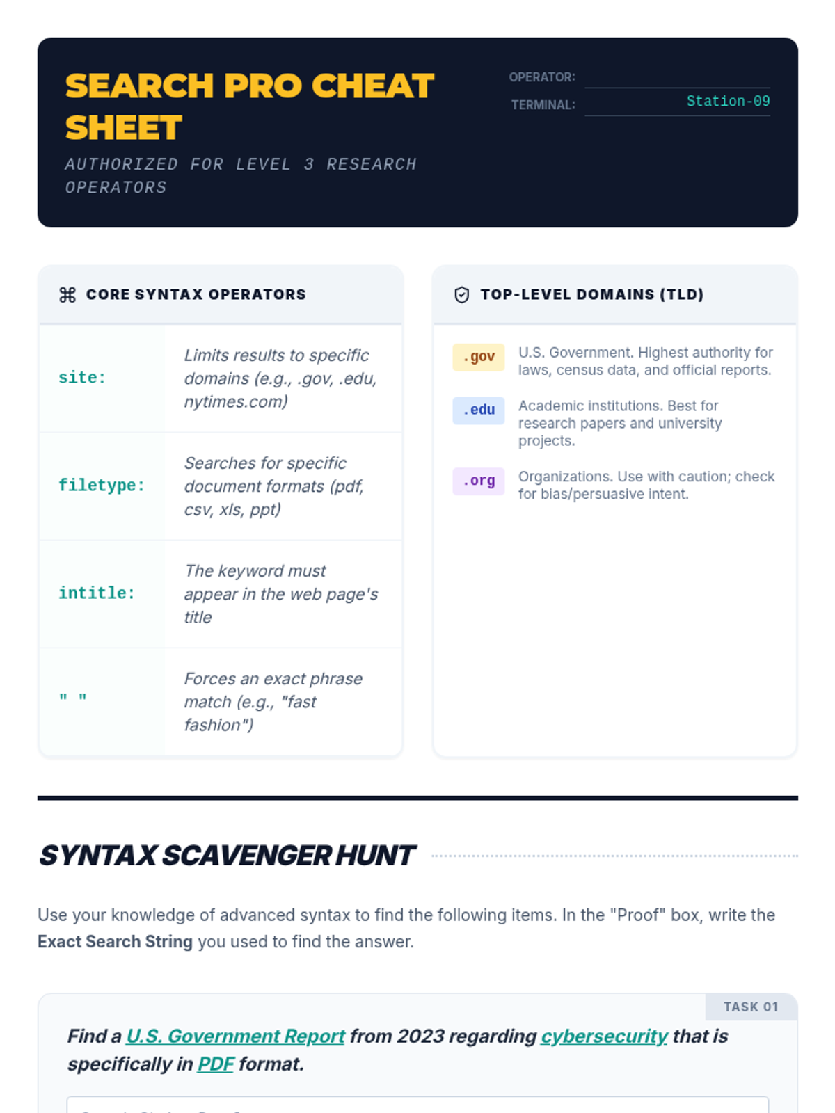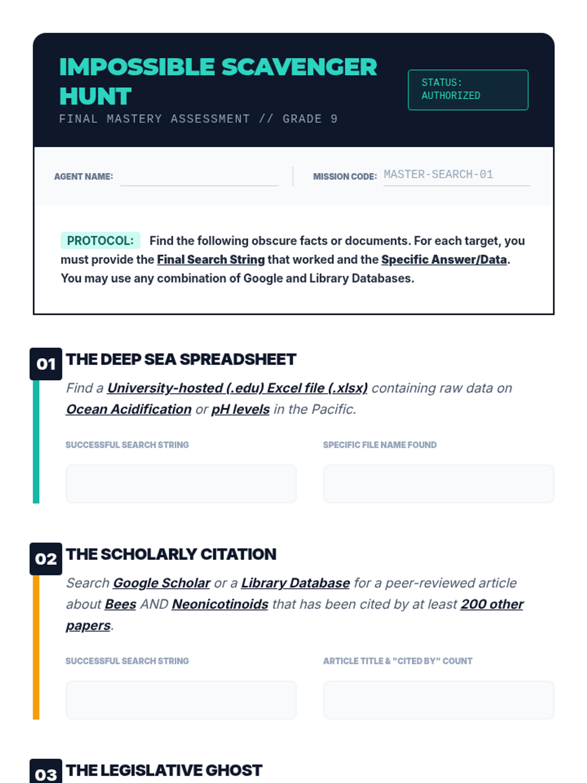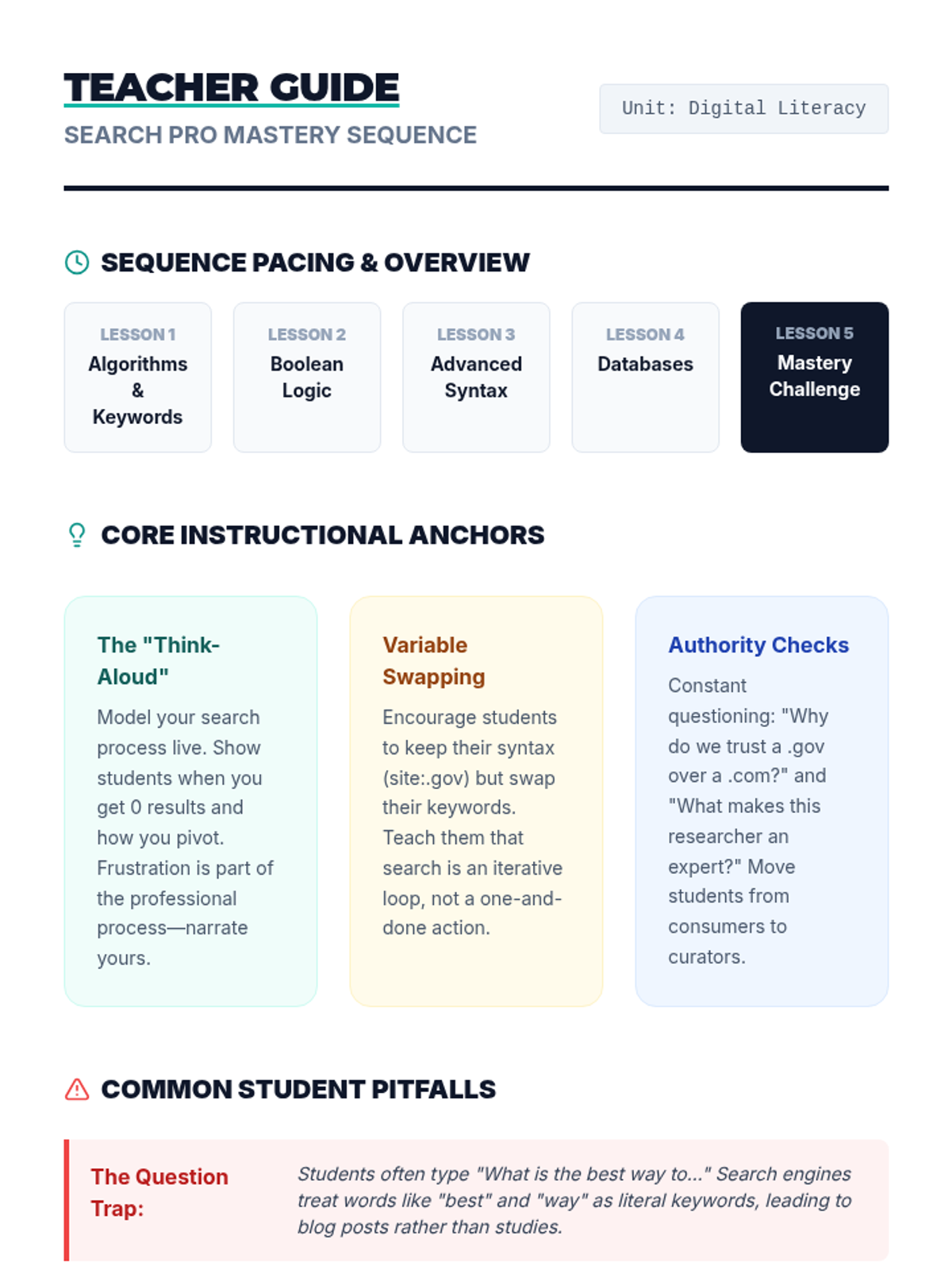 This sequence equips 9th-grade students with professional information retrieval skills, moving from basic keyword searches to complex Boolean logic, advanced search syntax, and academic database navigation. Students will learn to manipulate search algorithms and document their research process to locate high-quality, obscure information efficiently.