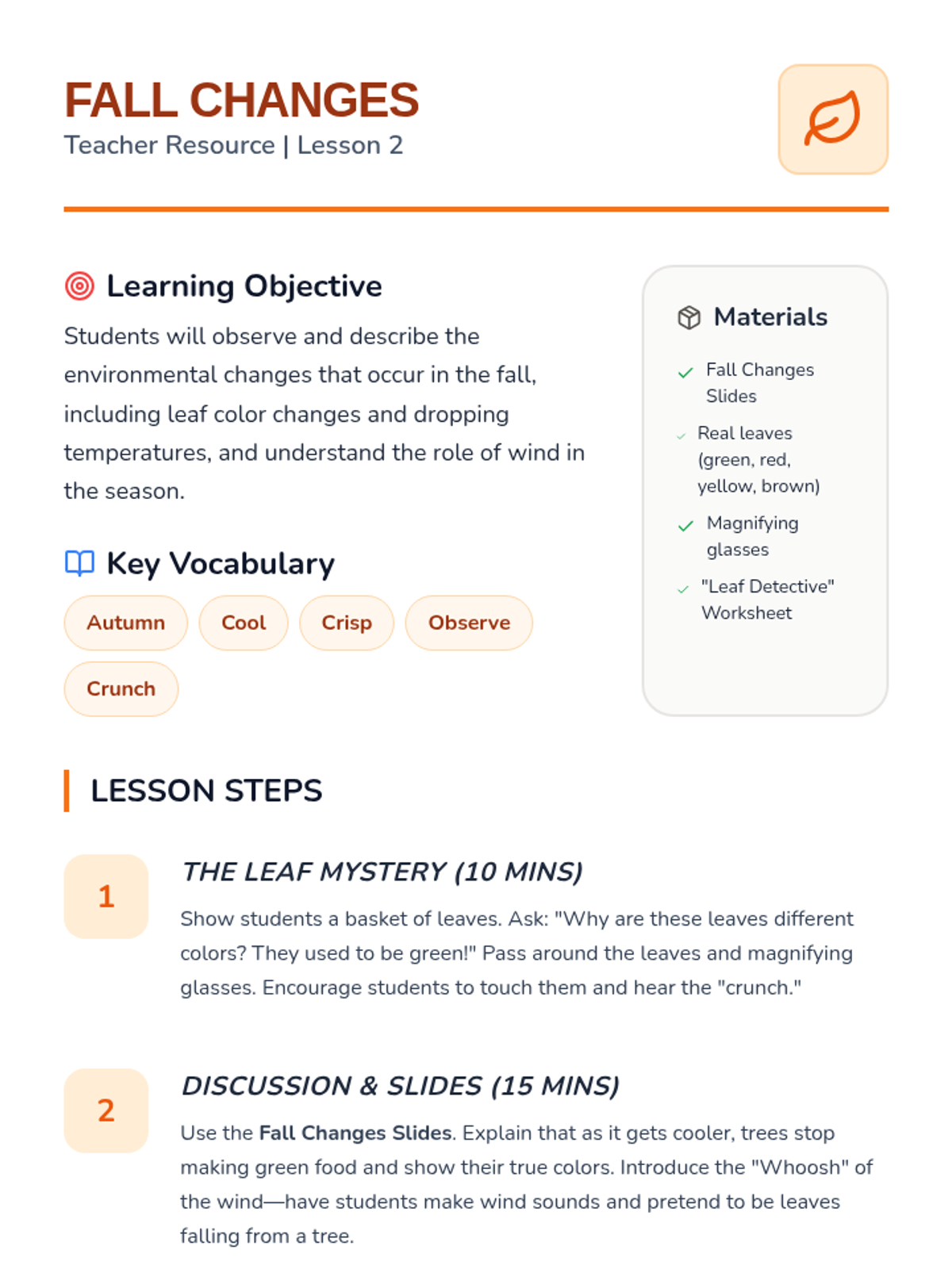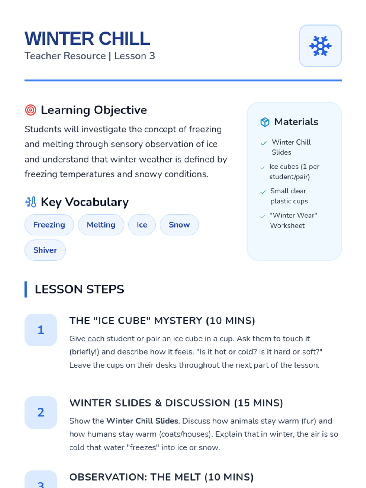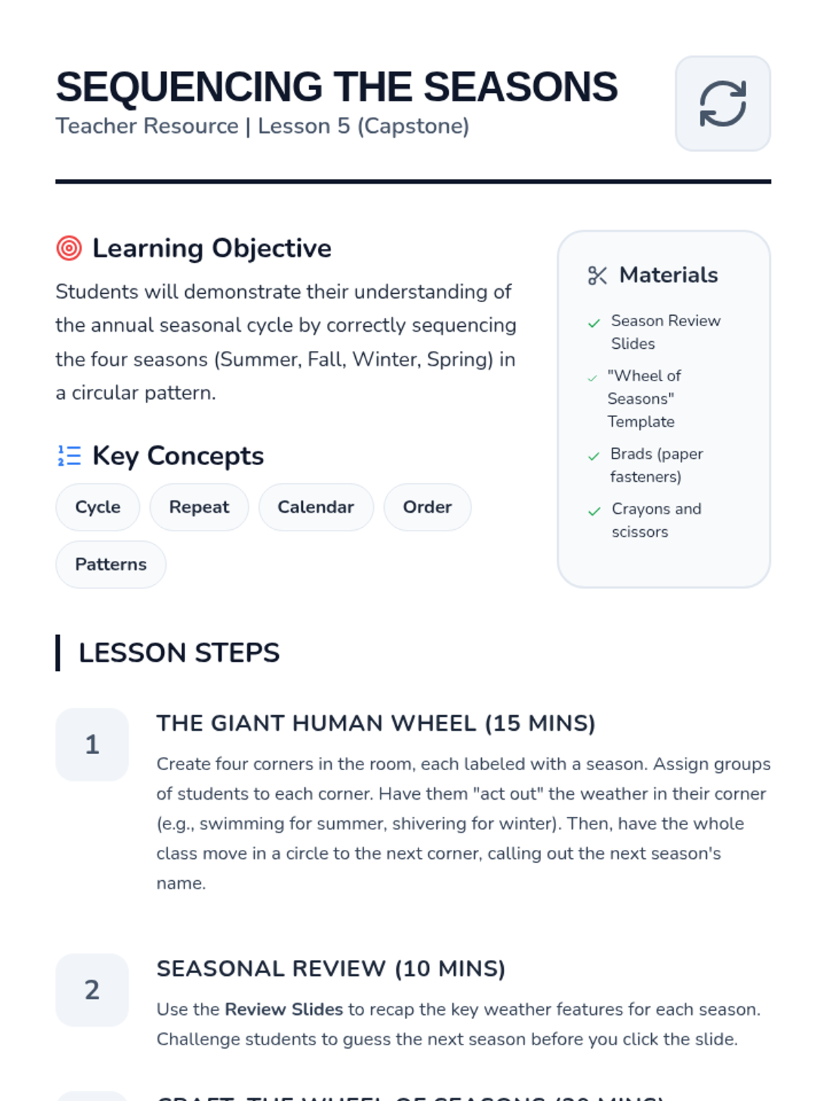 This sequence explores the four seasons through weather patterns, environmental changes, and human adaptations. Kindergarten students will learn to identify characteristics of each season and understand the repeating nature of the annual cycle.