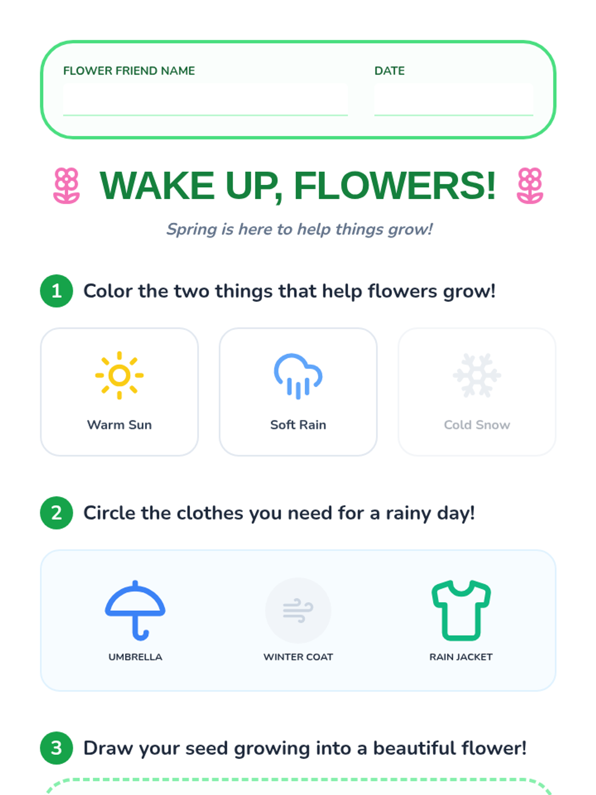 A 4-day introduction to weather types and appropriate clothing choices for preschool and kindergarten students. Students explore hot, cold, rainy, and warm/sunny conditions through visual slides, hands-on sorting activities, and creative worksheets.