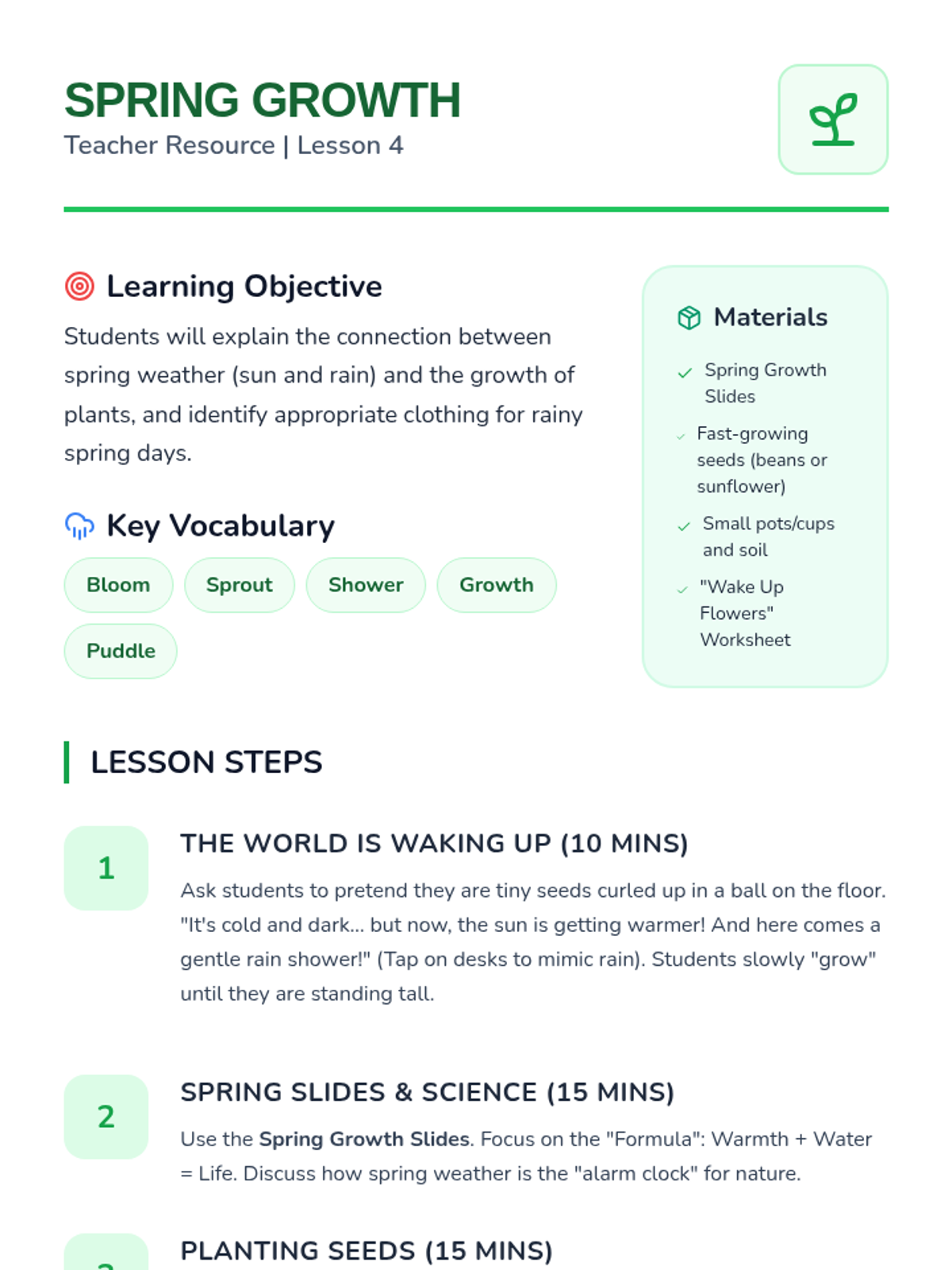 A four-day introductory unit on the signs of spring, focusing on weather changes and nature's awakening. Includes a mix of outdoor exploration and indoor hands-on crafts designed for grades K-3.