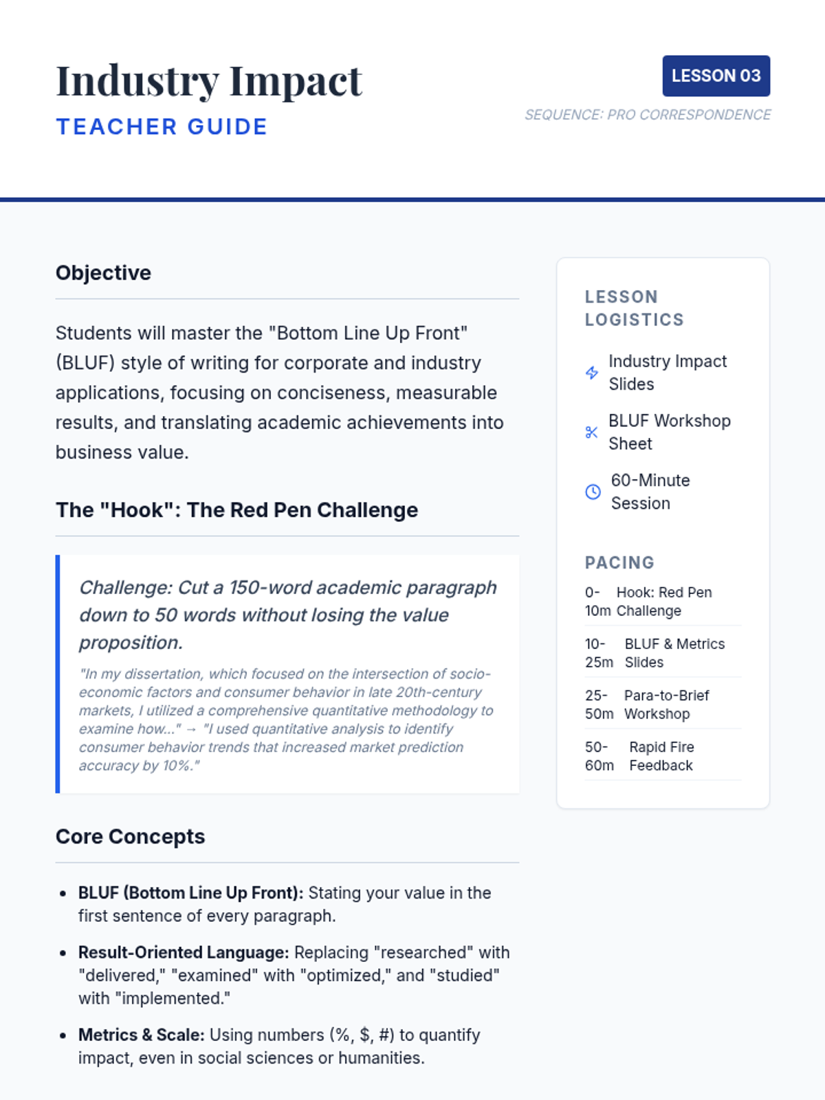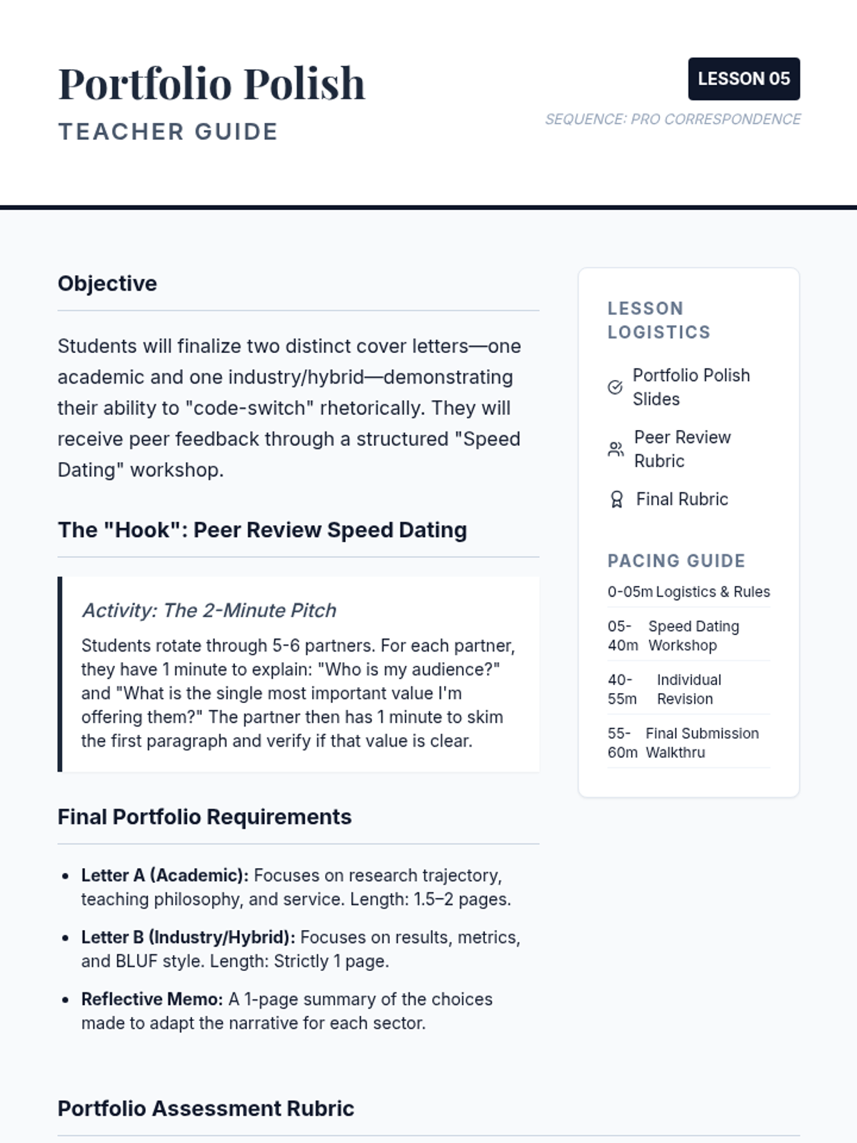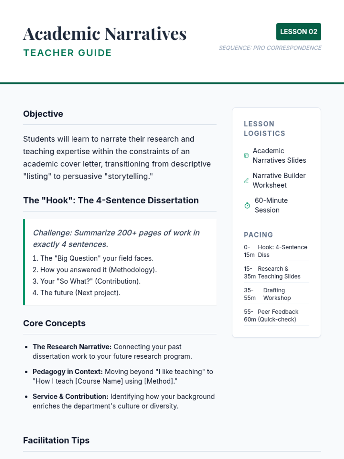 A comprehensive sequence for graduate students to master the distinct conventions of academic and industry cover letters, focusing on genre analysis, narrative construction, and sector-specific adaptation.