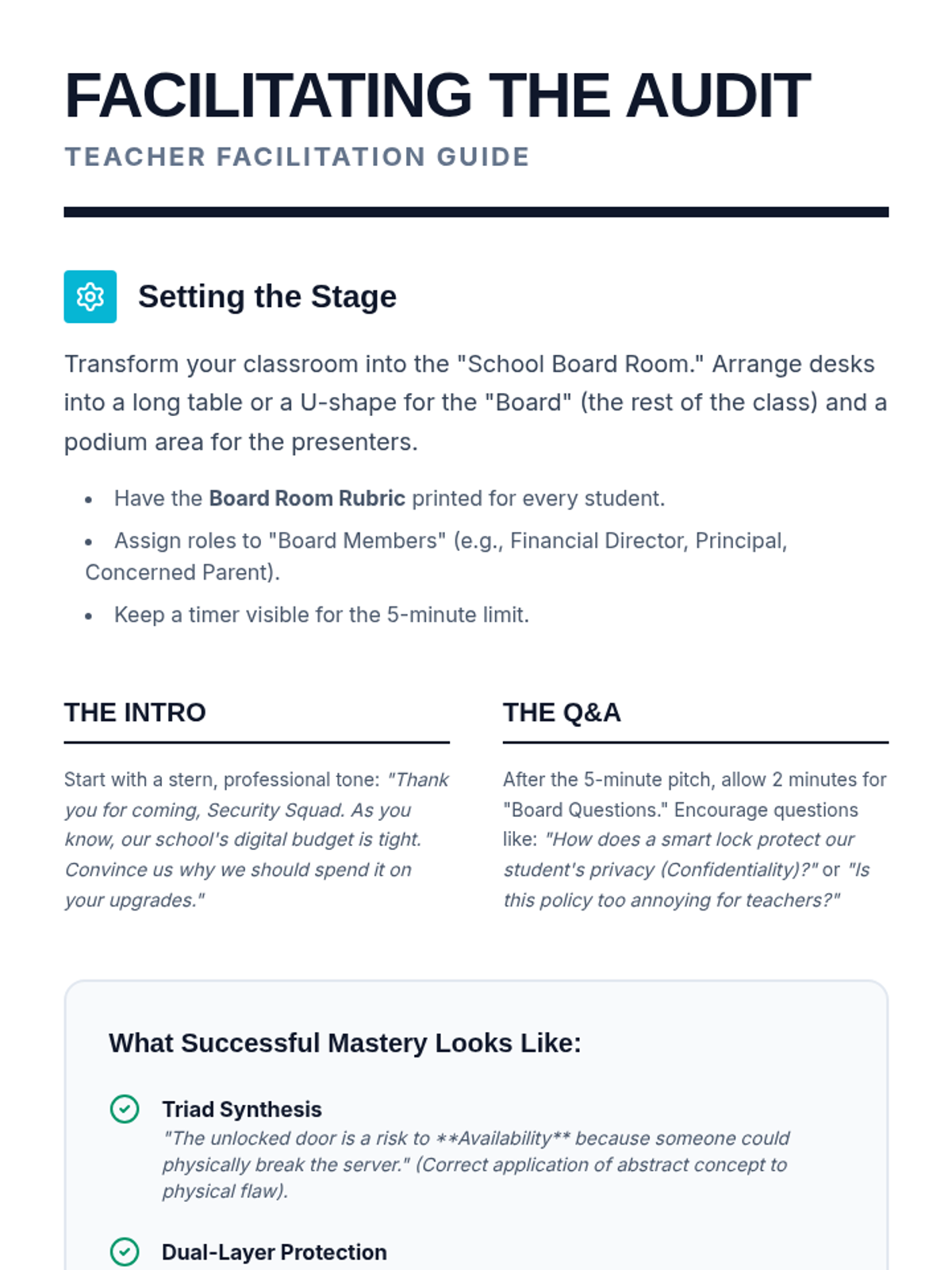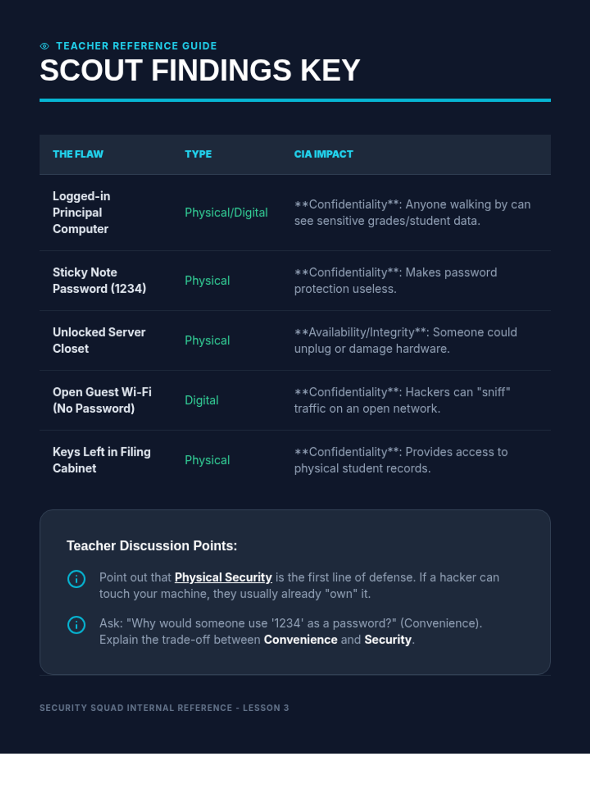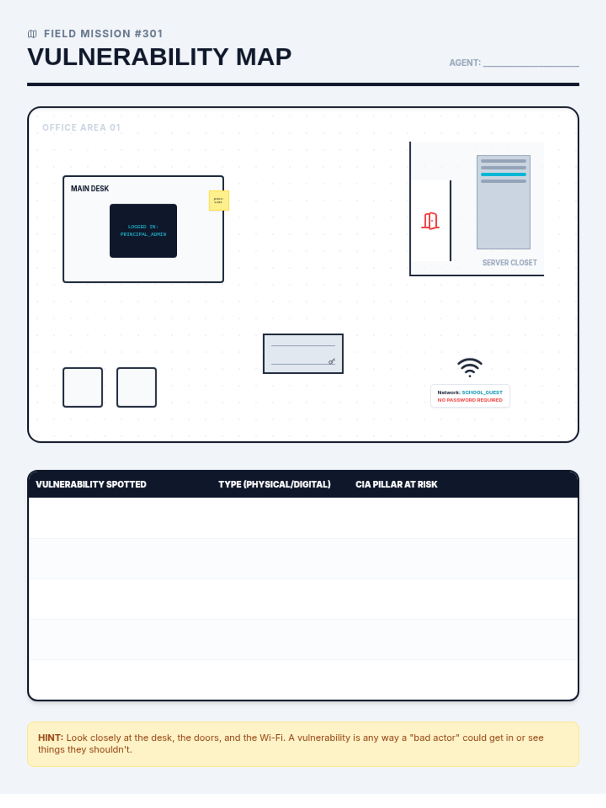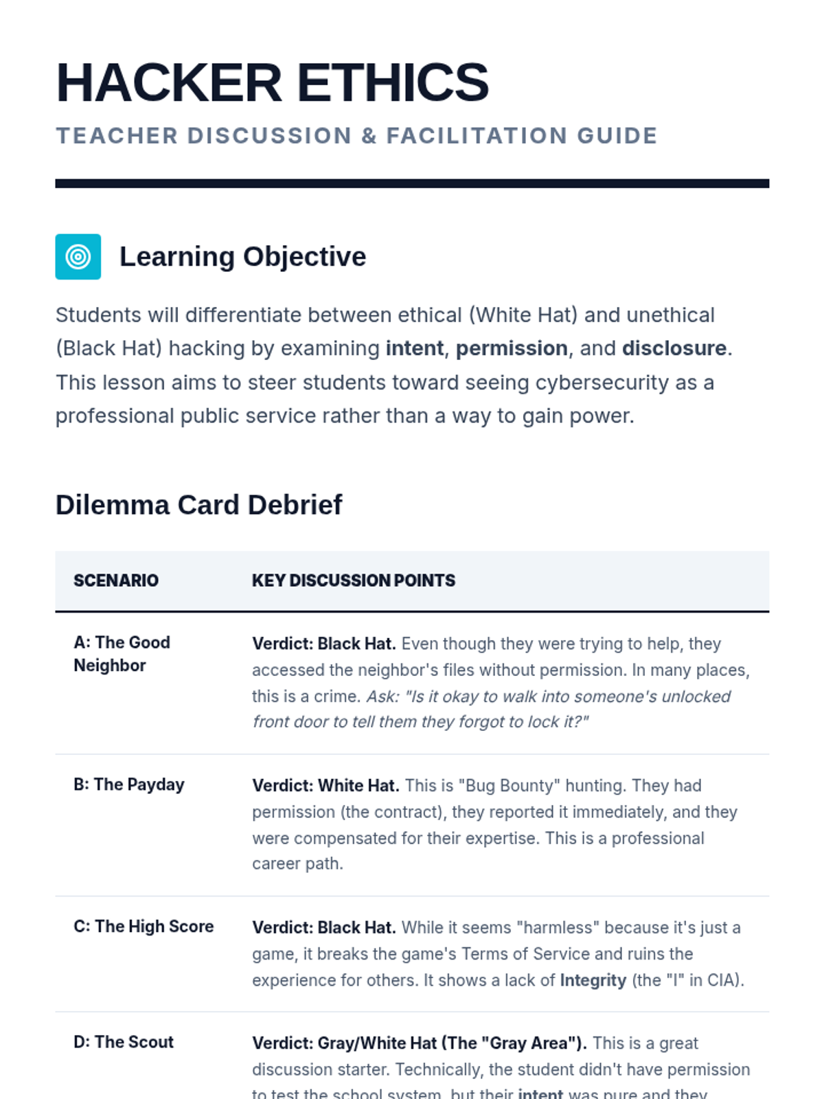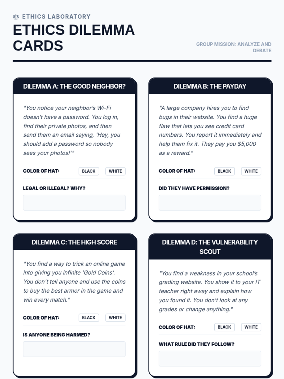 This mastery-based sequence introduces 6th-grade students to cybersecurity through the CIA Triad (Confidentiality, Integrity, Availability). Students adopt the 'White Hat' hacker mindset to identify vulnerabilities and propose ethical solutions in a simulated security audit.