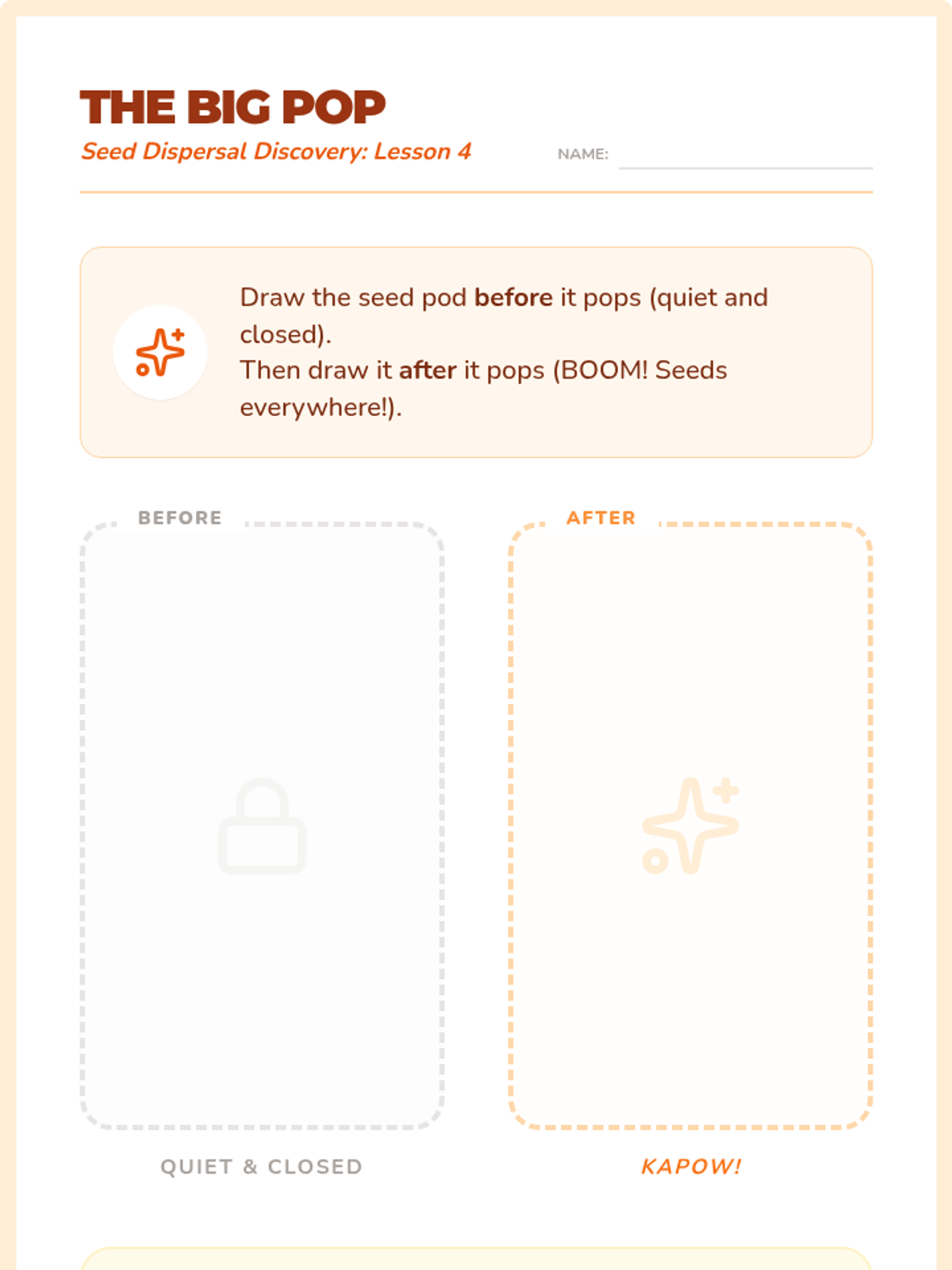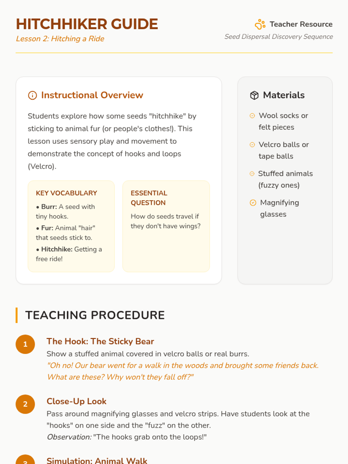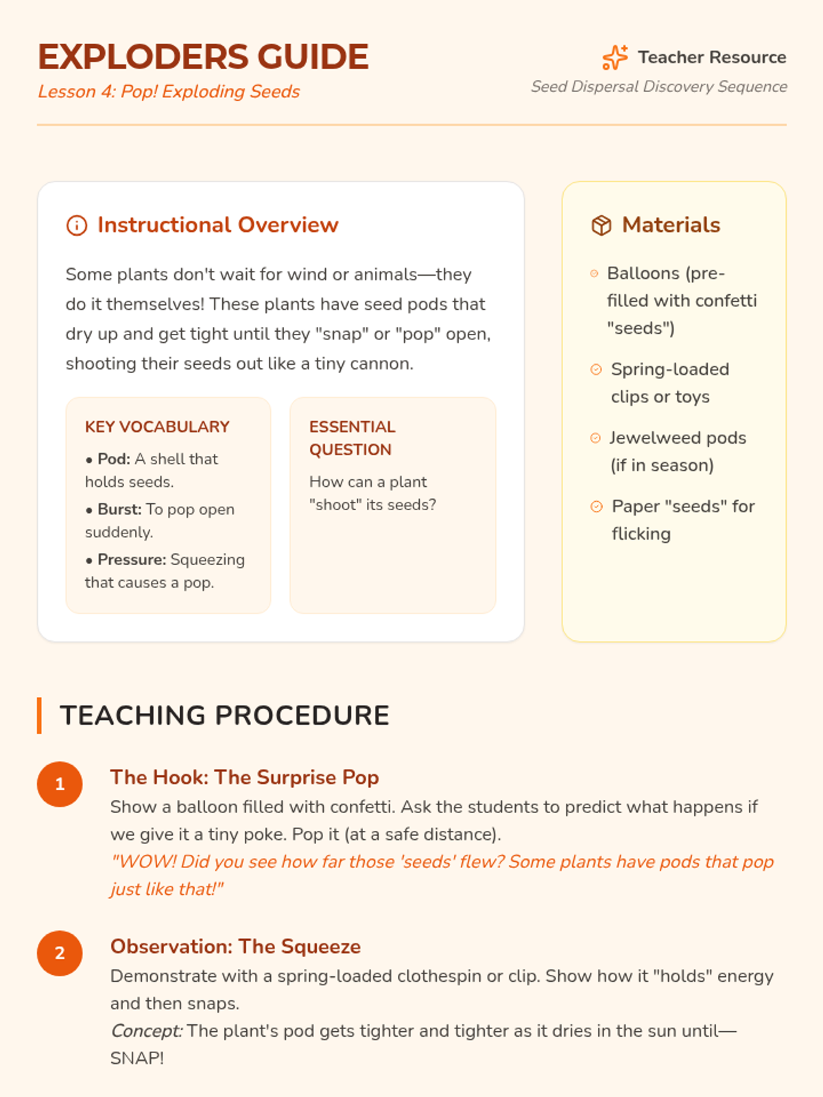 An active, movement-oriented sequence for Pre-K students exploring how plants use wind, water, animals, and 'explosions' to move their seeds. Students engage in gross motor play and nature exploration to understand seed dispersal.